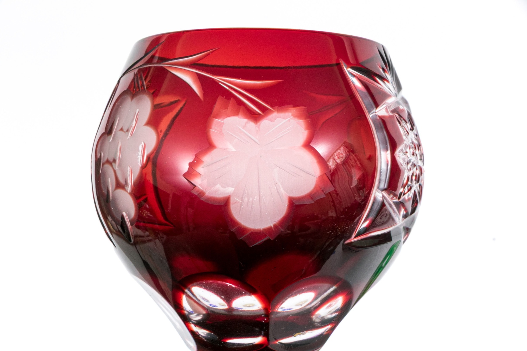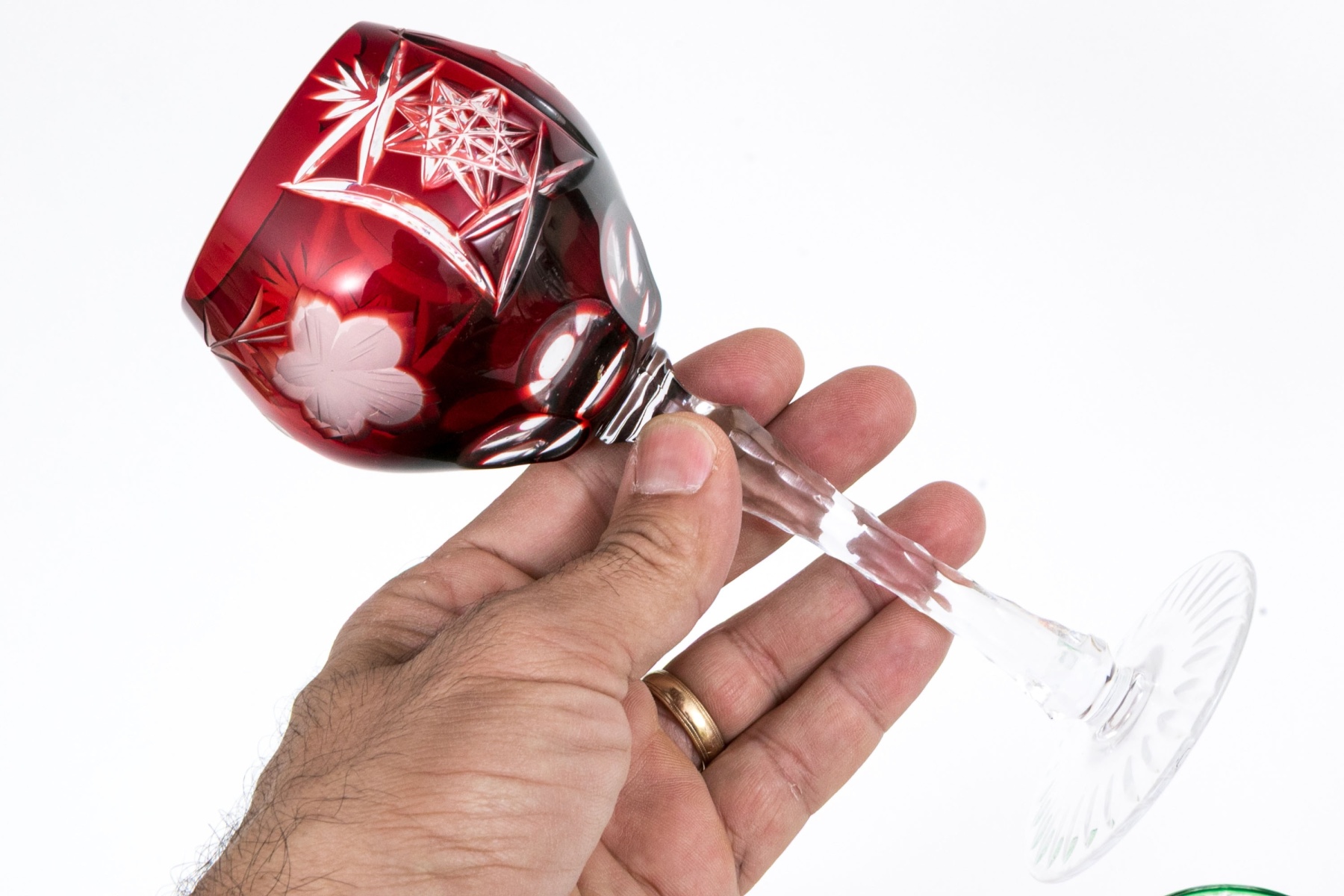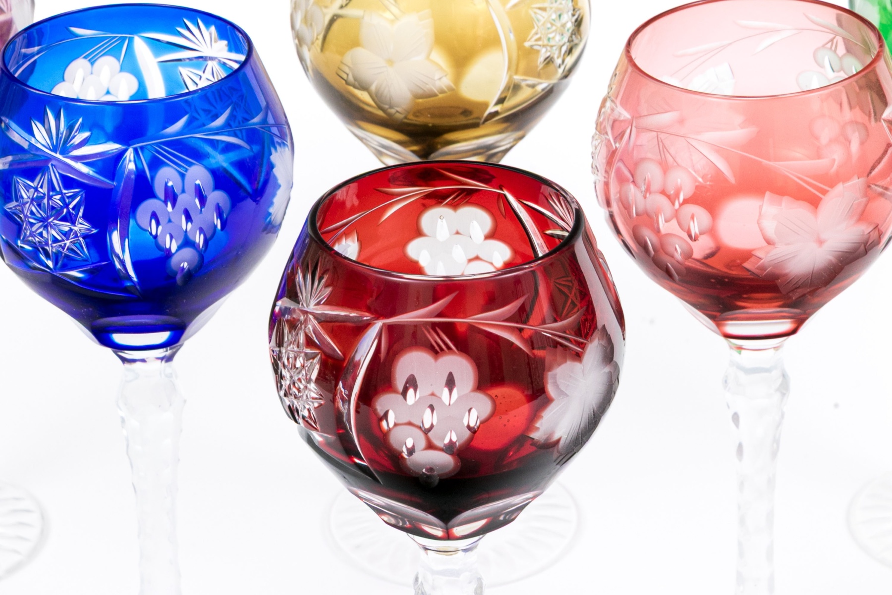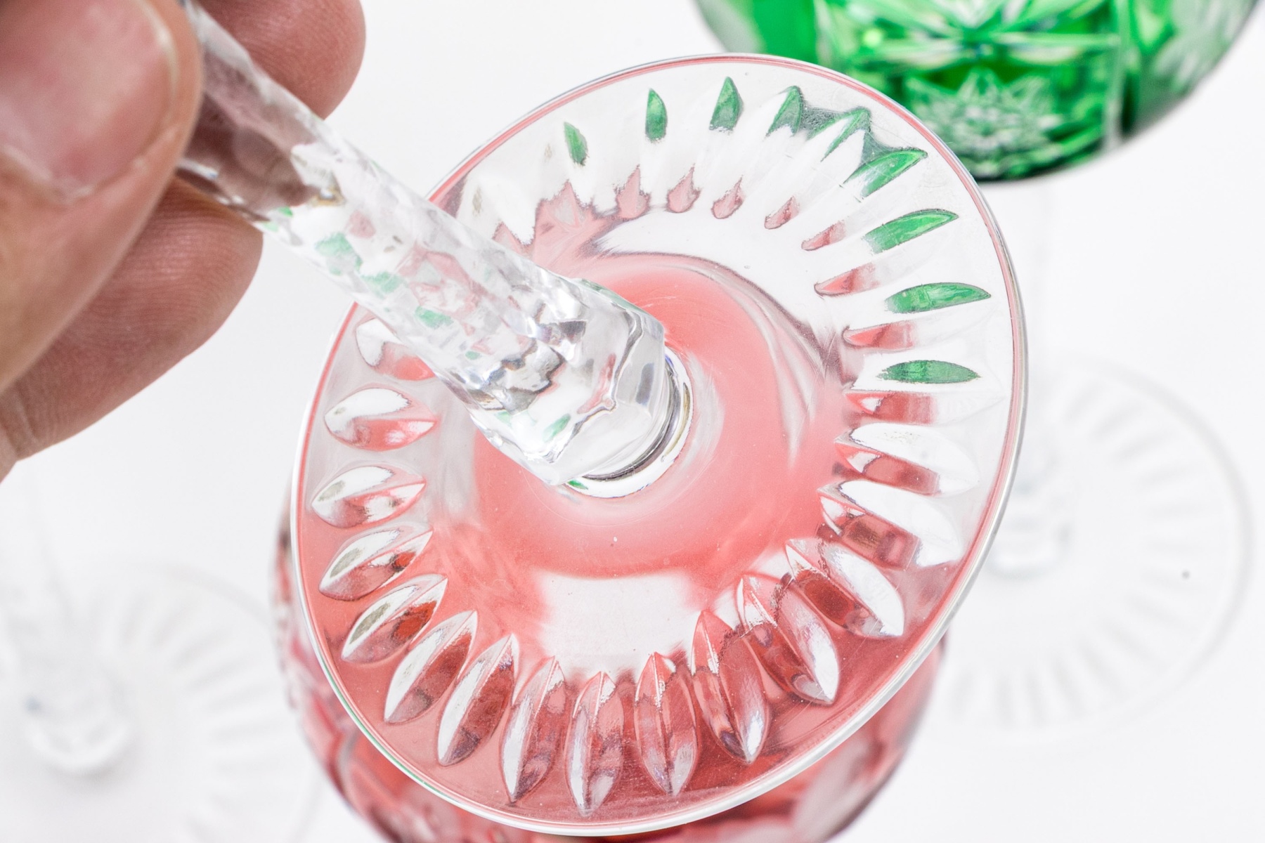 A gorgeous set of six Bohemian style crystal goblets, each with differing colorful hues cut to clear, all with decoration of florals and grape clusters to the bowls, and all stand on elegant translucent stems and foot rings. With colorful casings cut to clear and wonderful optical designs to the stems leading down to circular foot rings.