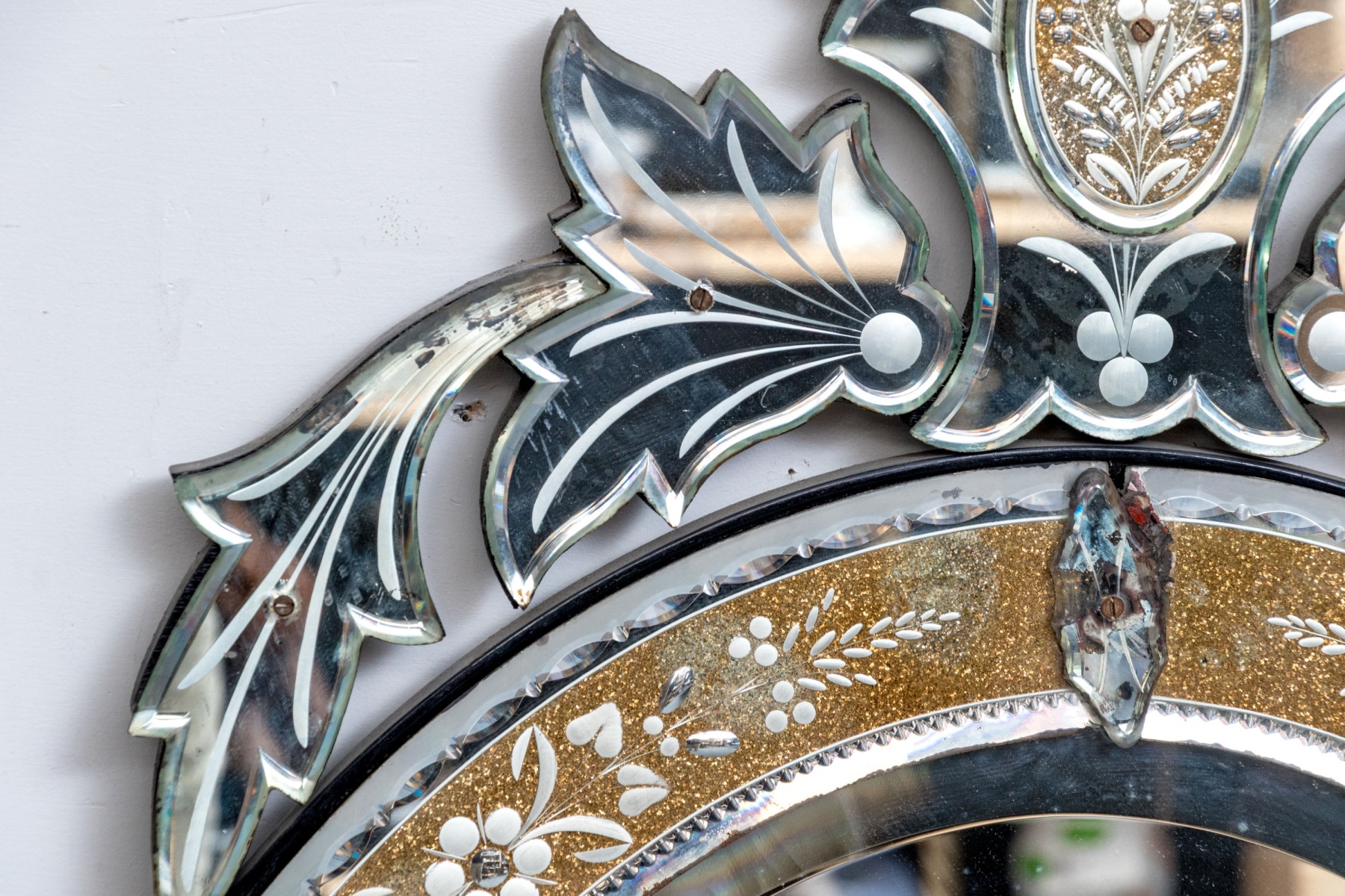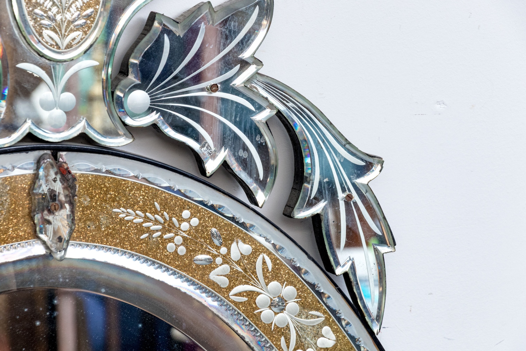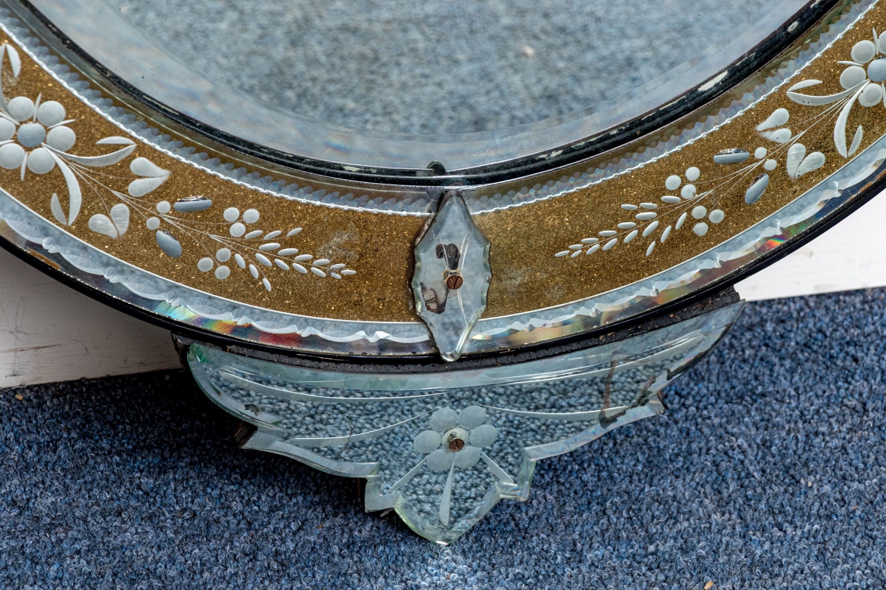 Oval with gilt speckled and etched foliate motif to the border trim with shaped oval plaques around. The mirror with shaped terminal and foliate form shaped capital.