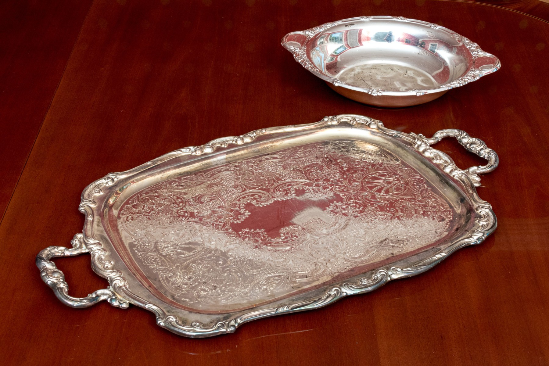 A great decorative lot of high end items including a Gorham brass two handled etched decorated serving tray, together with a silverplated twin handled serving bowl.