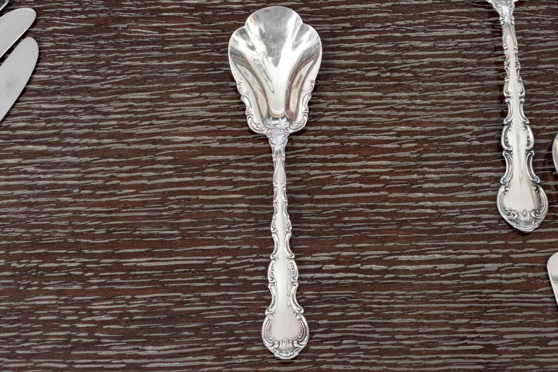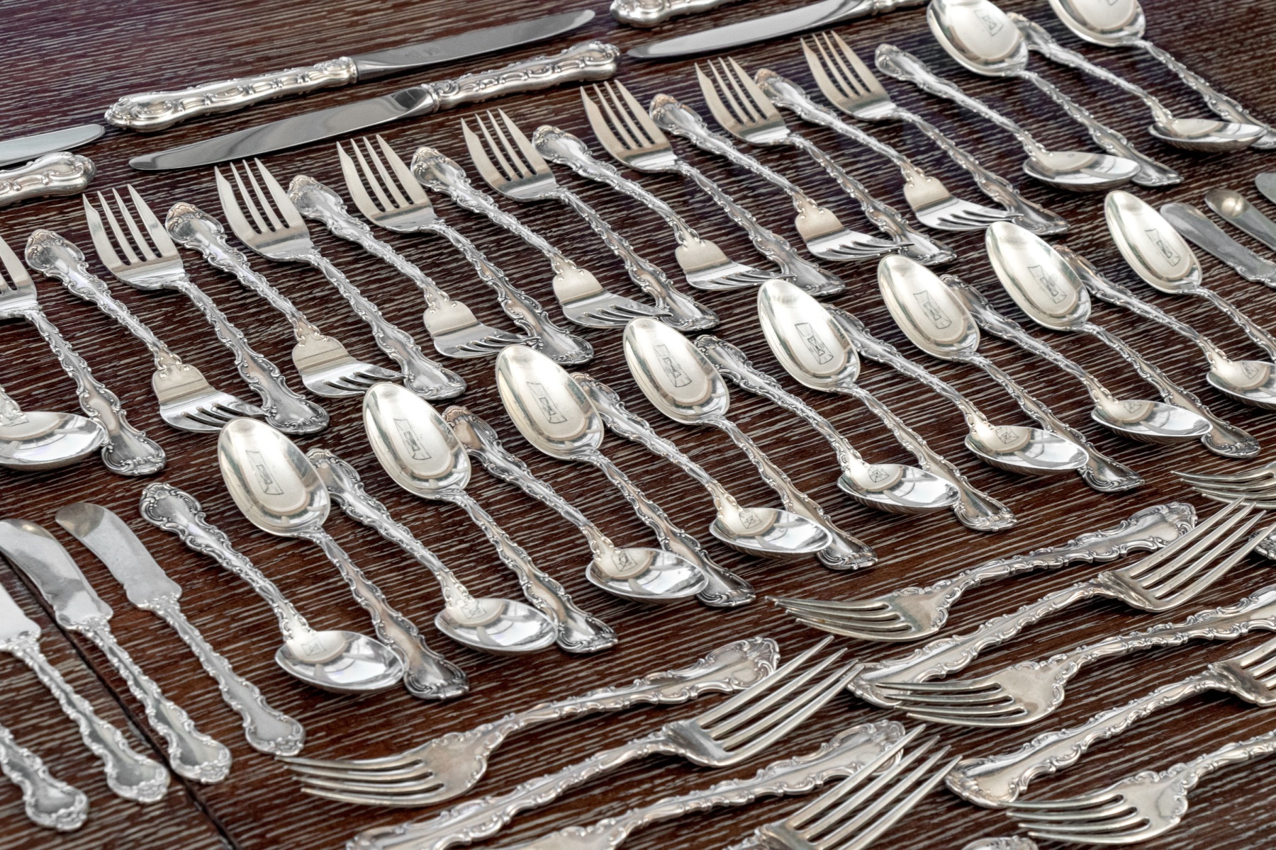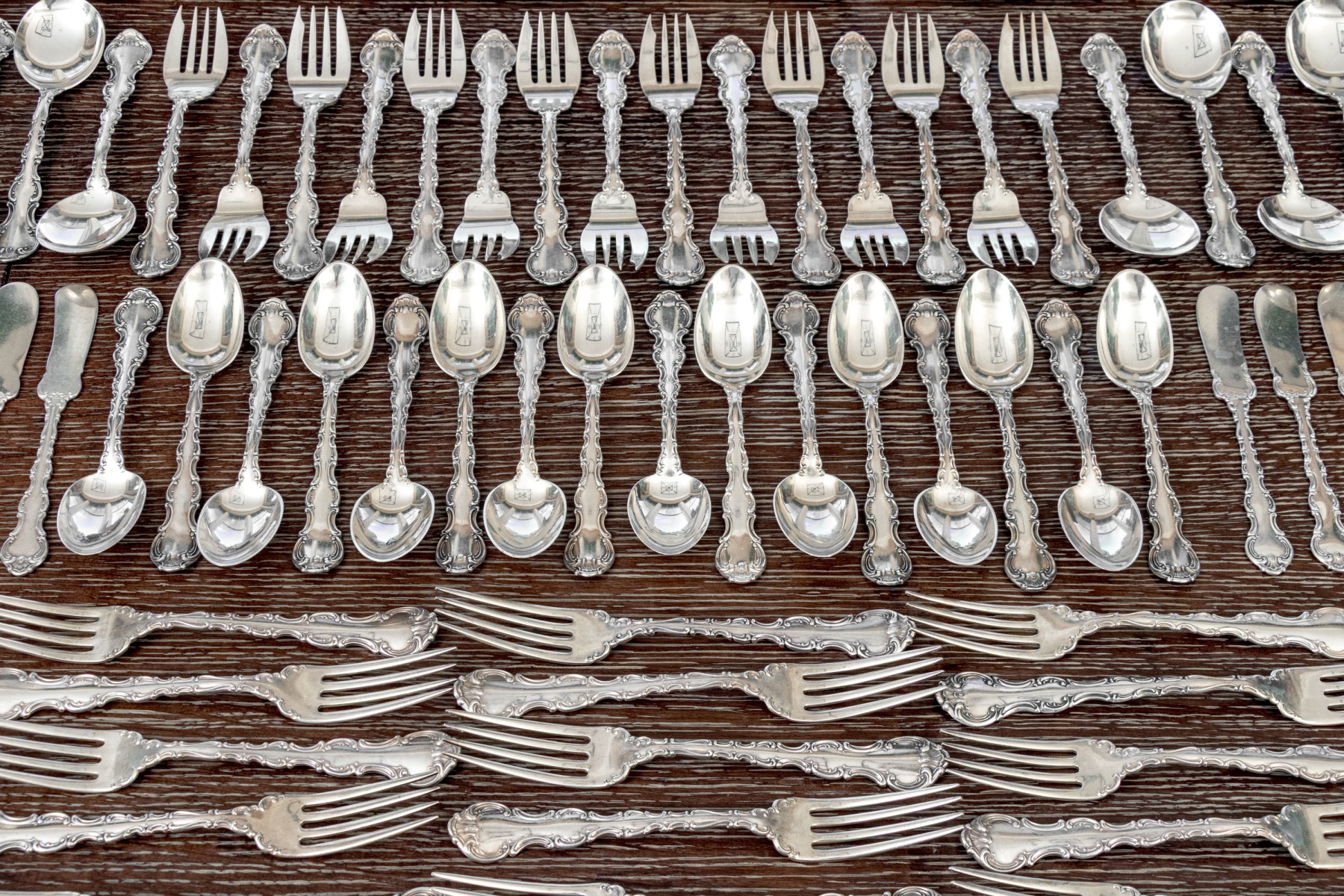 An 84 piece Gorham "Strasbourg" pattern sterling silver flatware service. The "Strasbourg" pattern was first introduced the pattern in the late 19th century and heavily influenced by Rococo style.