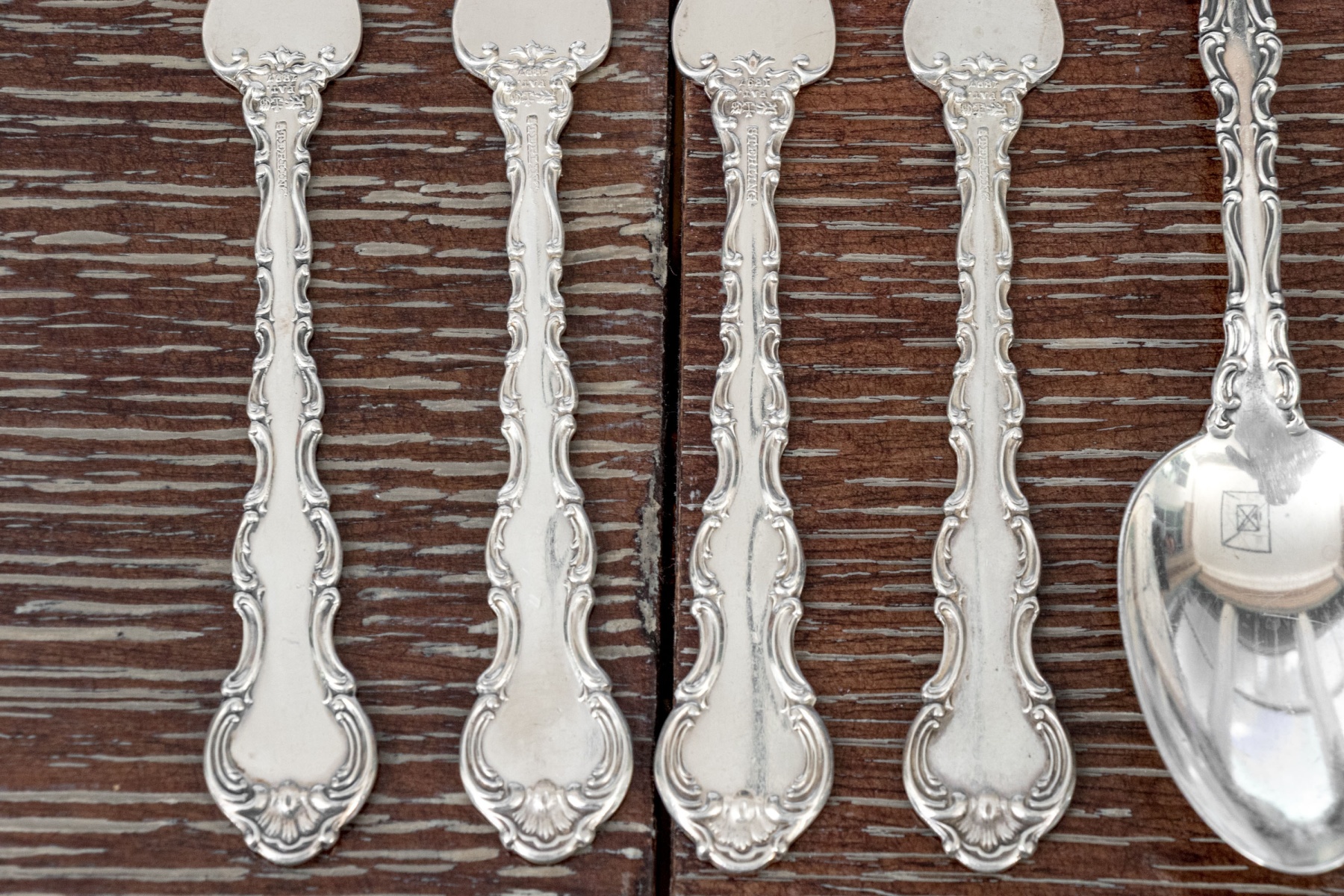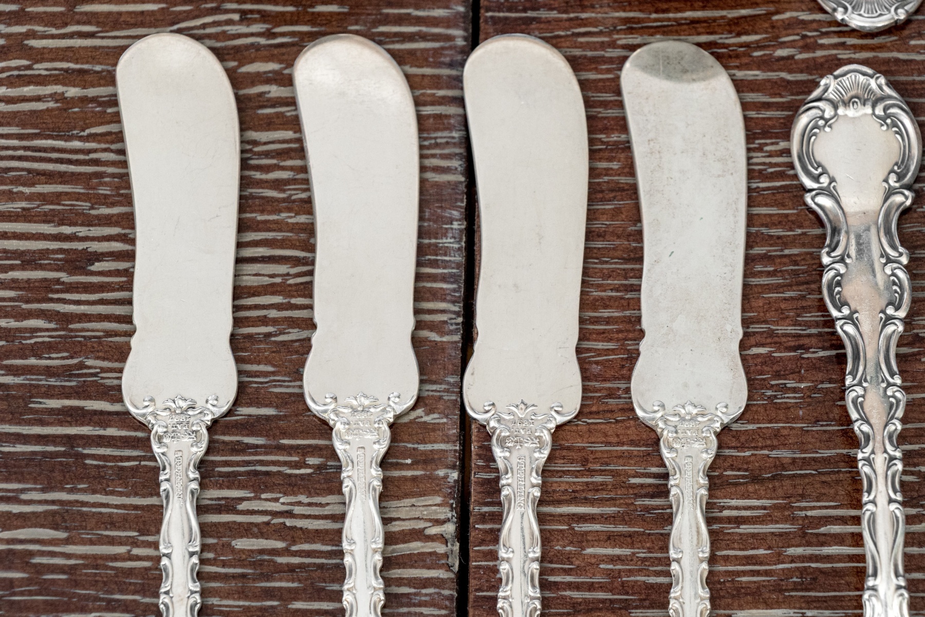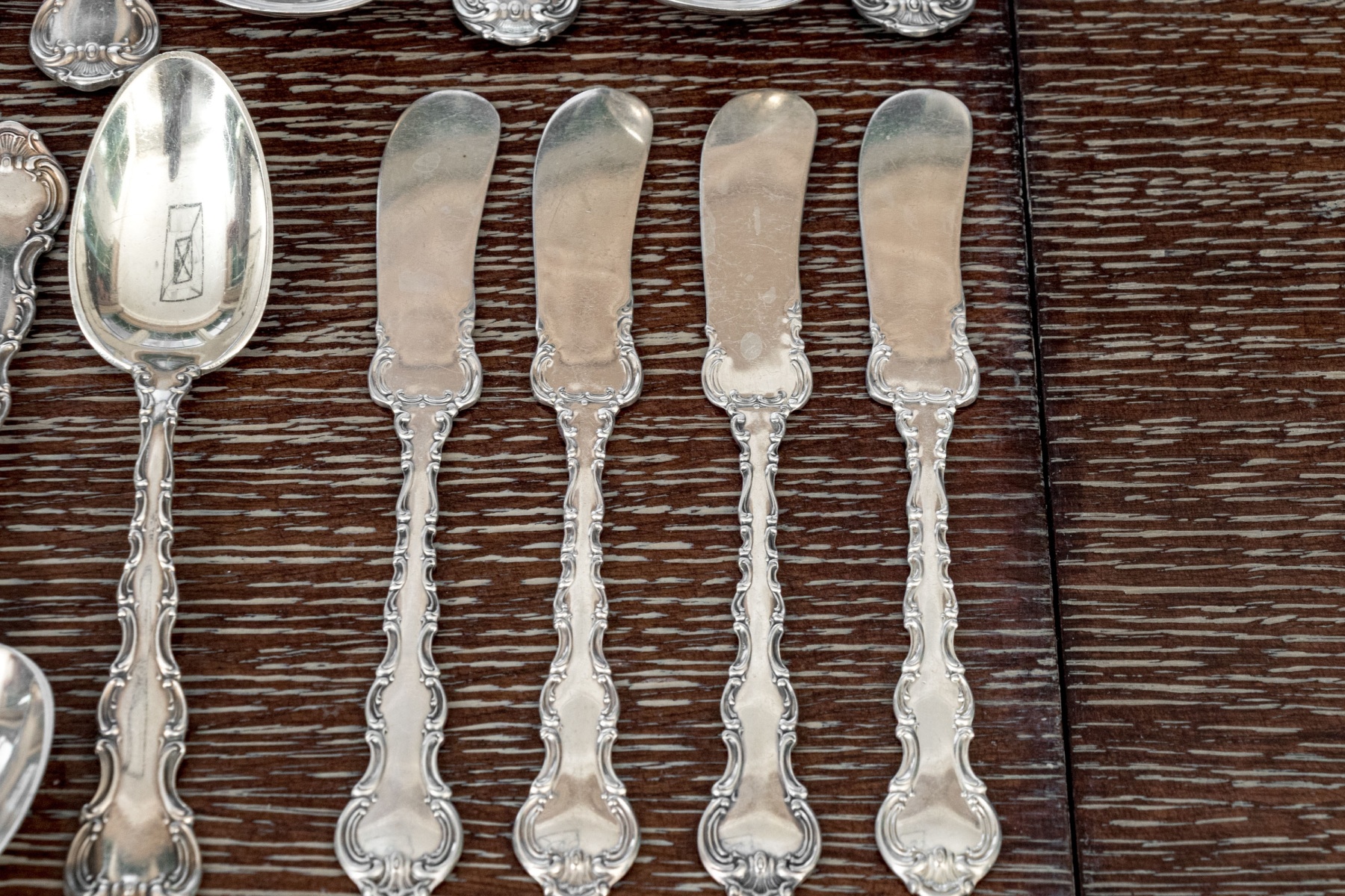 An 84 piece Gorham "Strasbourg" pattern sterling silver flatware service. The "Strasbourg" pattern was first introduced the pattern in the late 19th century and heavily influenced by Rococo style.