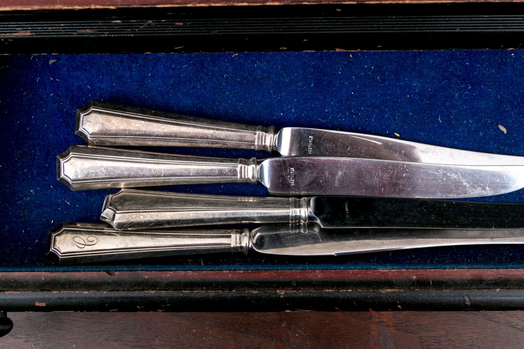 Tarnish and wear commensurate with age and use, a polishing would help considerably. The wooden case with wear including scratches and losses to the finish. One of the wooden knob pulls to the drawer is off and needs to be re-affixed.