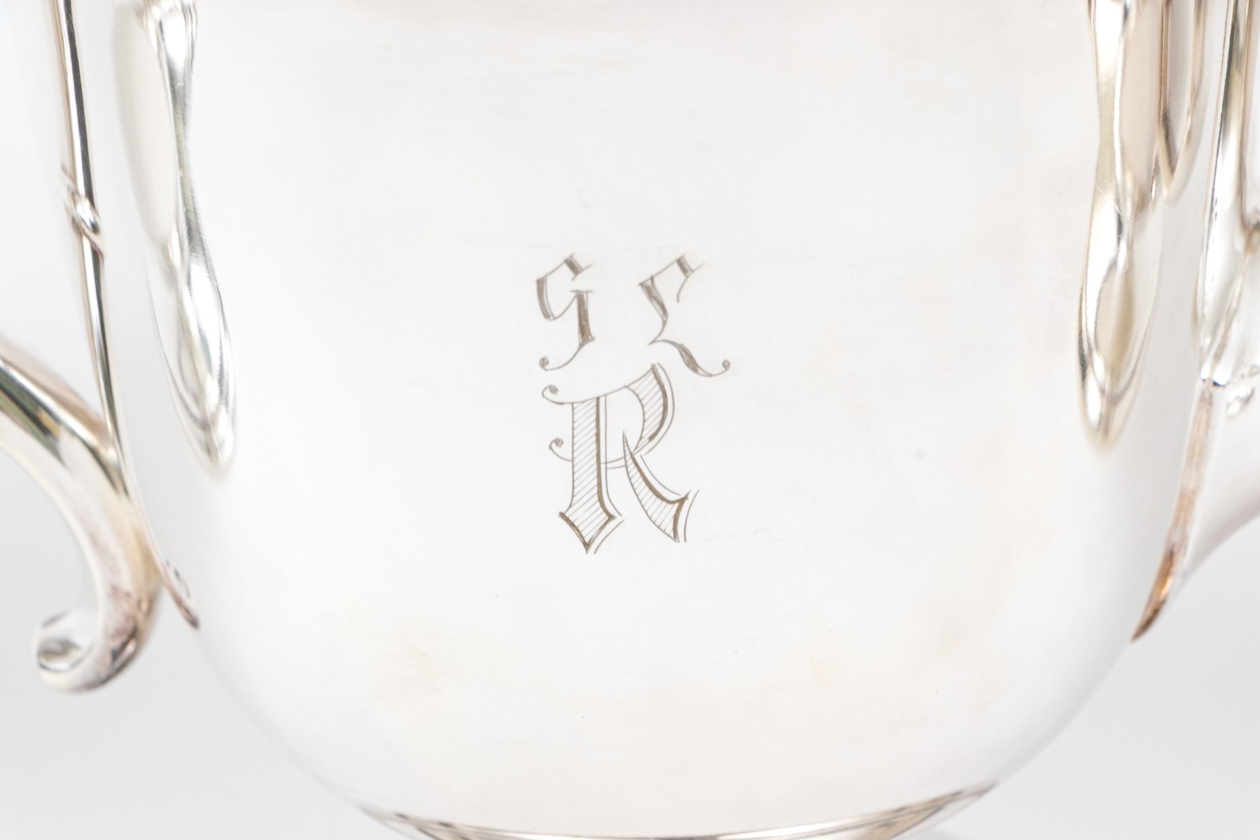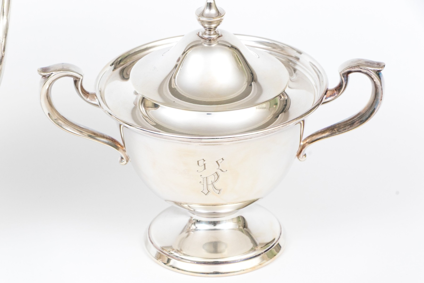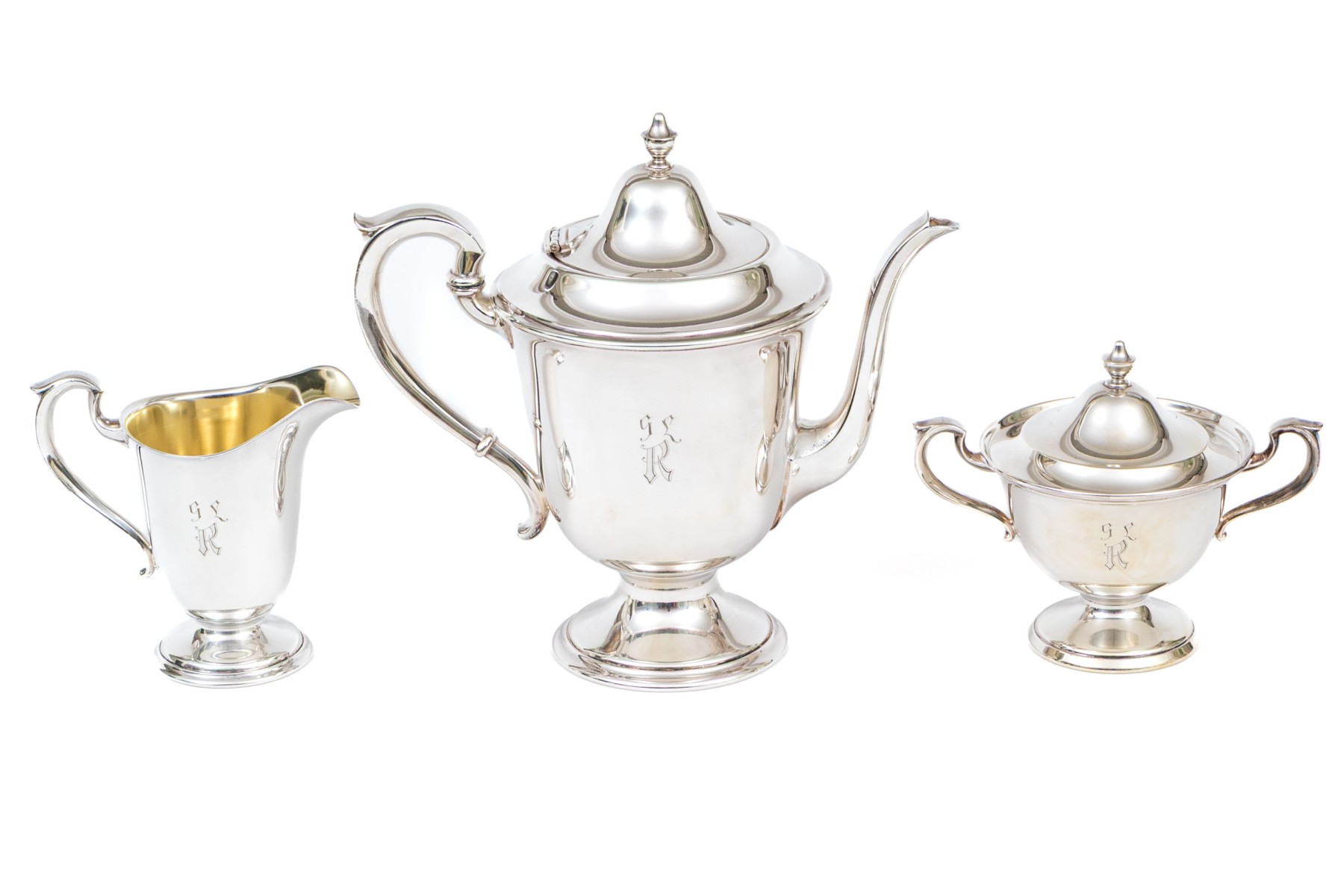 An excellent Gorham sterling silver three piece tea set with vermeil interiors and pedestal feet comprised of a creamer, twin-handled lidded sugar bowl, and a teapot with a hinged lid. Each is monogrammed.