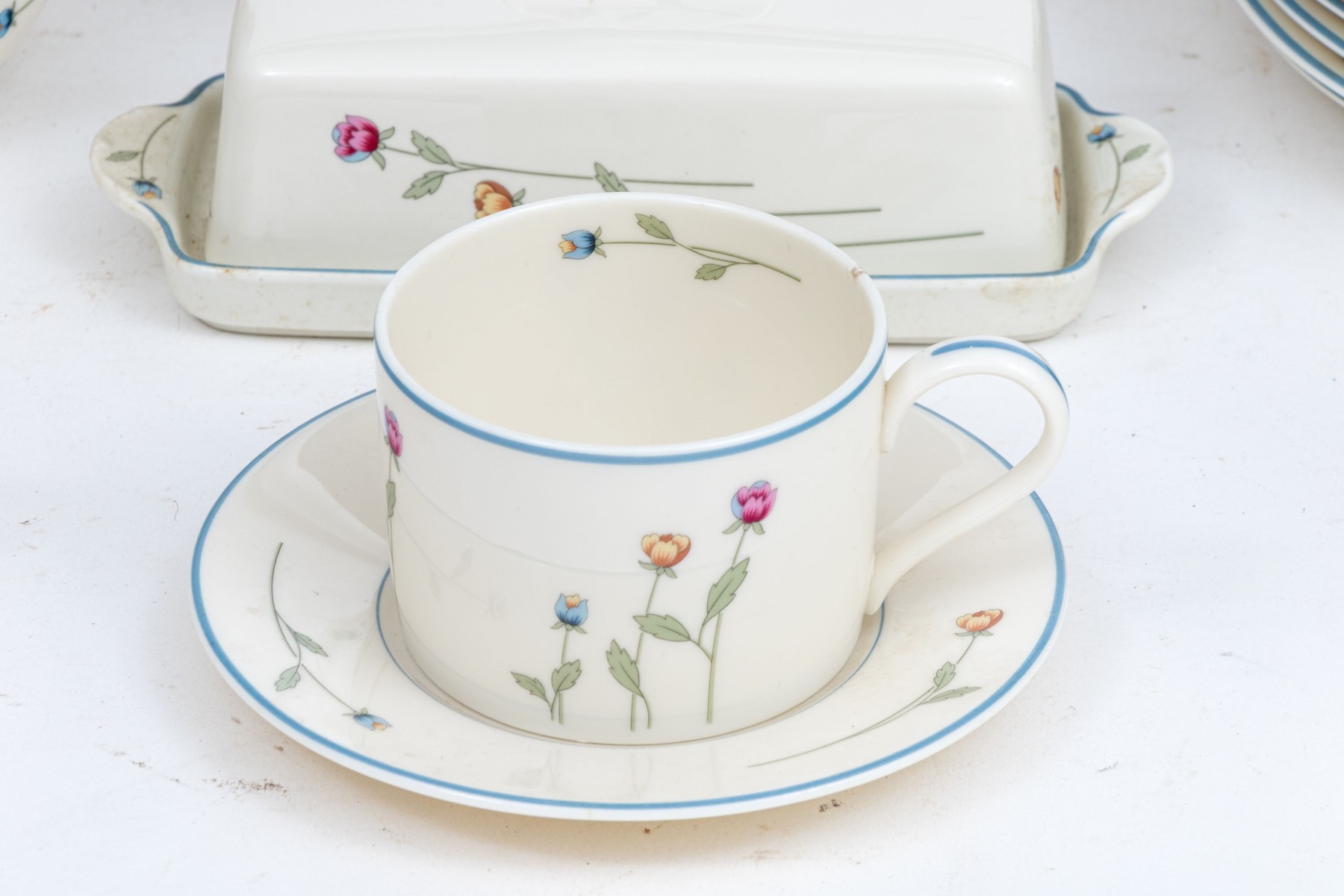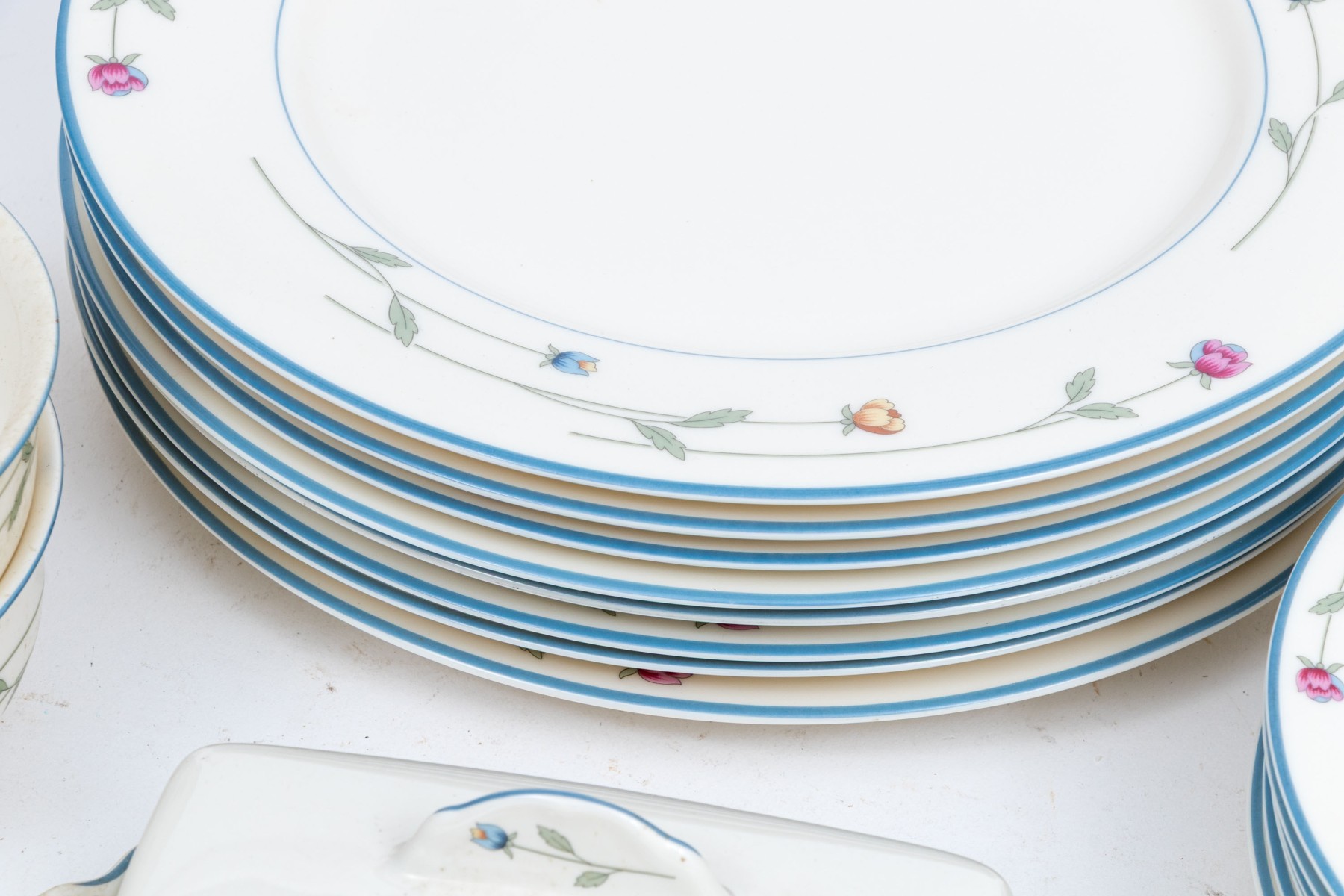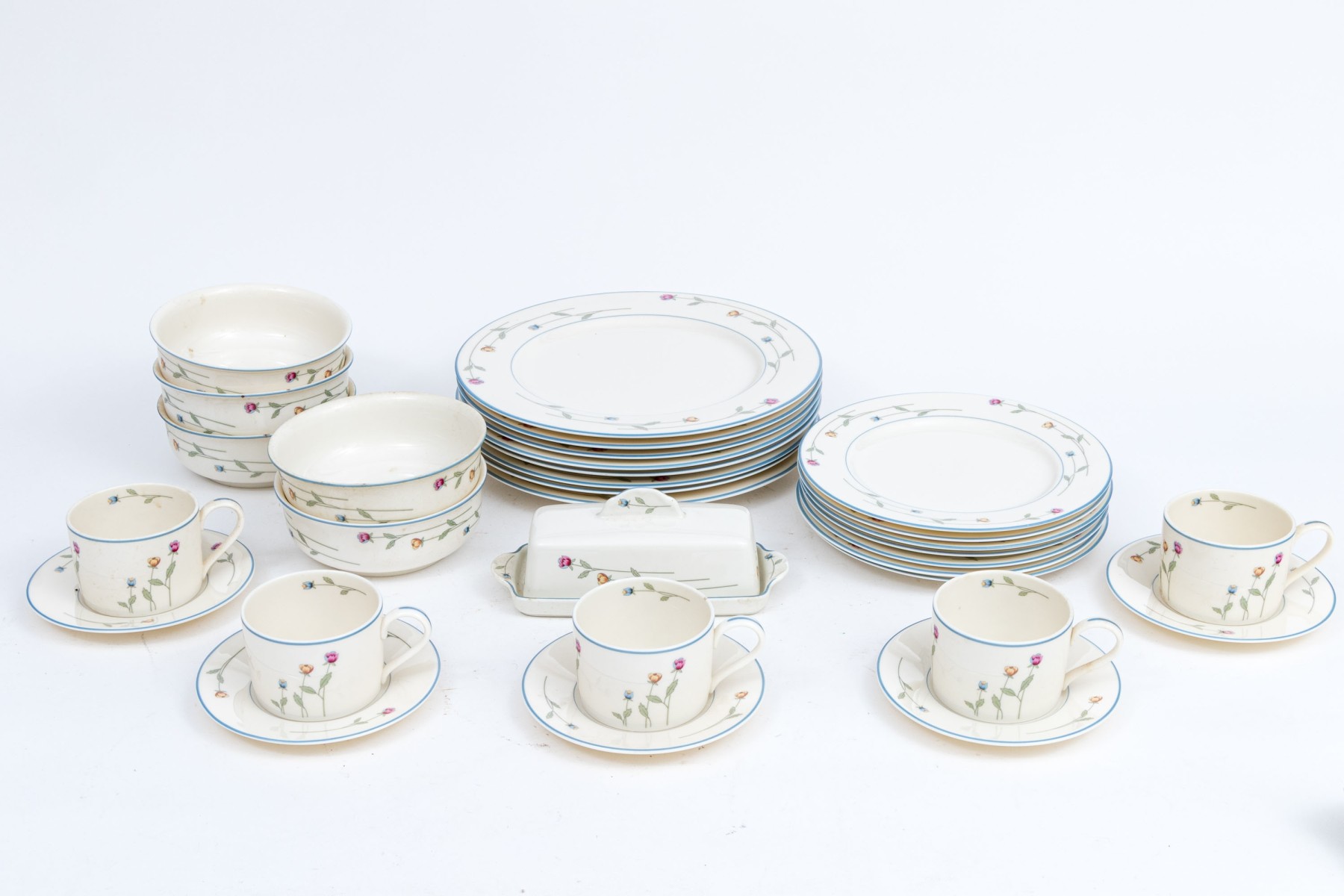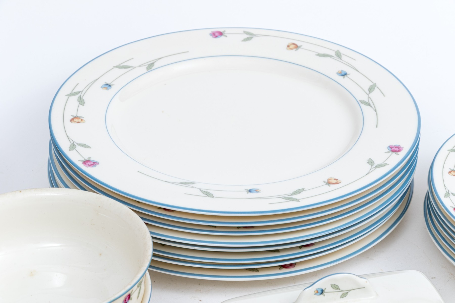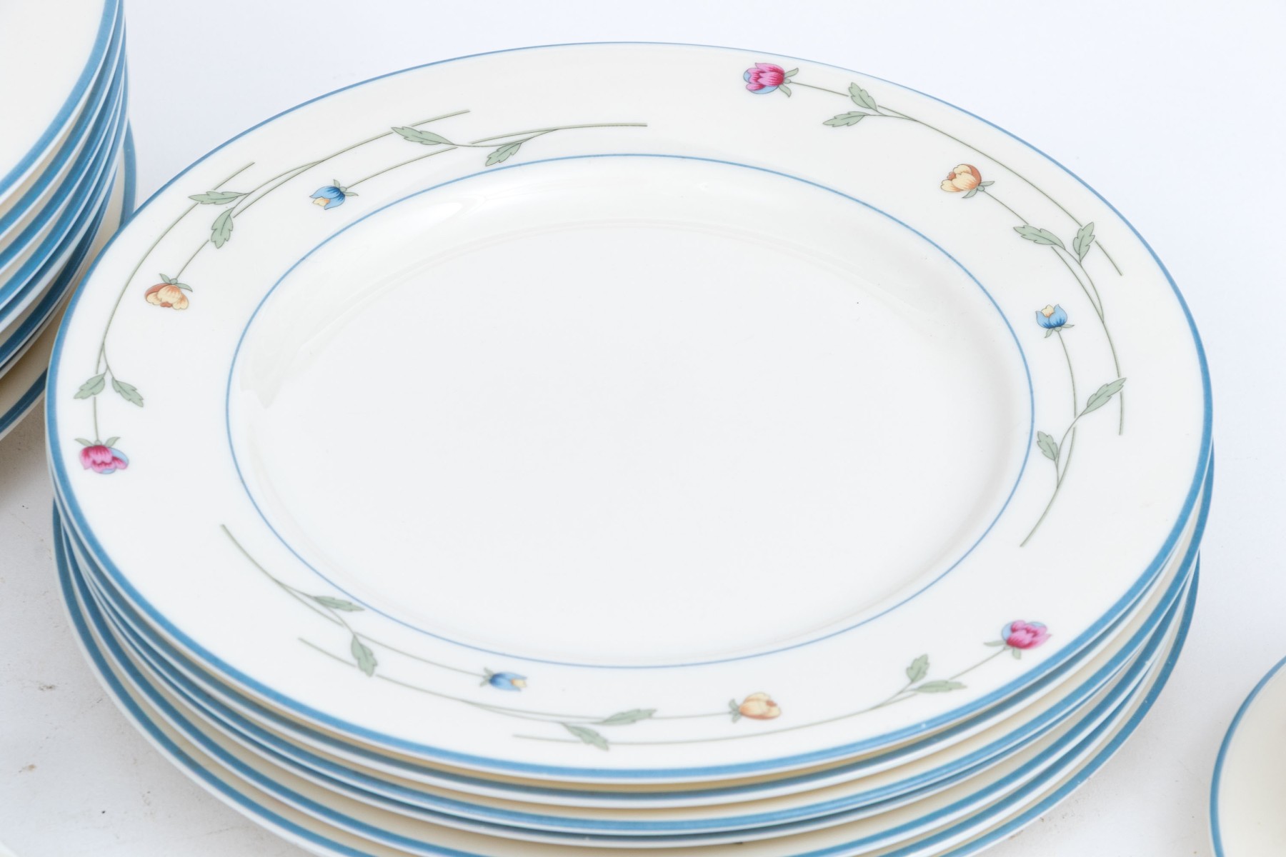 A beautiful collection of Gorham Town & Country "Country Flowers" bone china designed with light blue rims, dainty florals sprays in pink, yellow, and blue on green stems, and warm white bodies. Marked underfoot.