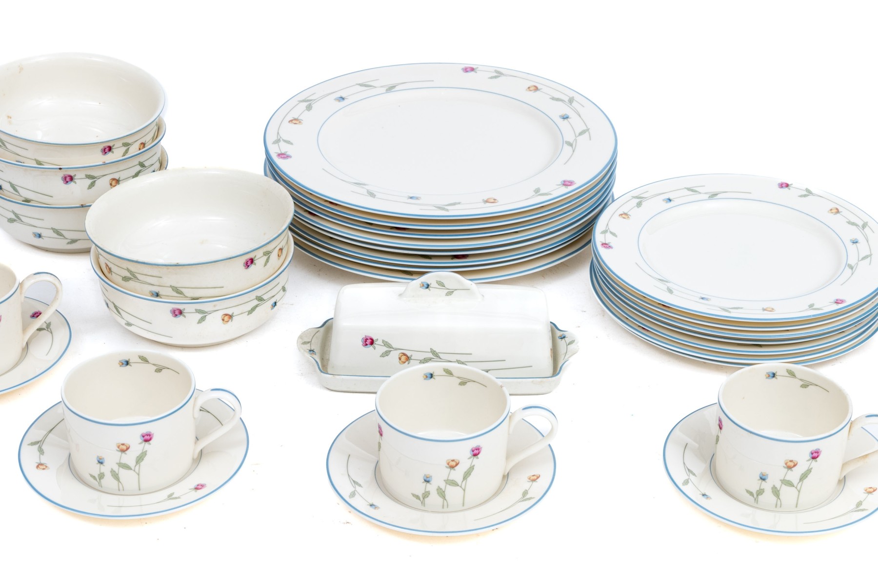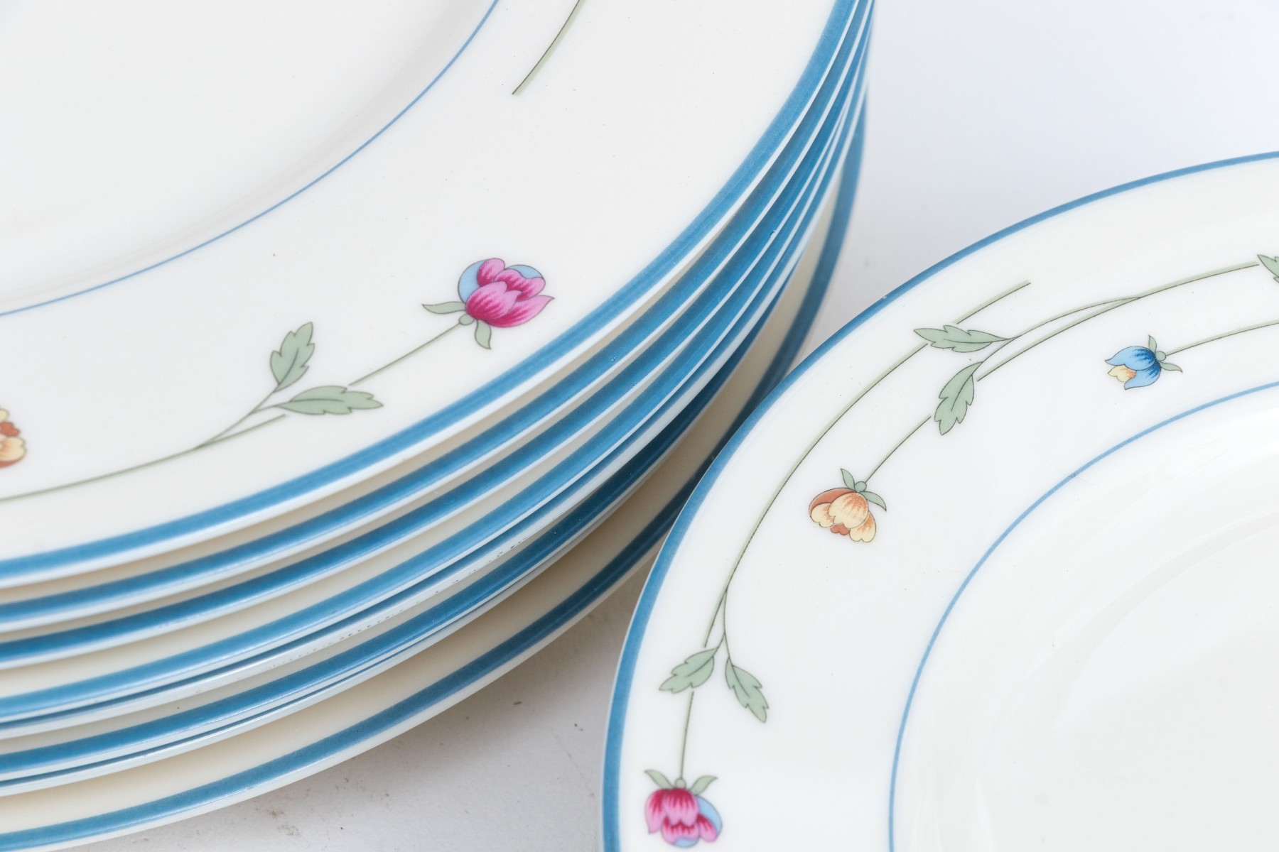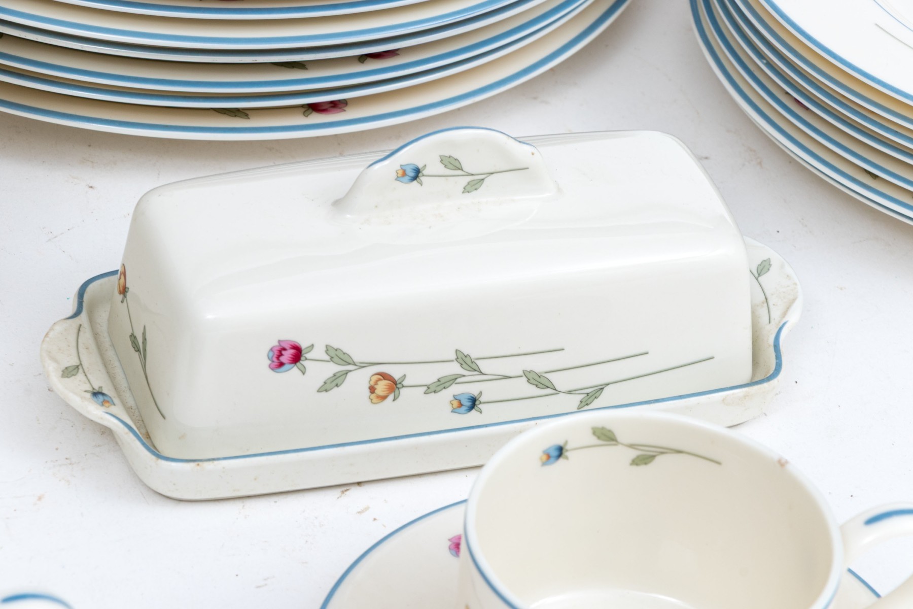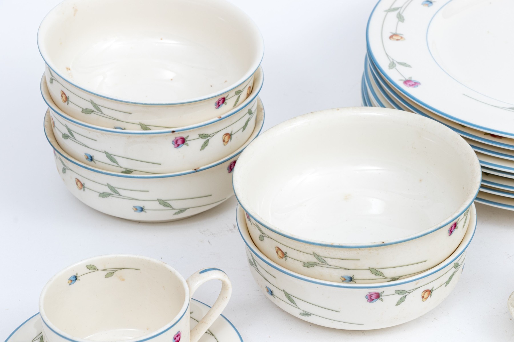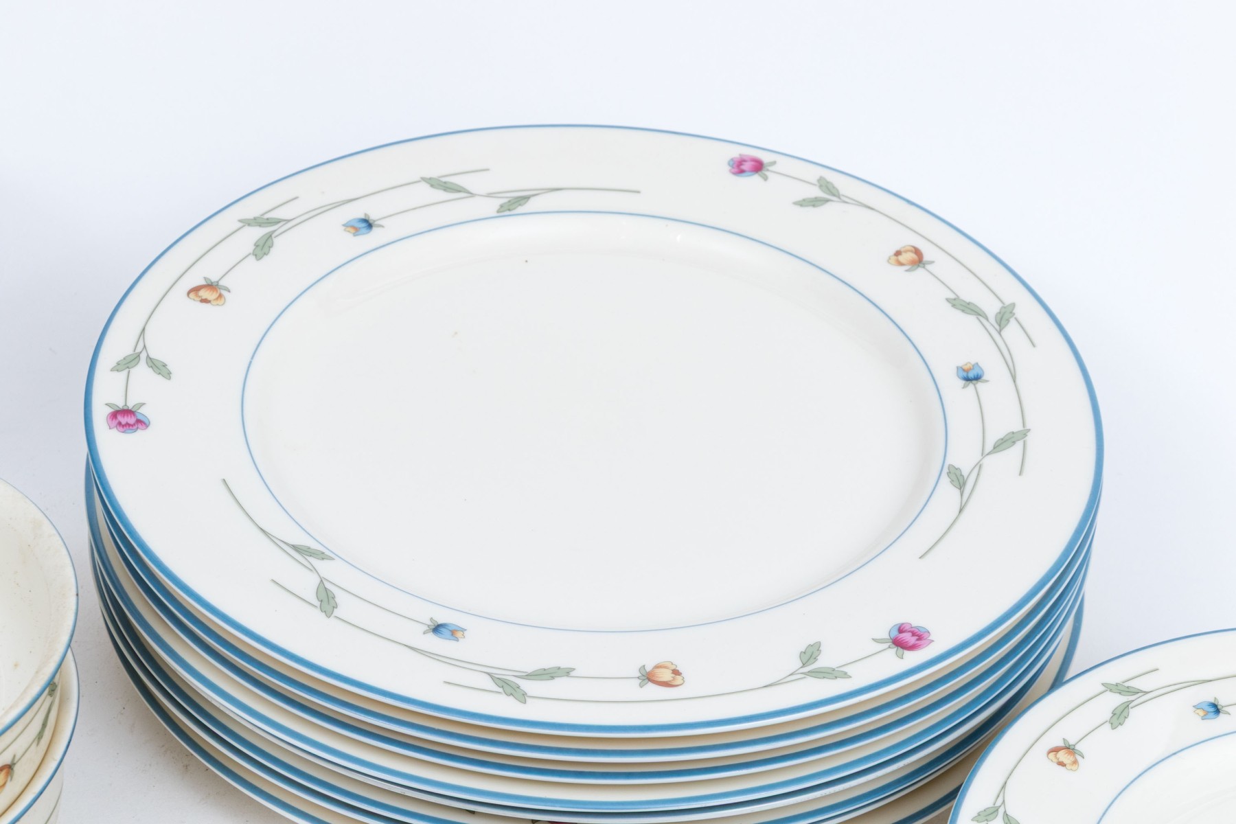 A beautiful collection of Gorham Town & Country "Country Flowers" bone china designed with light blue rims, dainty florals sprays in pink, yellow, and blue on green stems, and warm white bodies. Marked underfoot.