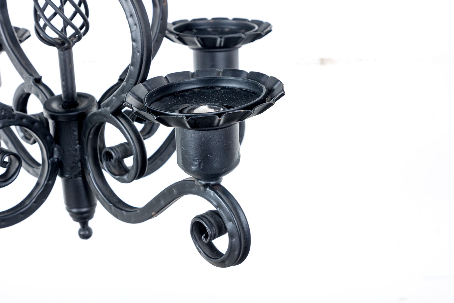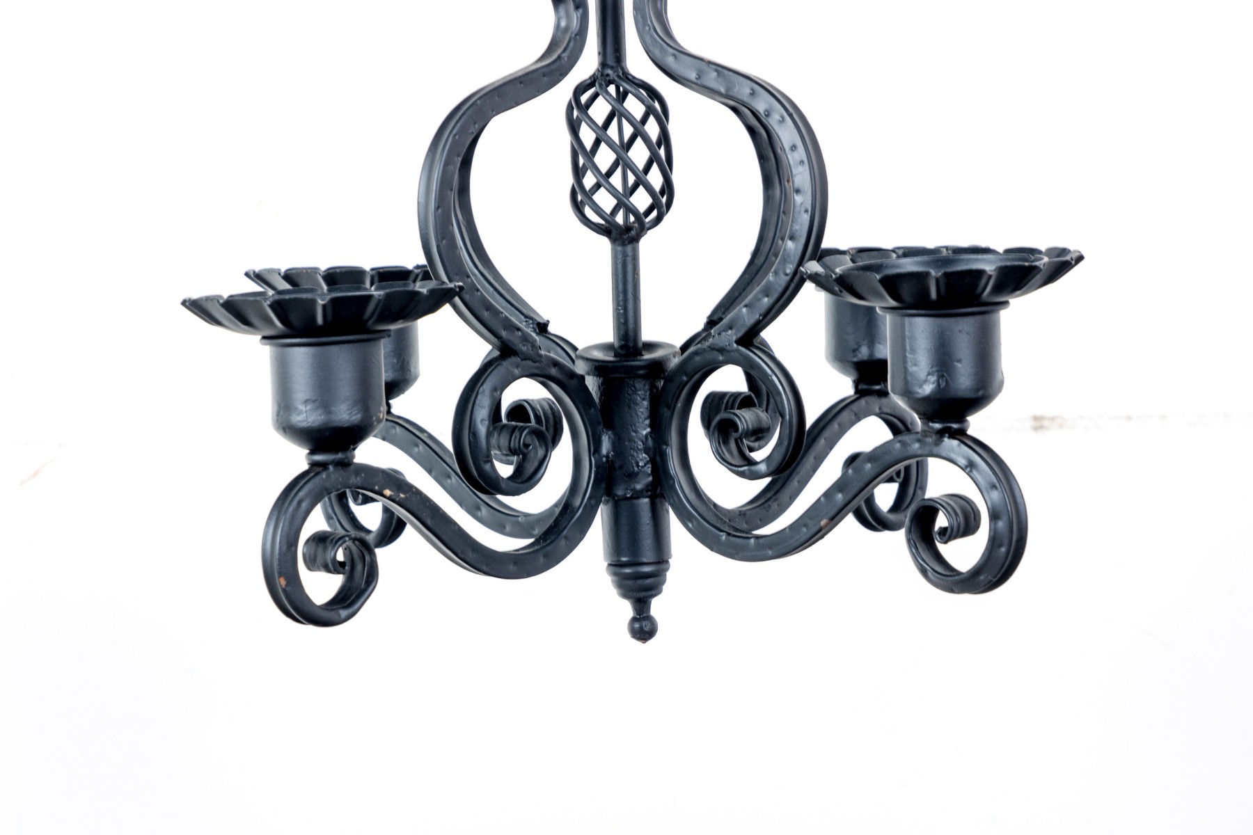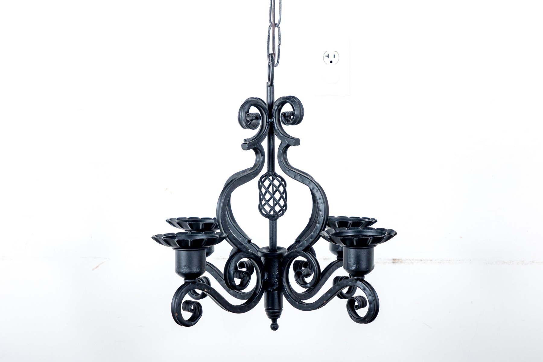 A small, gothic chandelier with four arms showcasing neoclassical iron scrollwork set in matte black.