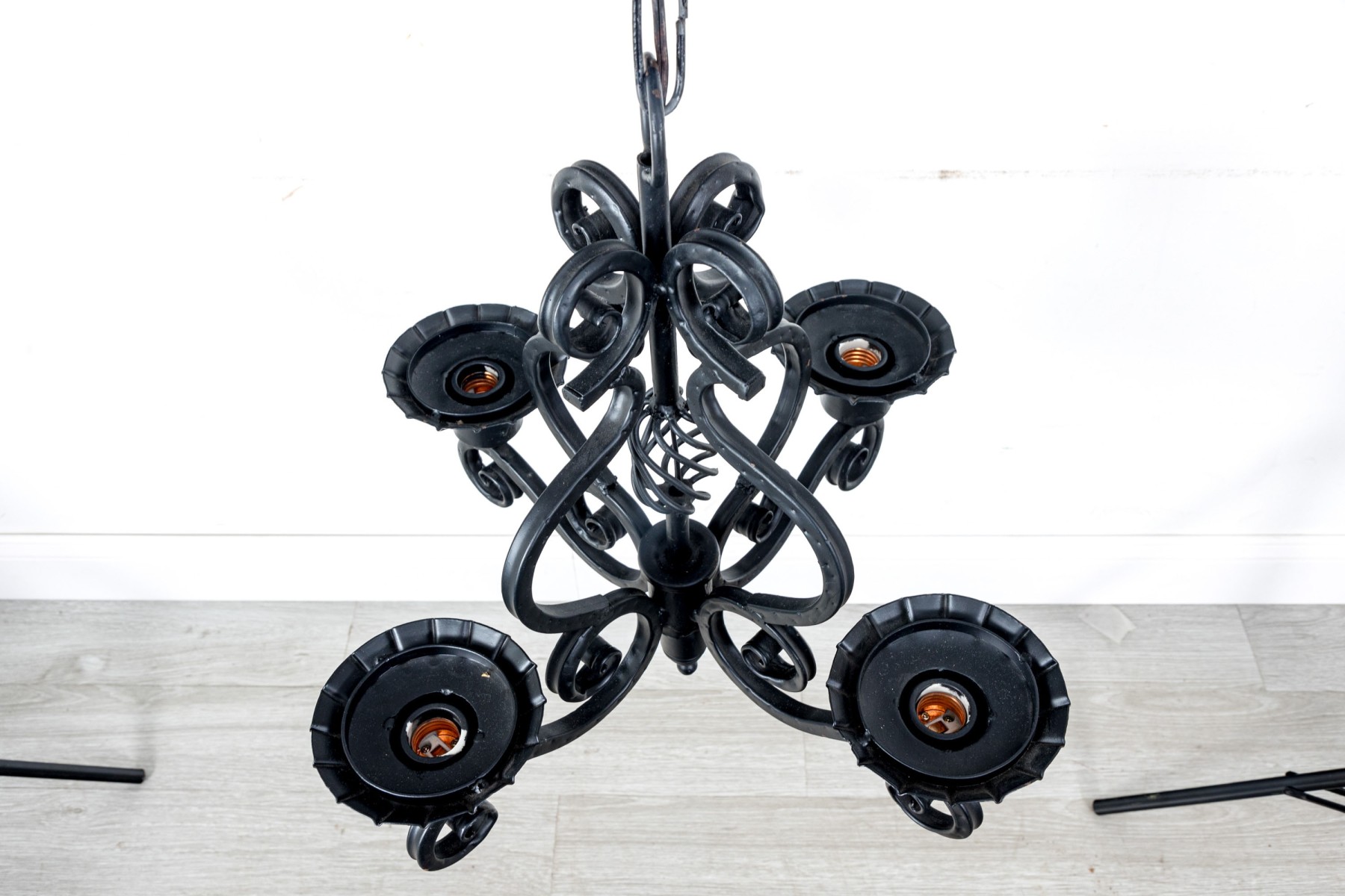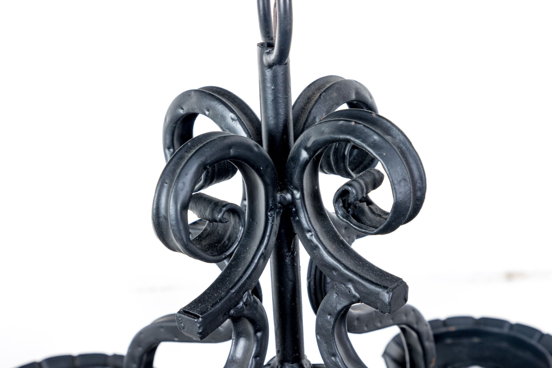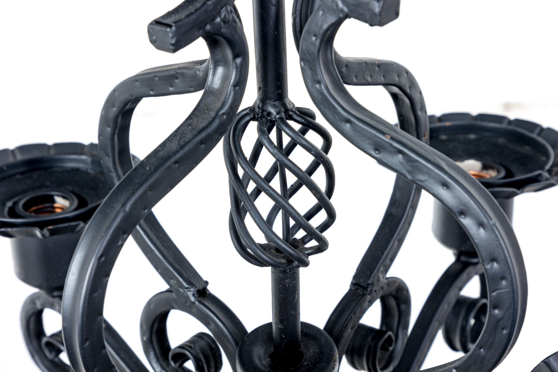 A small, gothic chandelier with four arms showcasing neoclassical iron scrollwork set in matte black.