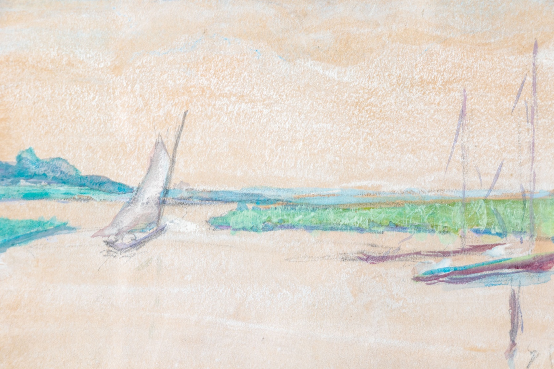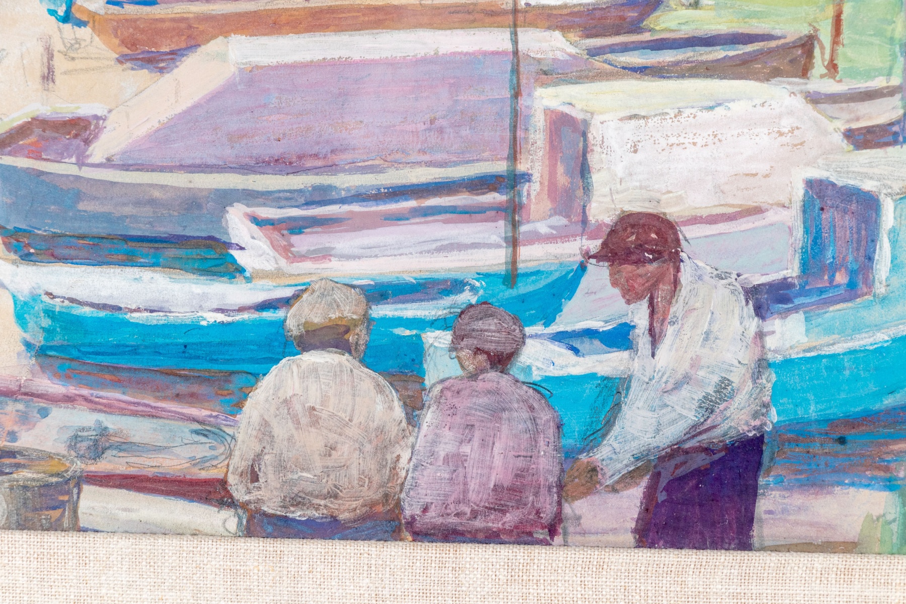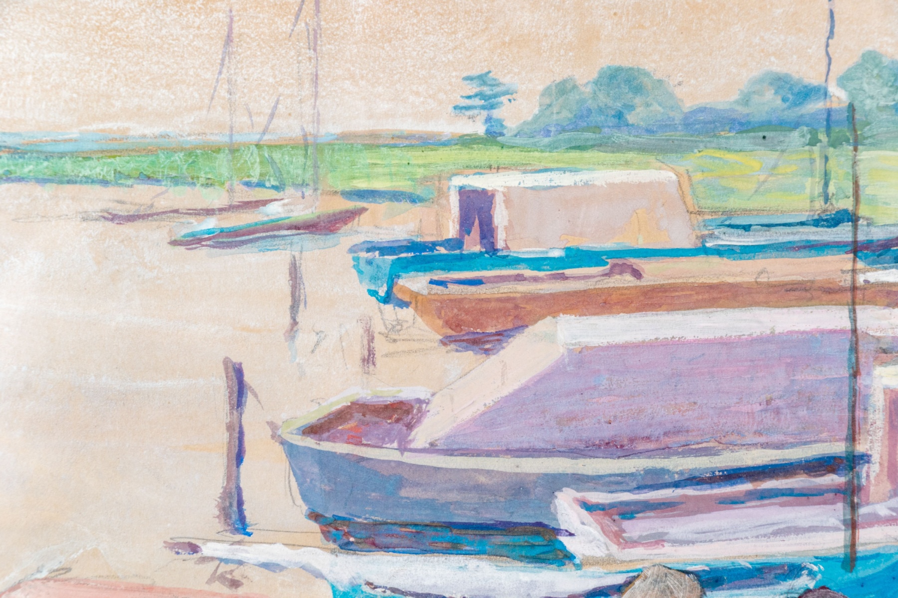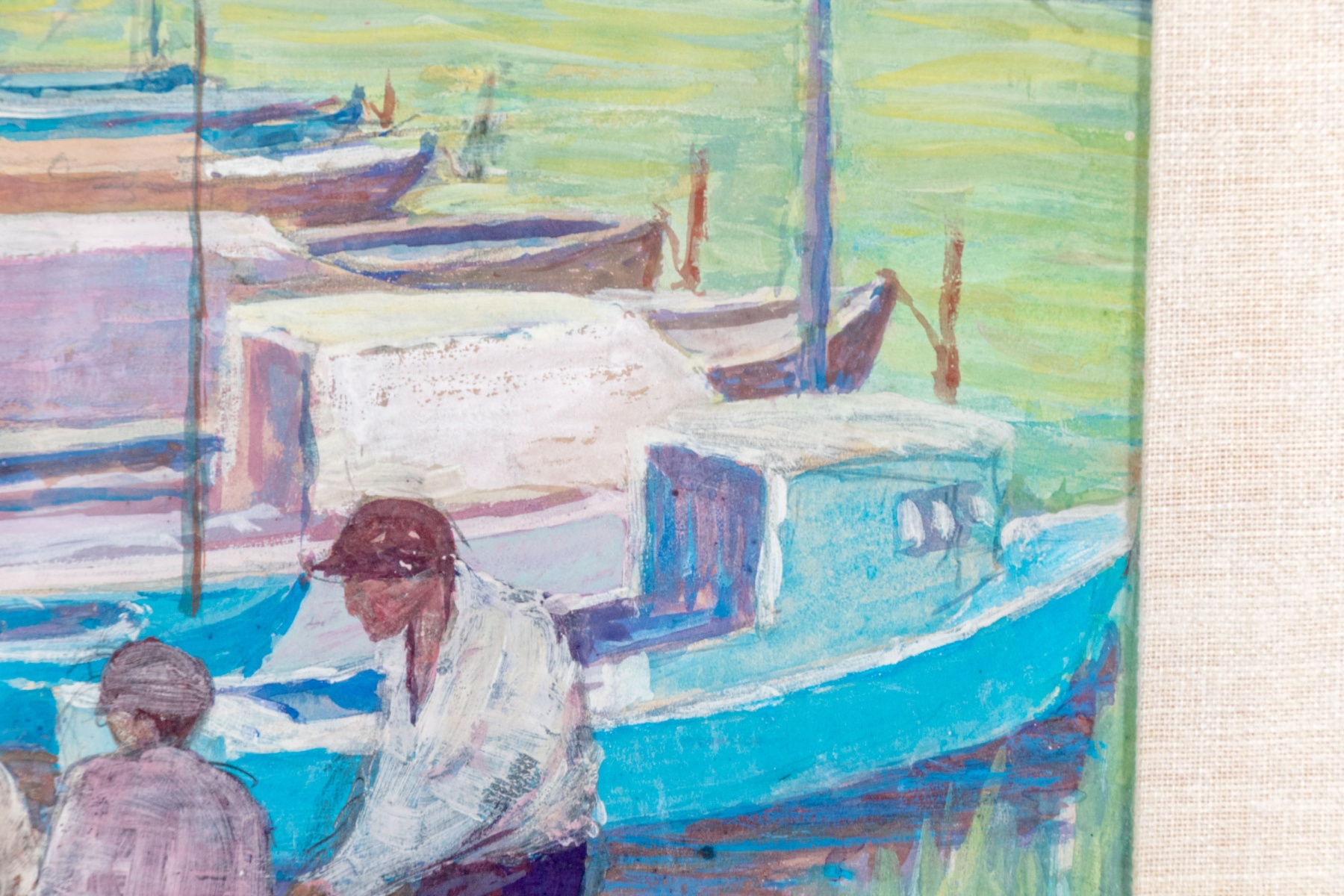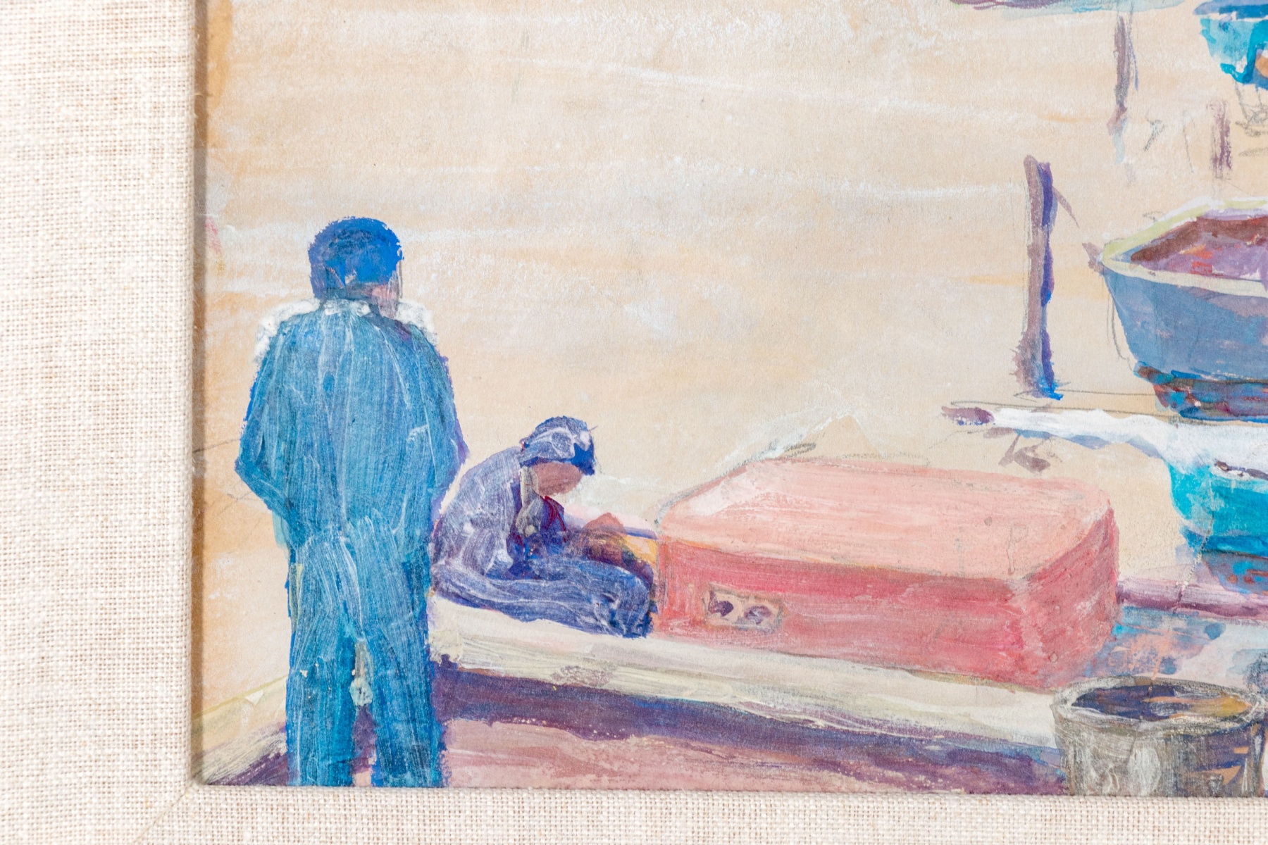 A well rendered gouache painting on paper depicting a harbor scene with figures resting near docked ships in blue and orange along a grassy bank beneath a warm orange sky. Appears to be unsigned.