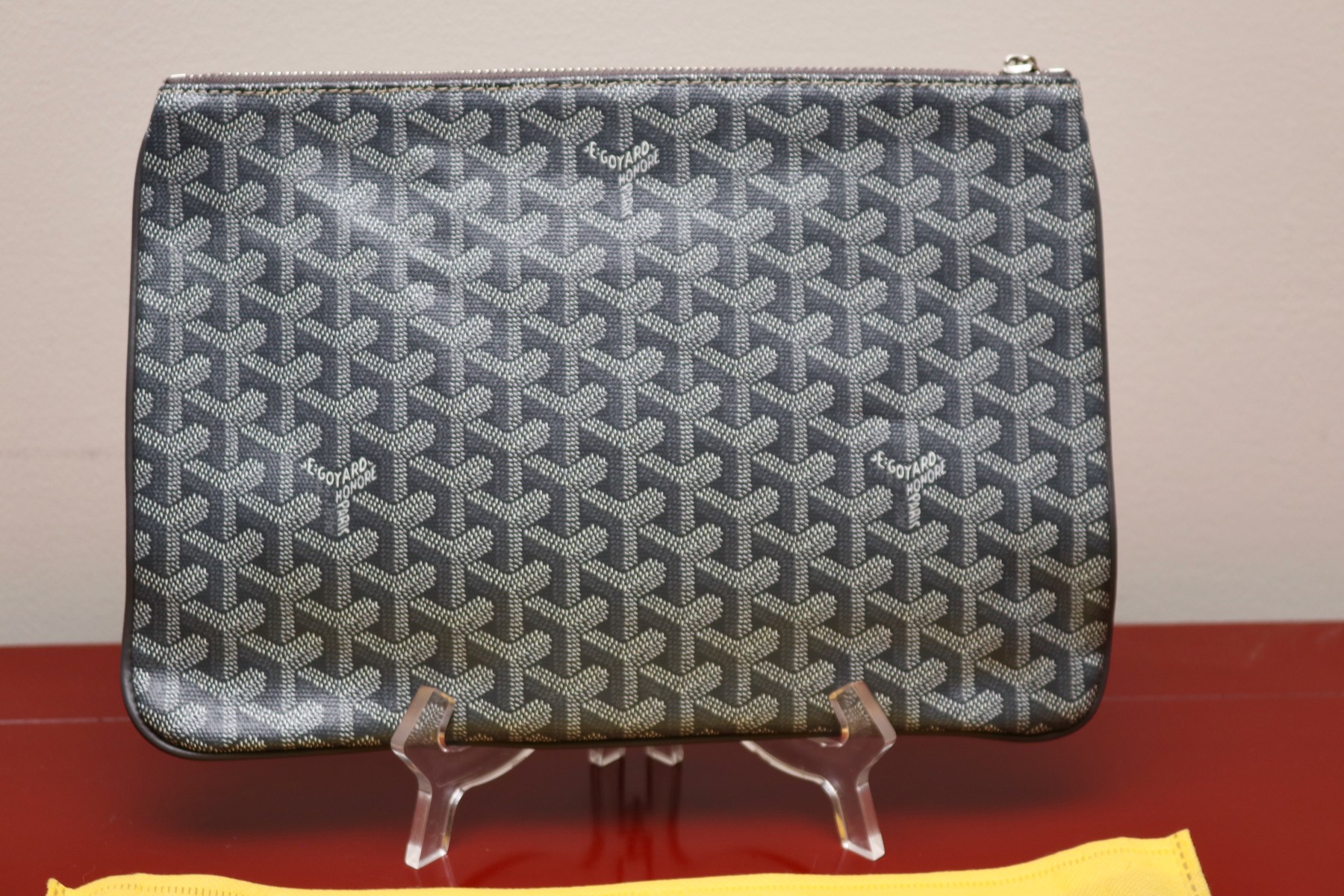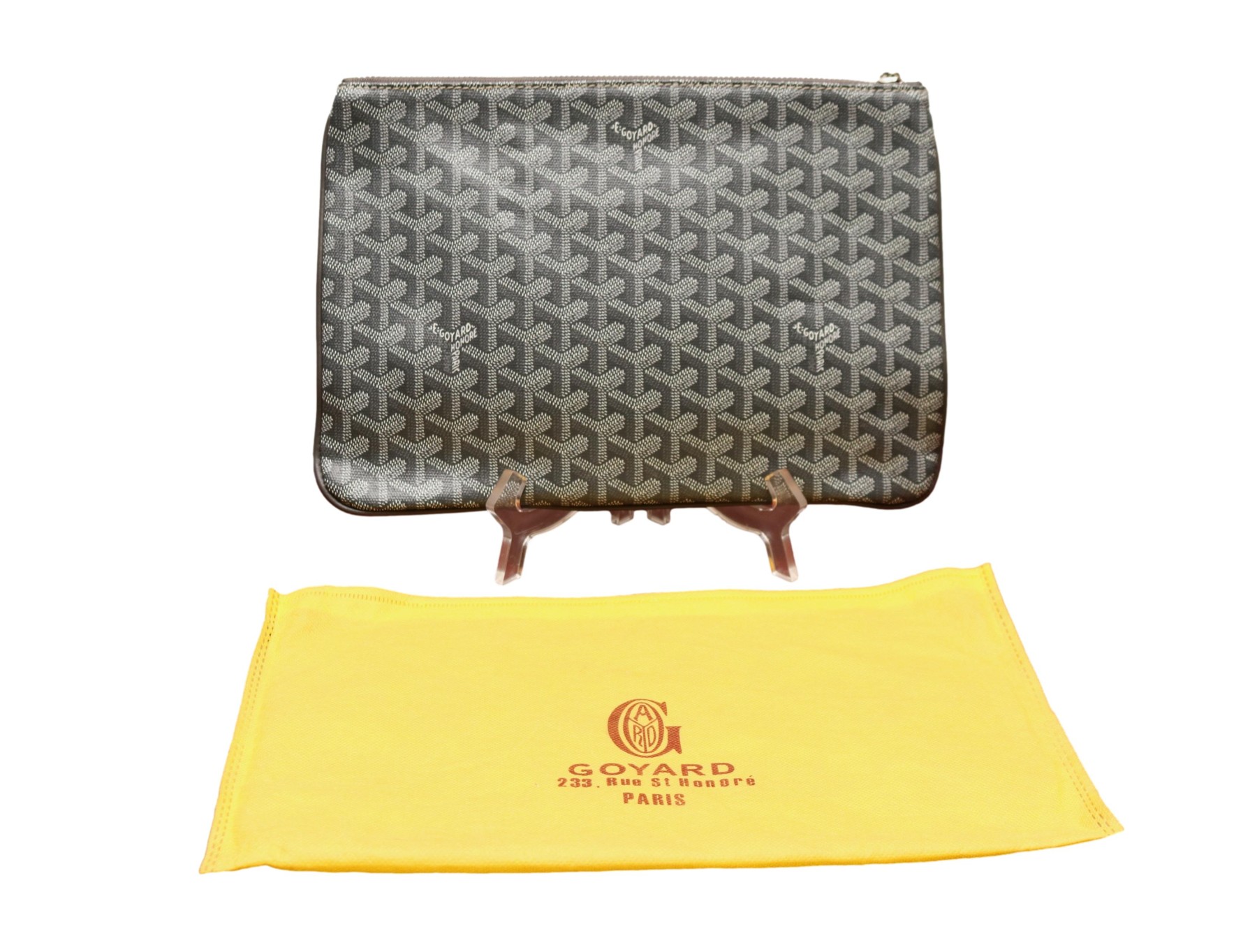 A Goyard Goyardine Clutch Bag Senat MM finished in the house's iconic grey Goyardine chevron canvas. The design is clean and versatile, with a smooth metal zipper pull and subtle logo signature. Interior reveals a yellow canvas and a small pocket. The pouch comes with its original Goyard yellow dust bag, stamped with the address of the legendary Paris boutique, 233 Rue Saint-Honoré.