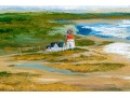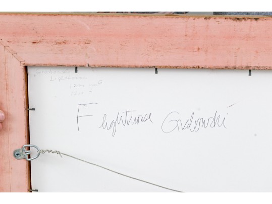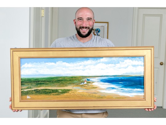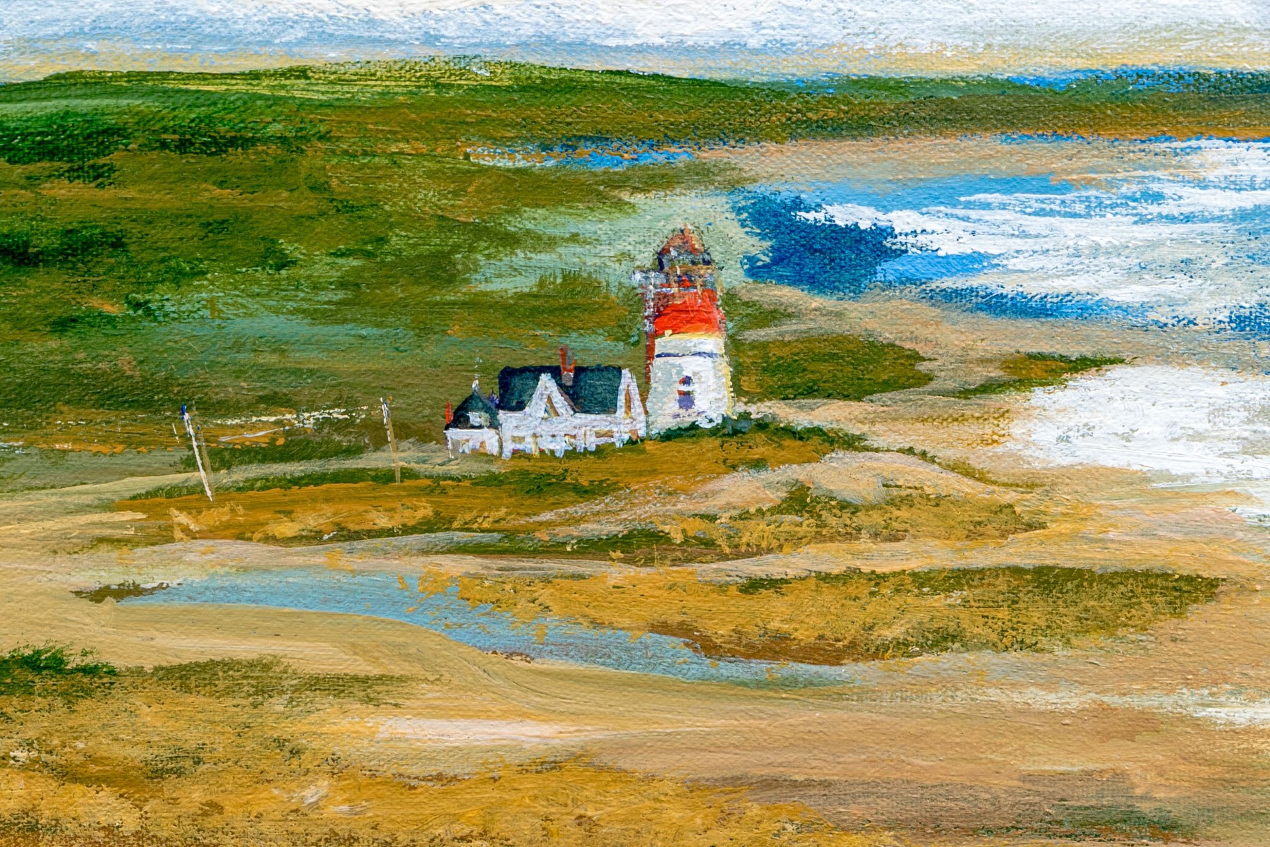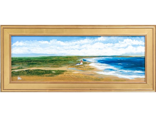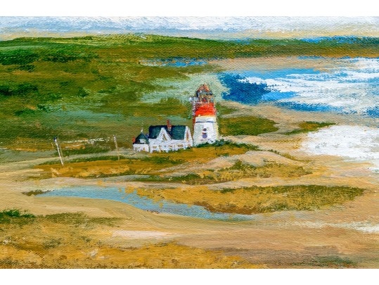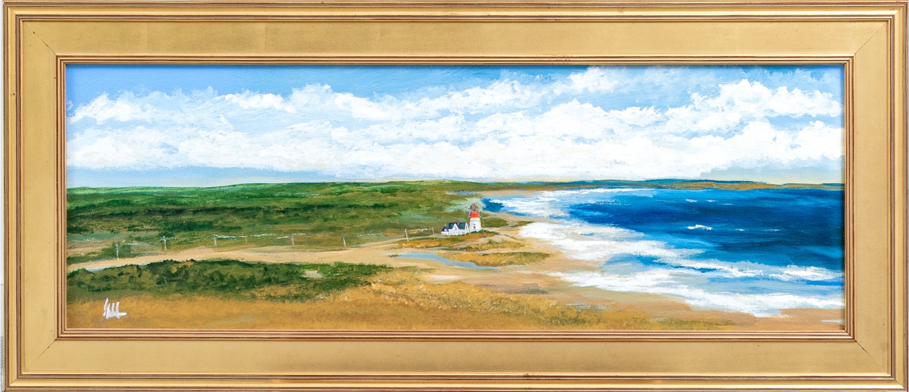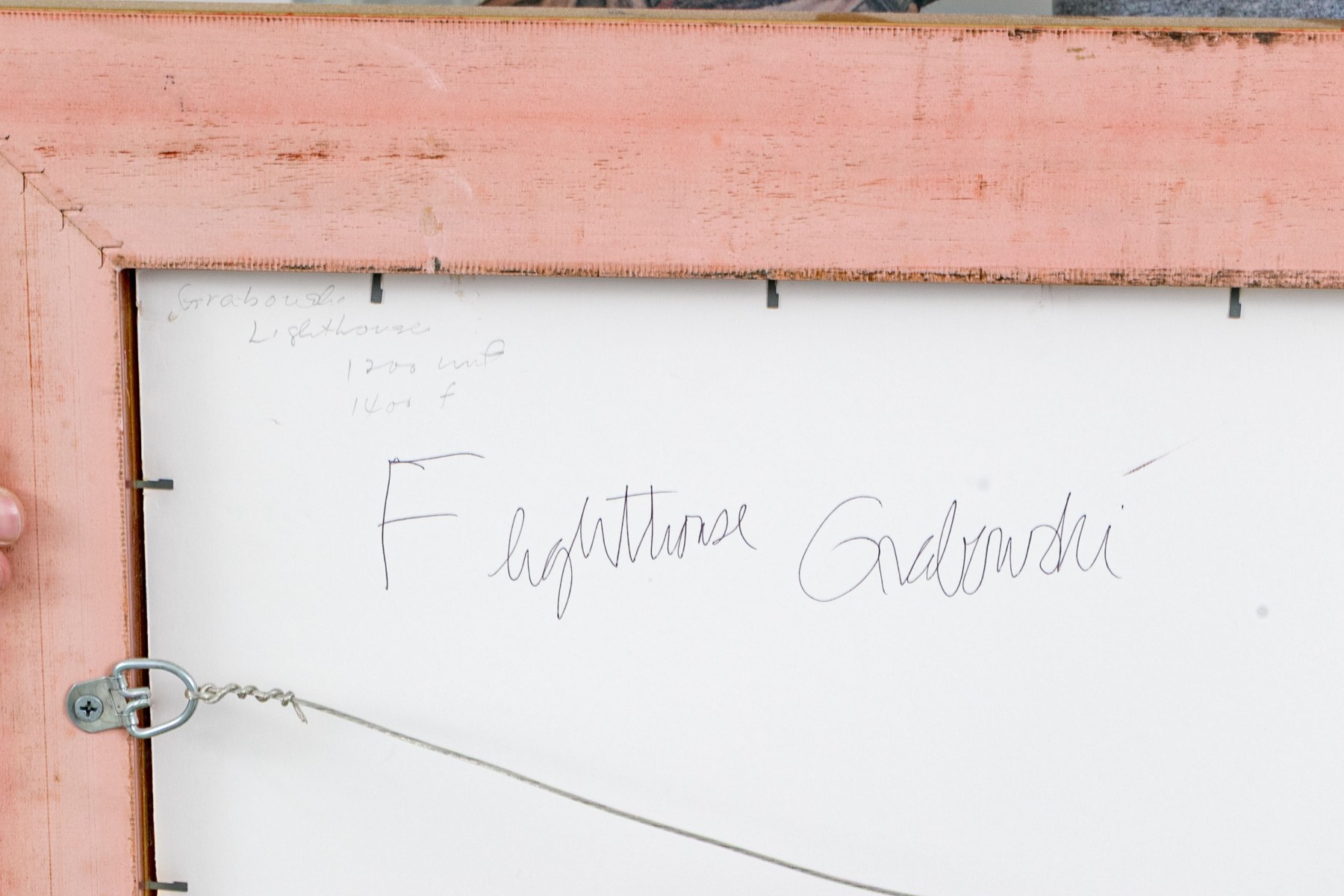 "Grabowski Lighthouse" oil painting on canvas depicting a red and white lighthouse next to a white and blue house at the center of a sprawling coastal landscape with deep blue ocean waves frothing white and the shore to the right and a dirt road flanked by grassland to the left, all beneath a wide, clouded sky. Signed lower left and titled on the verso.