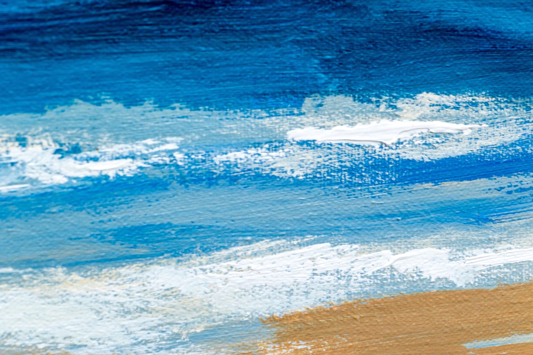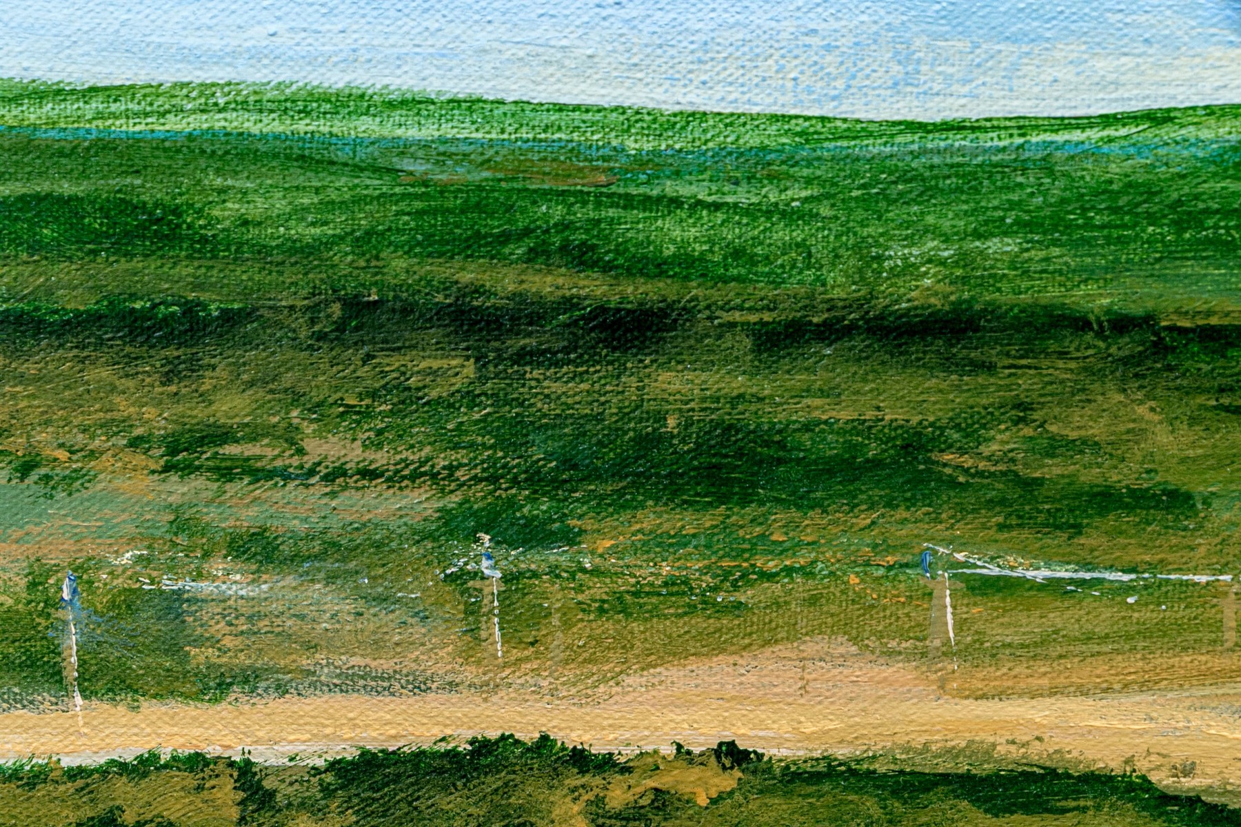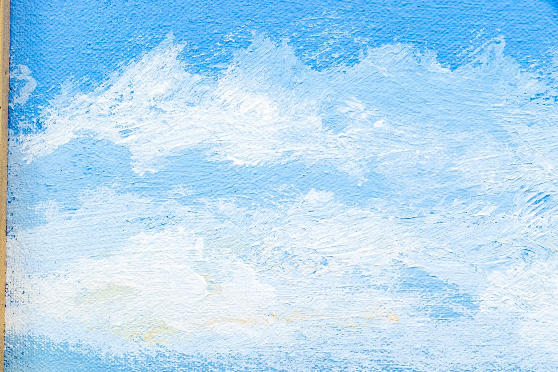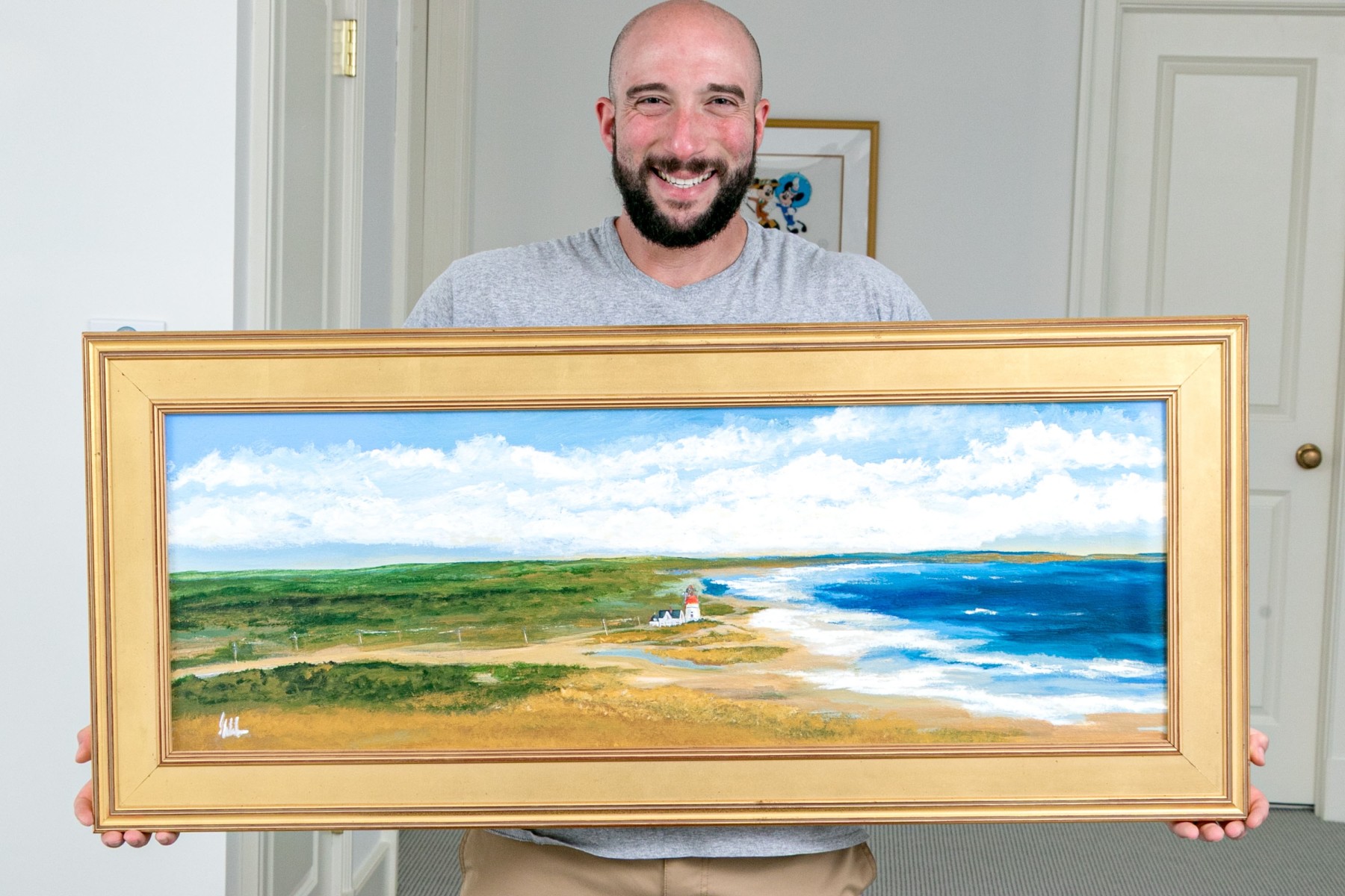 "Grabowski Lighthouse" oil painting on canvas depicting a red and white lighthouse next to a white and blue house at the center of a sprawling coastal landscape with deep blue ocean waves frothing white and the shore to the right and a dirt road flanked by grassland to the left, all beneath a wide, clouded sky. Signed lower left and titled on the verso.