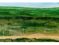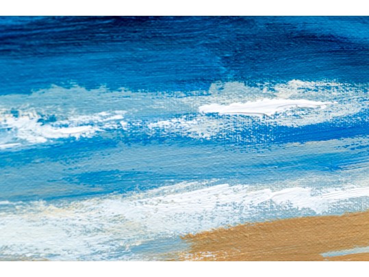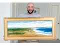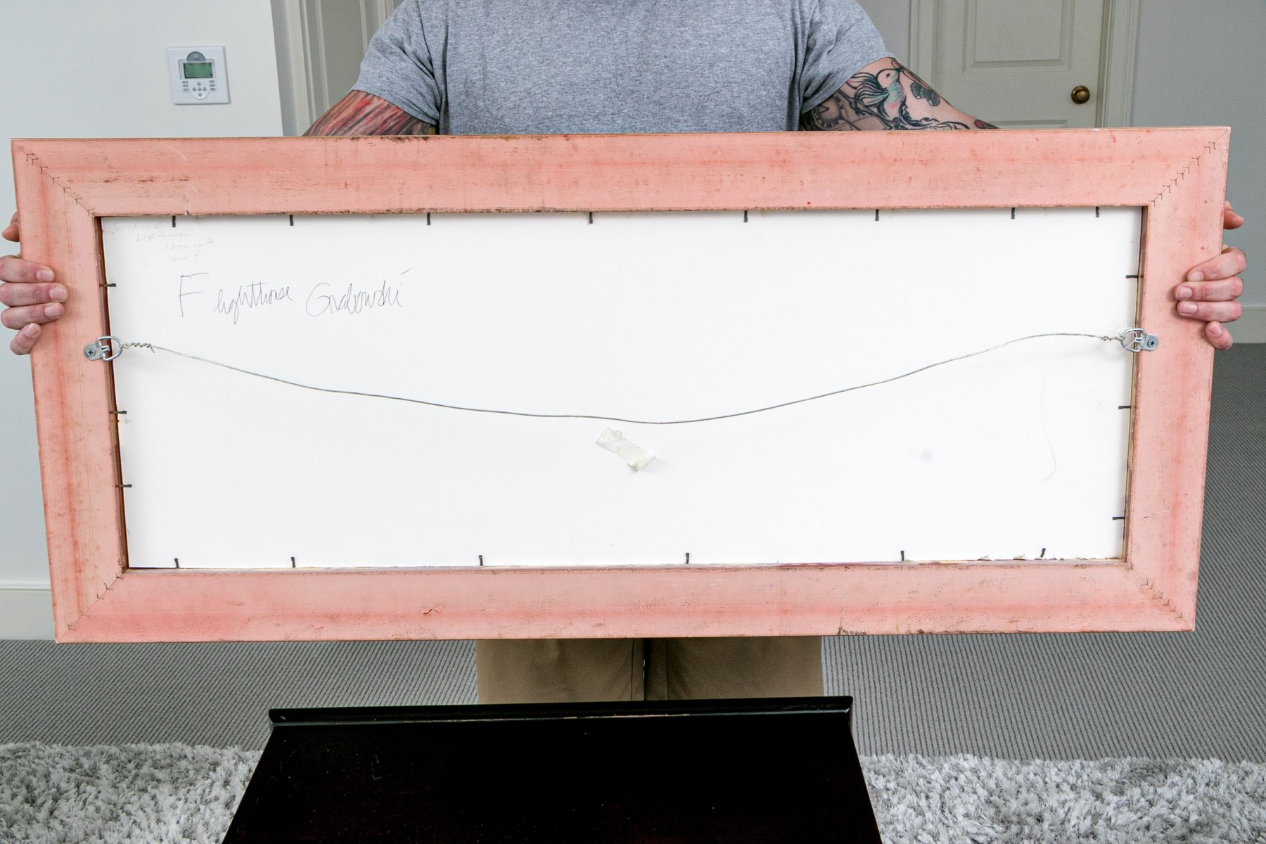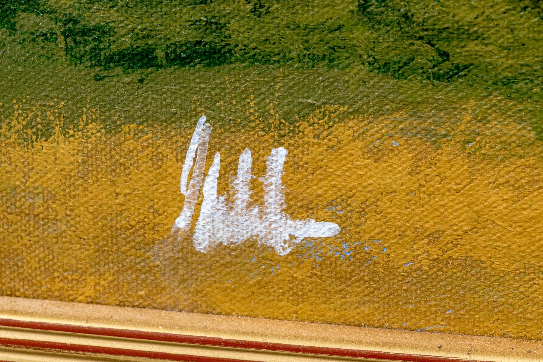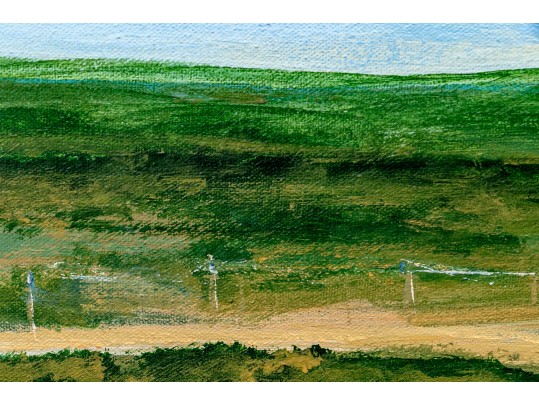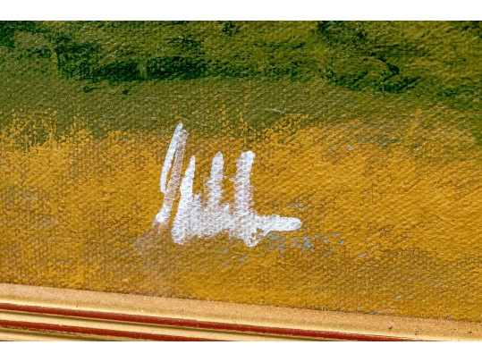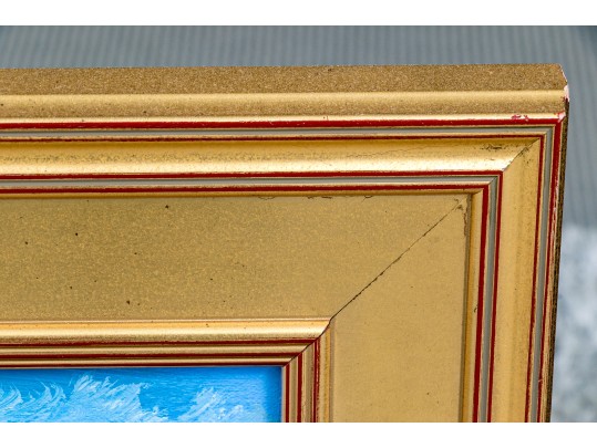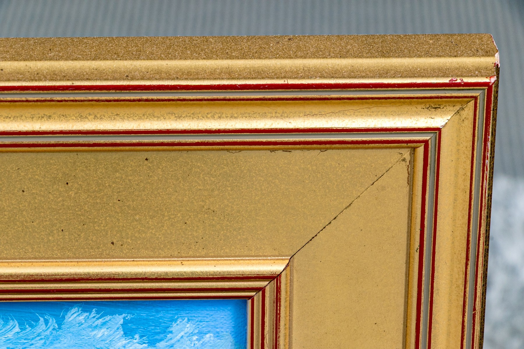 The canvas has bunched up on one end with extra material and would benefit from restretching/reframing, but still presents well as it is.