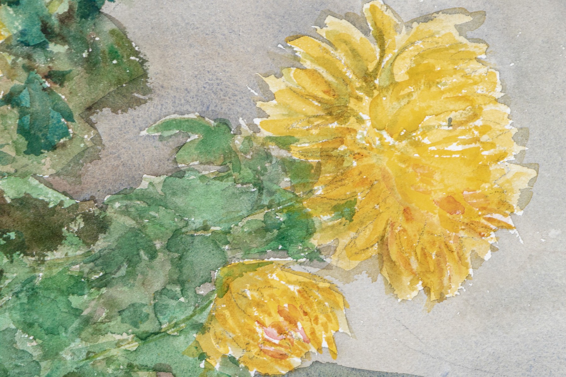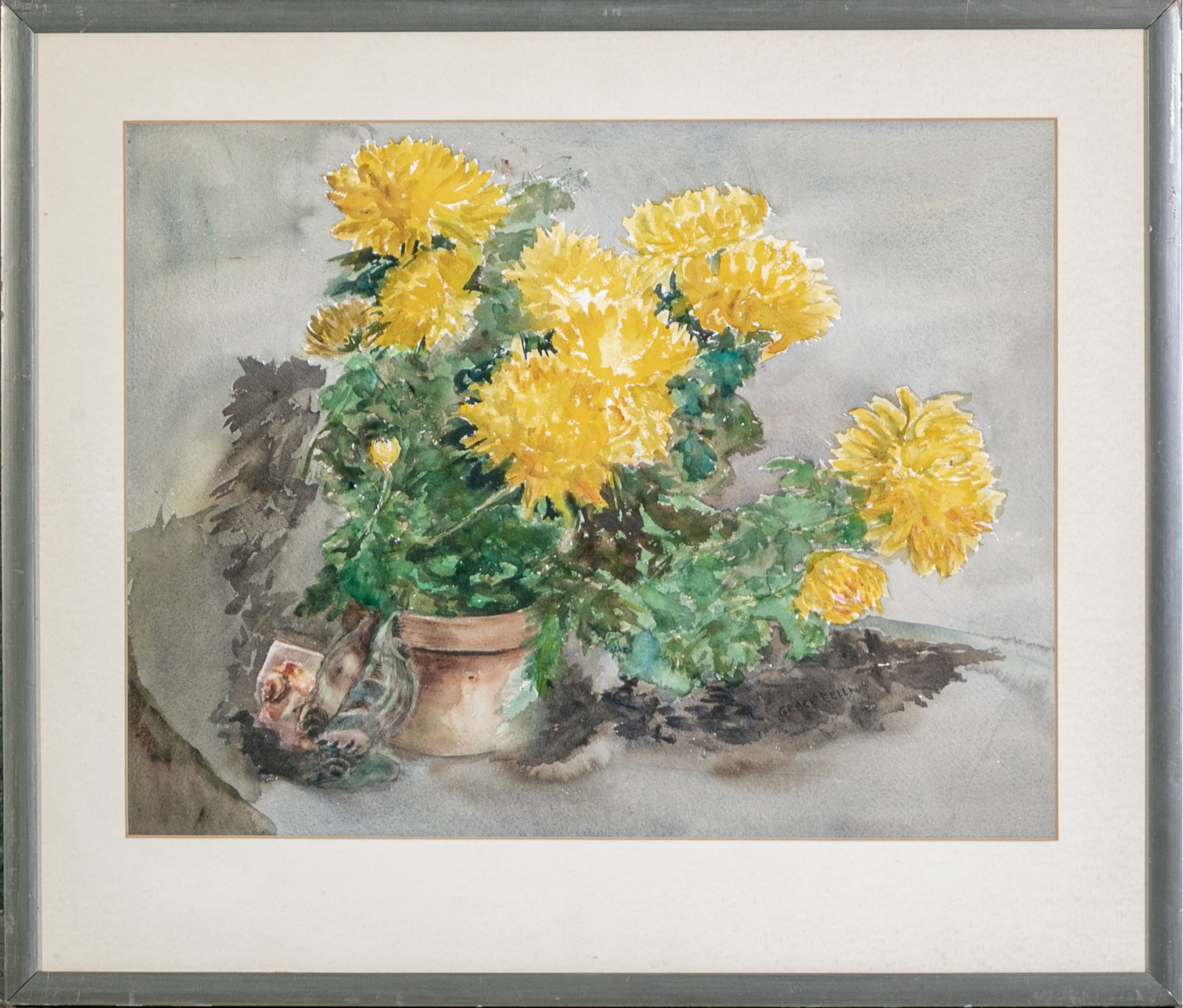 Signed lower right. A lovely colorful still life with a pot of yellow chrysanthemums on a table.