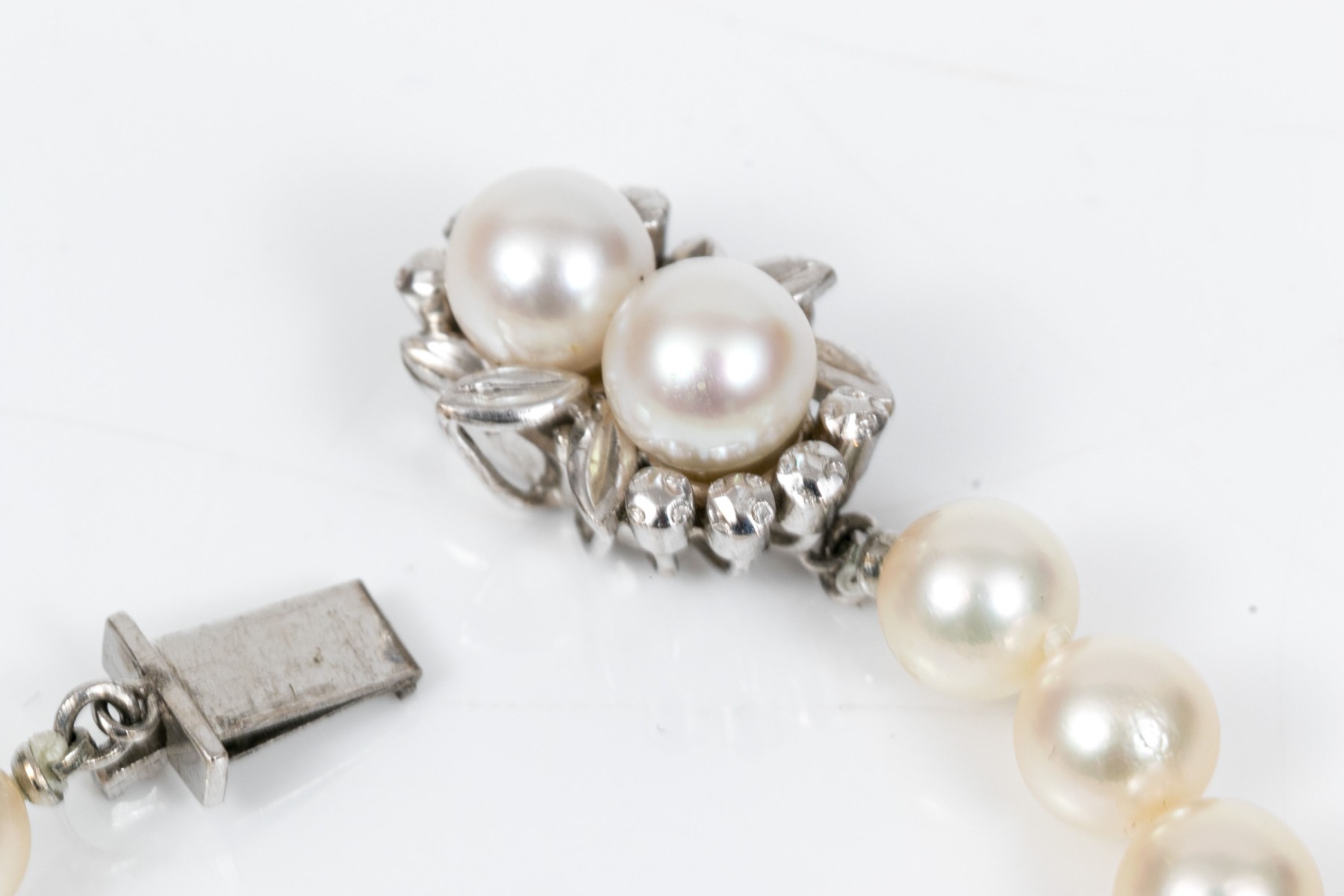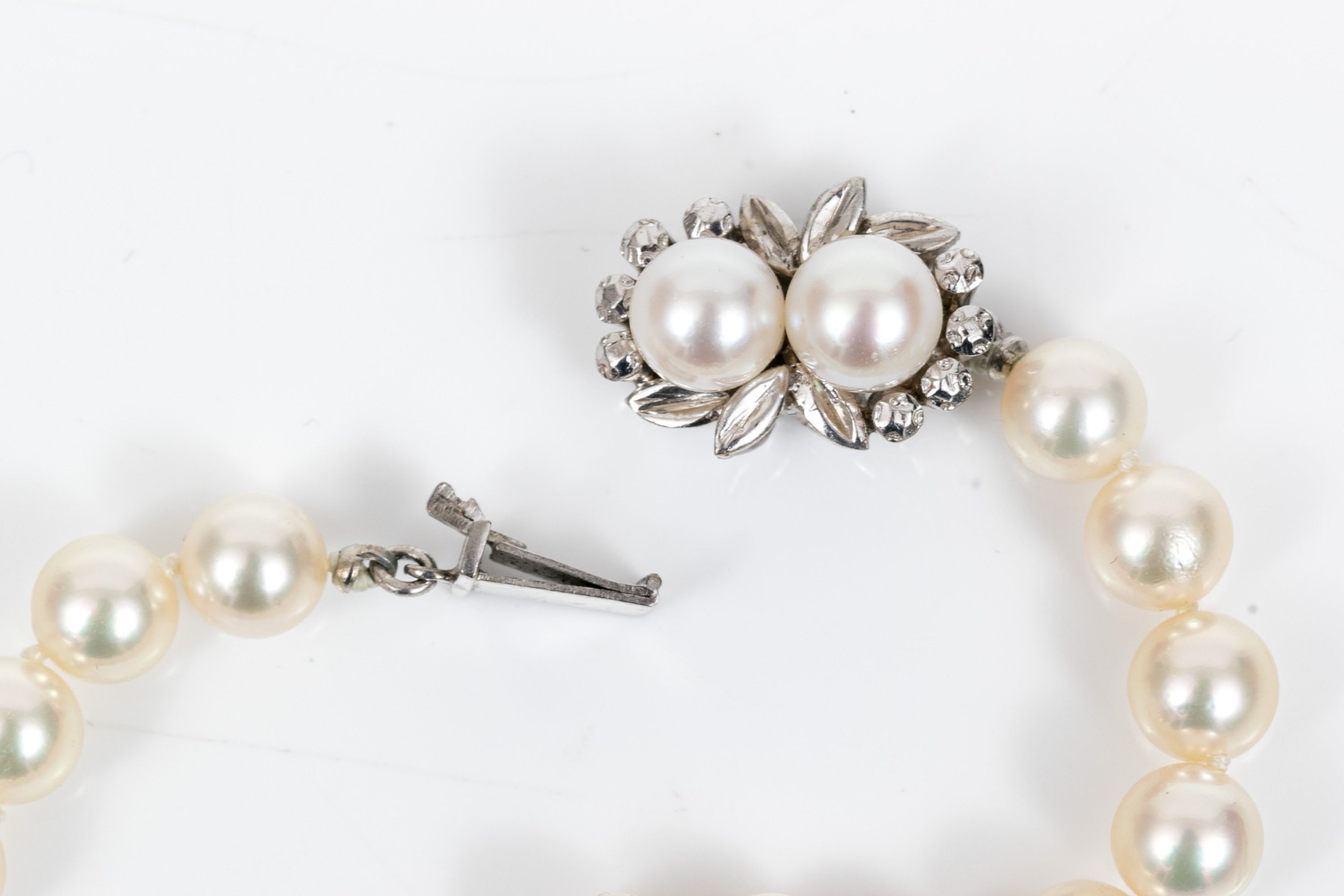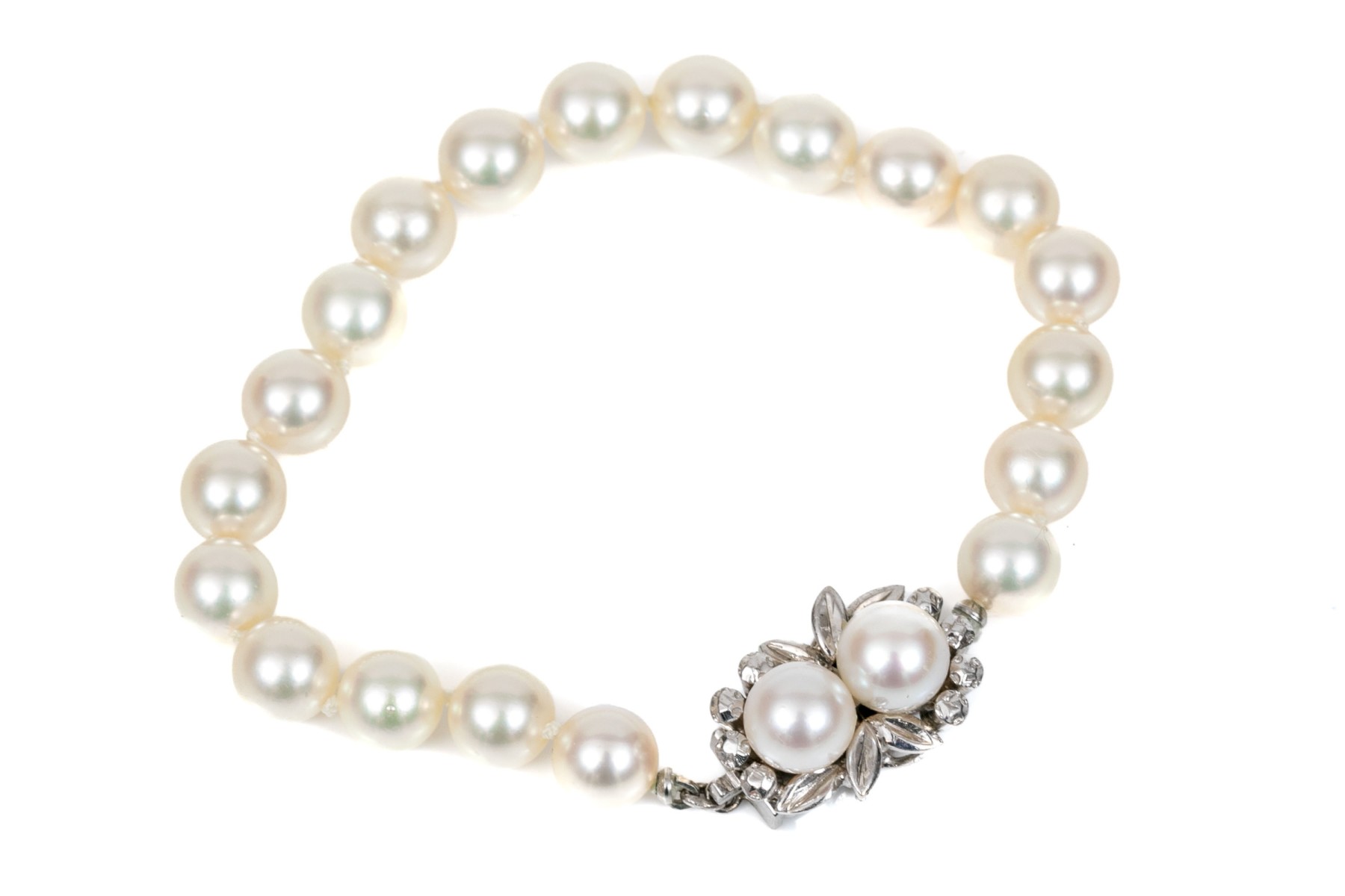 Cultured freshwater pearl strung bracelet. This graceful bracelet display bright white pearls averaging 7.4mm. Two matching pearls are set into floral designed the box style clasp.
