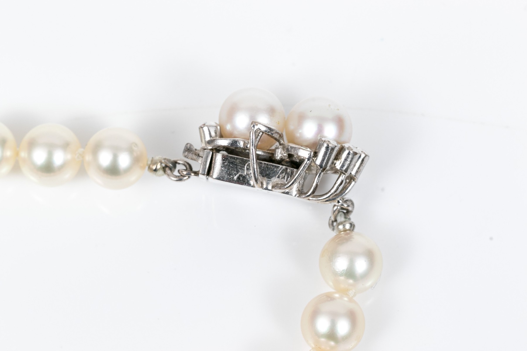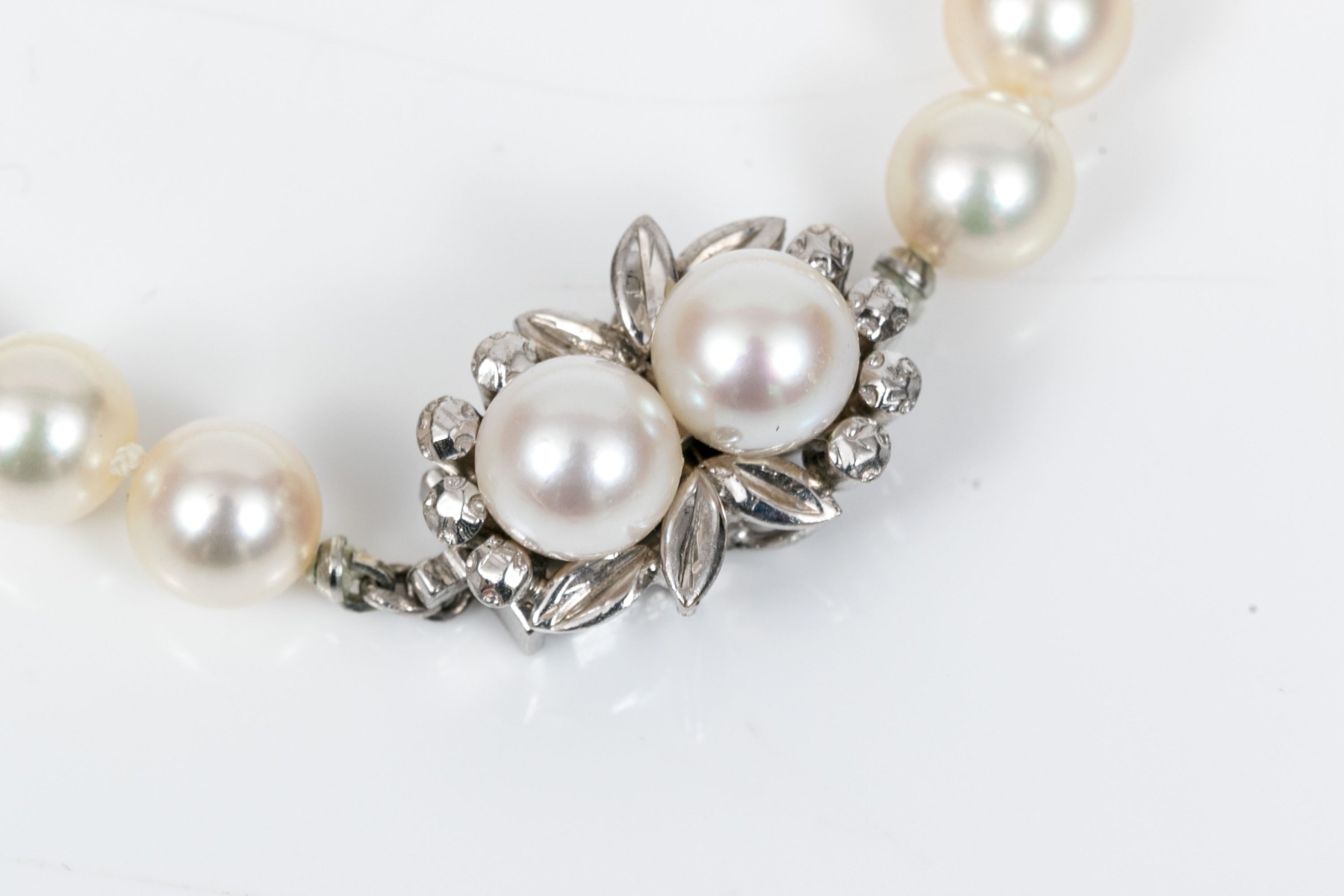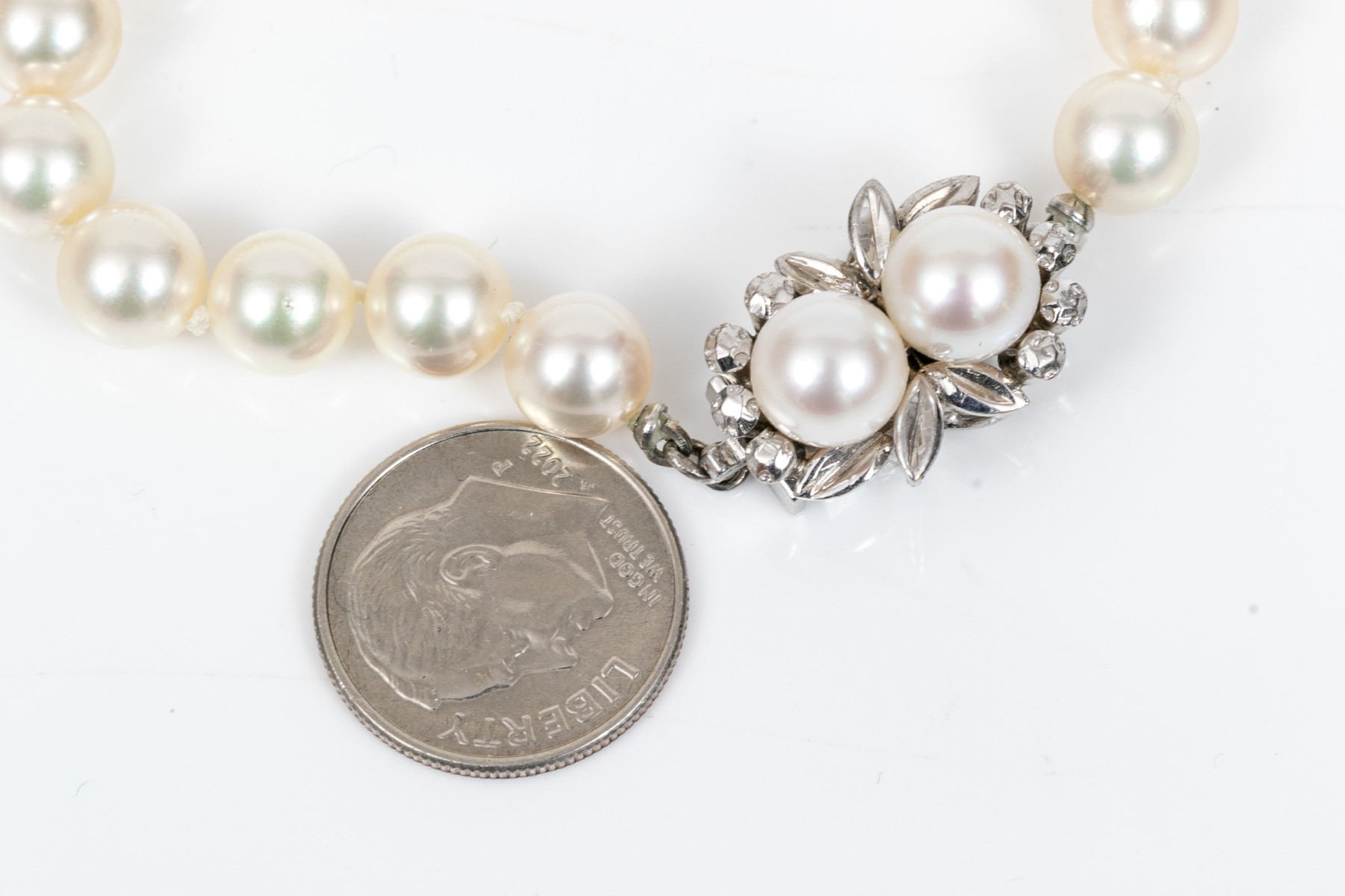 Cultured freshwater pearl strung bracelet. This graceful bracelet display bright white pearls averaging 7.4mm. Two matching pearls are set into floral designed the box style clasp.