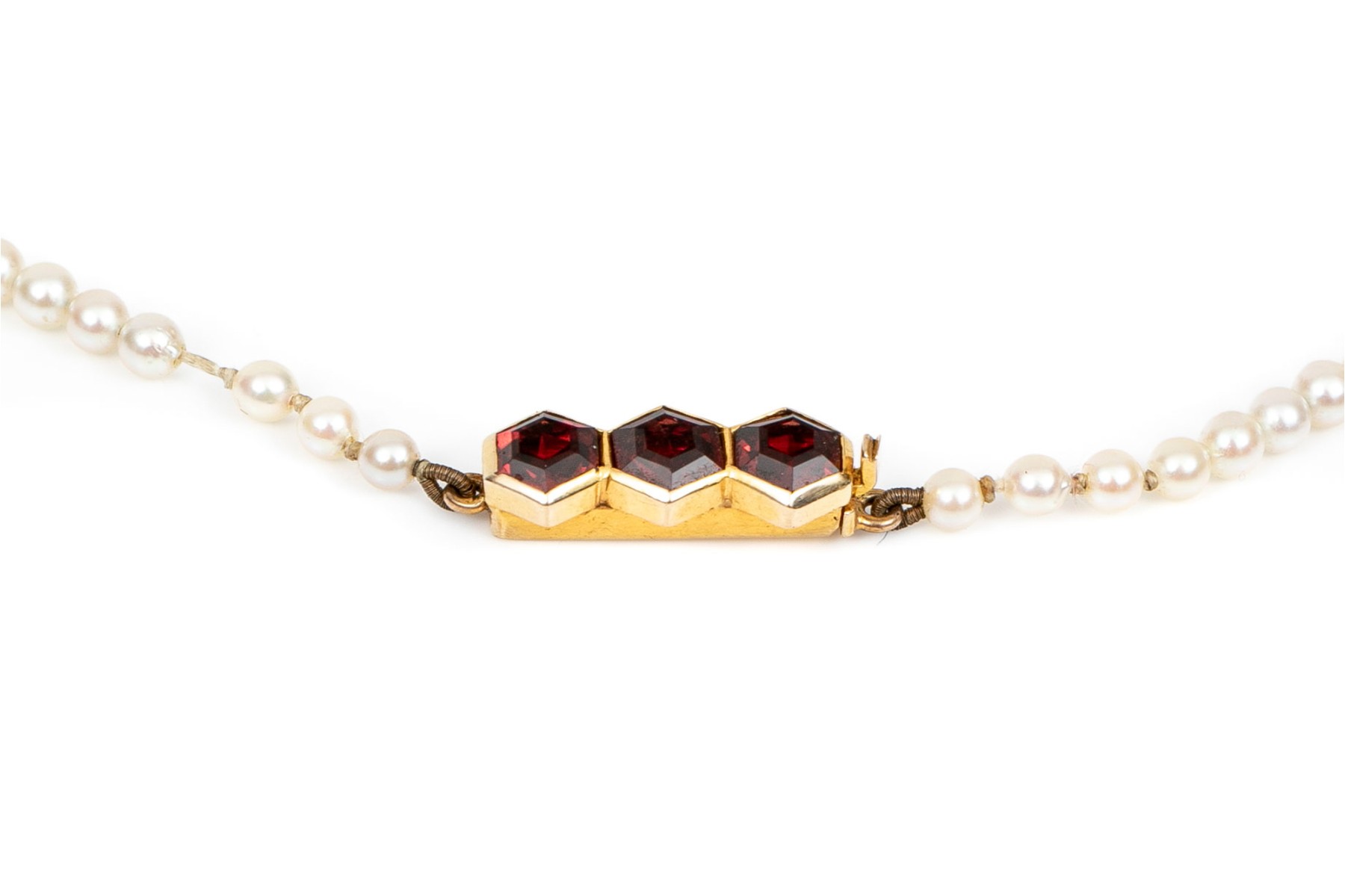 A graduated cultured freshwater pearl necklace. These ivory white cultured pearls range from 3mm to 7mm. The box style clasp is a 14K yellow gold and is set with three hexagonal cut garnets.