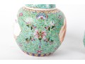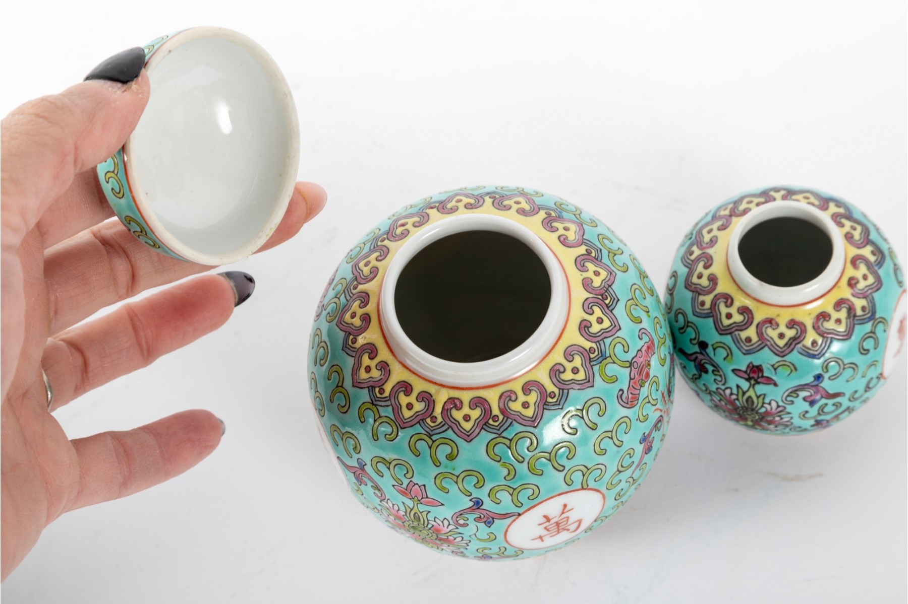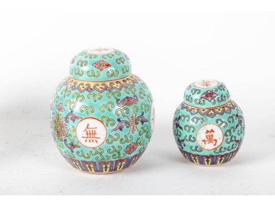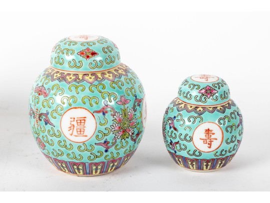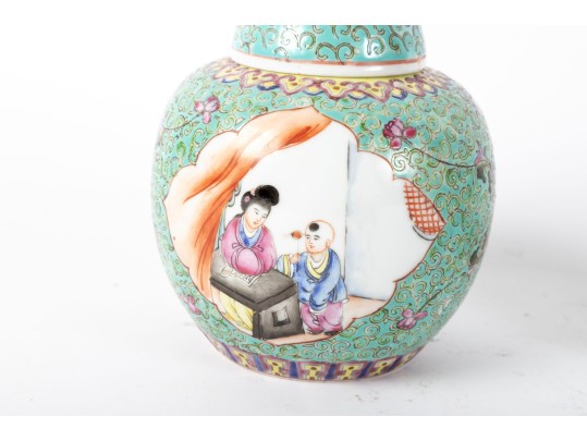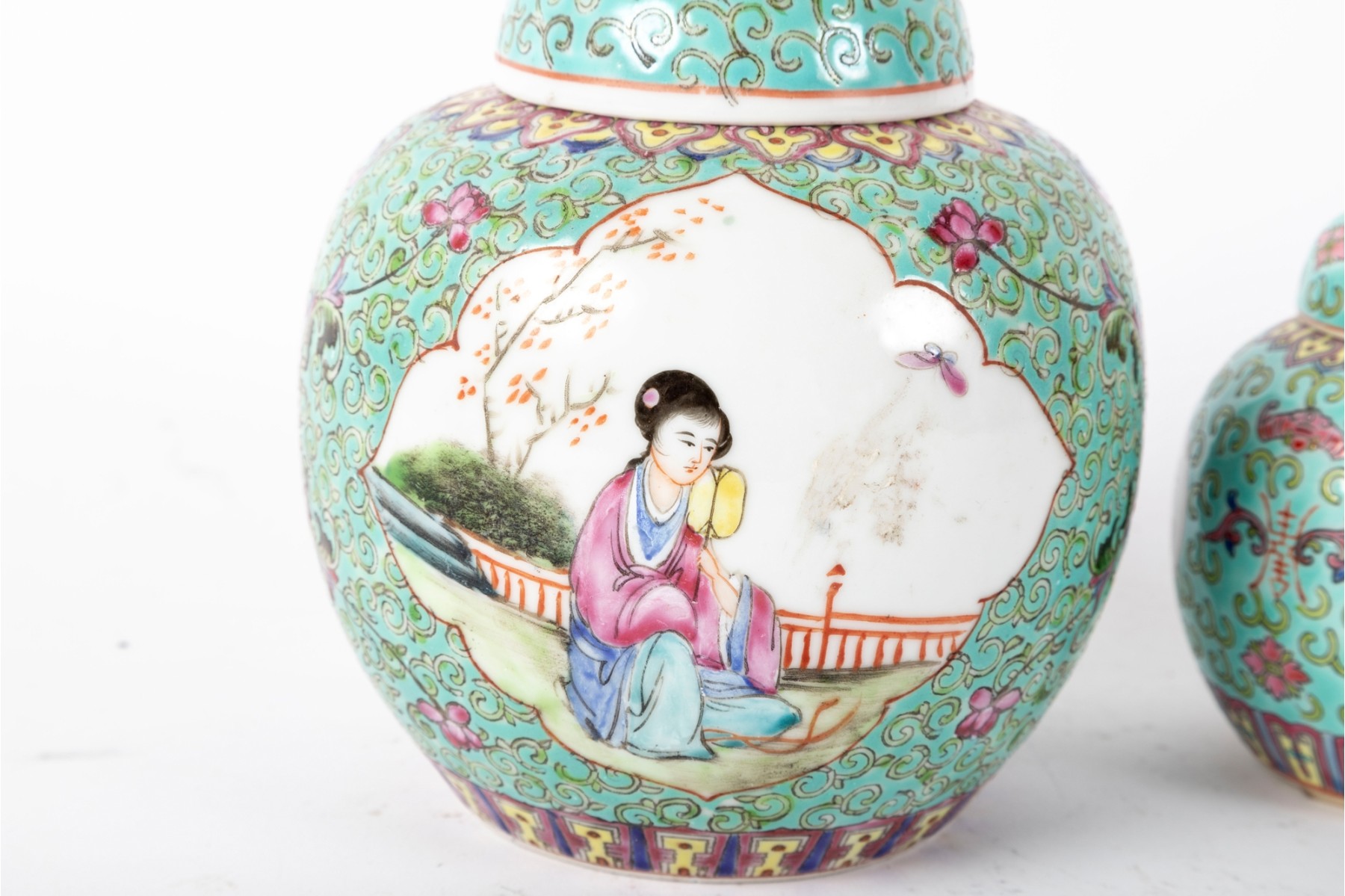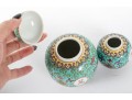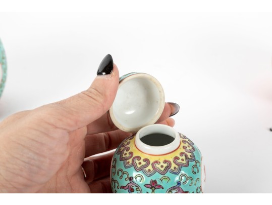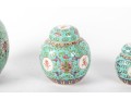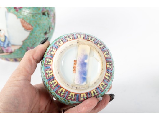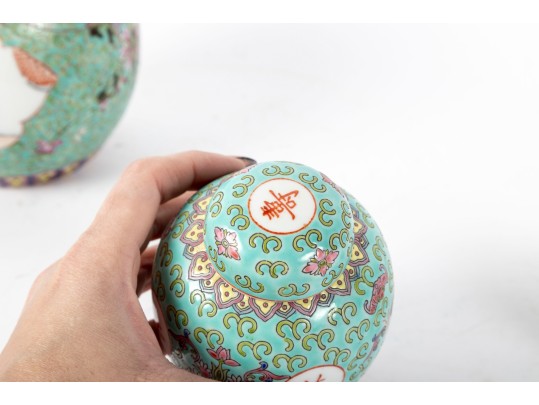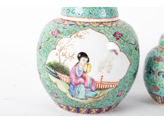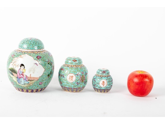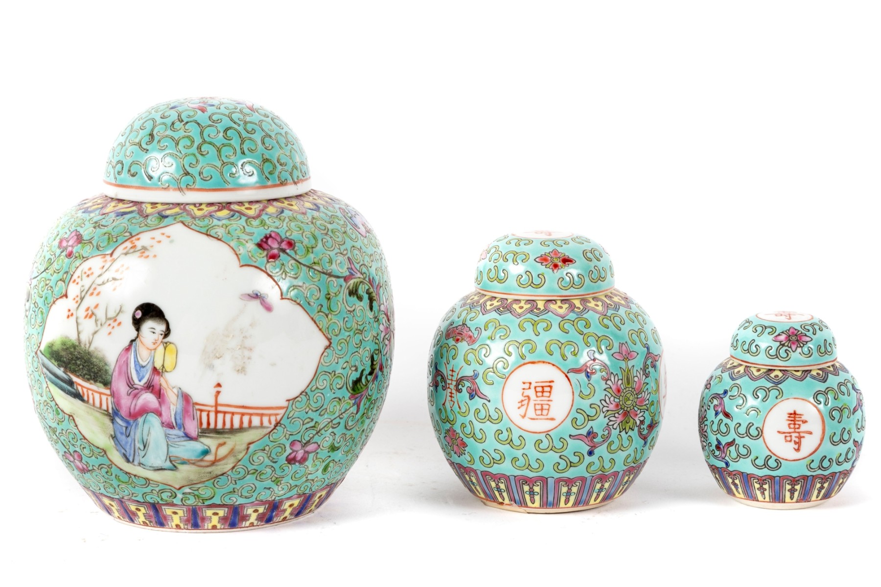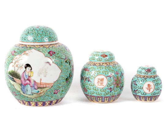 A set of three Chinese lidded porcelain jars with a turquoise enameled background, decorated with intricate floral and cloud motifs. The largest jar features a hand-painted scene of a seated woman in traditional Chinese attire, while the two smaller jars display Chinese calligraphy in circular cartouches. Multiple seals and marks -- see photos for details.
