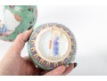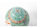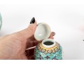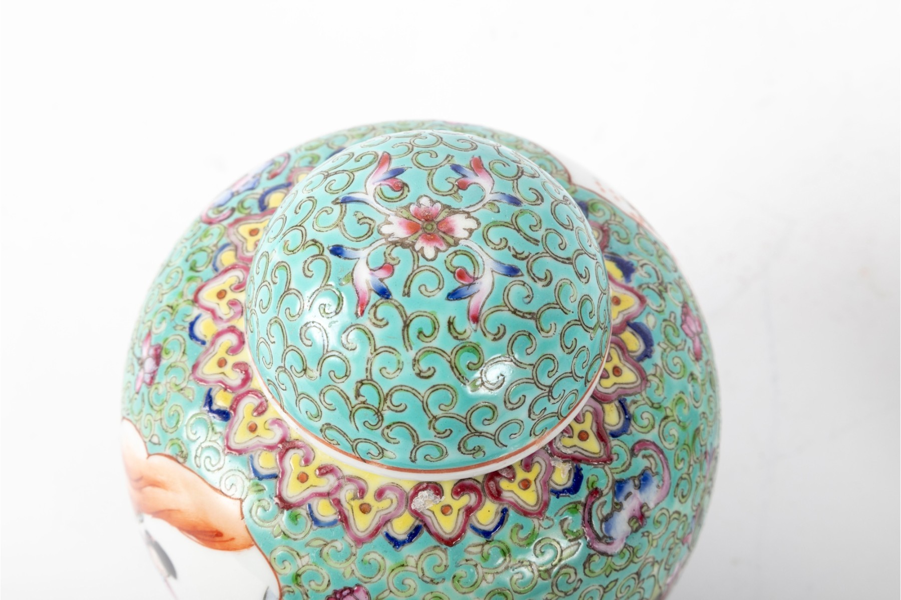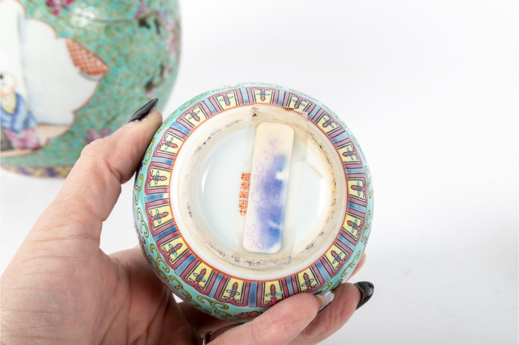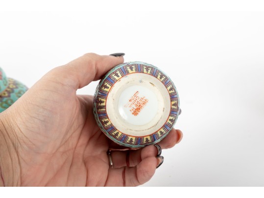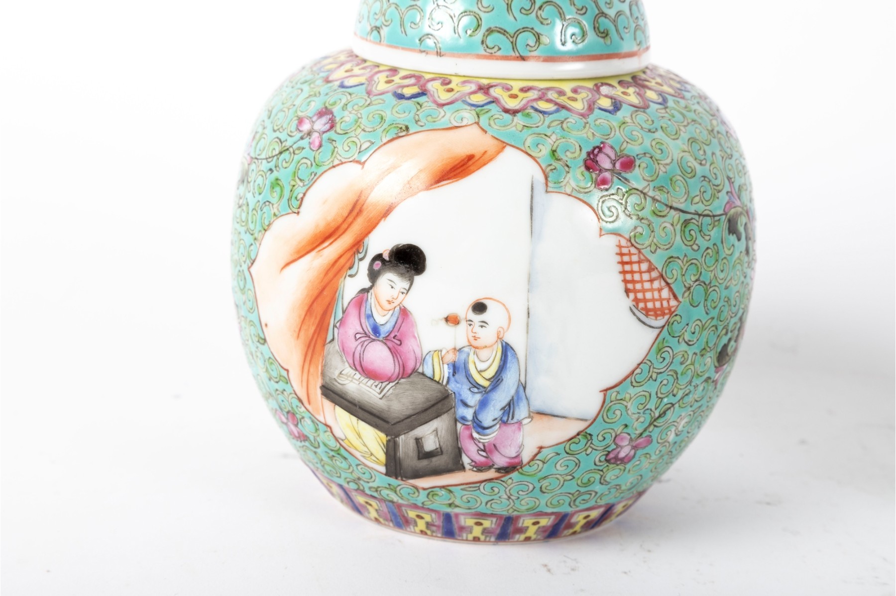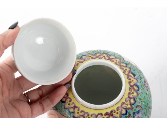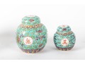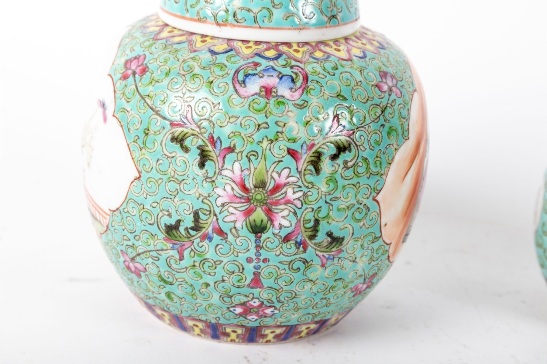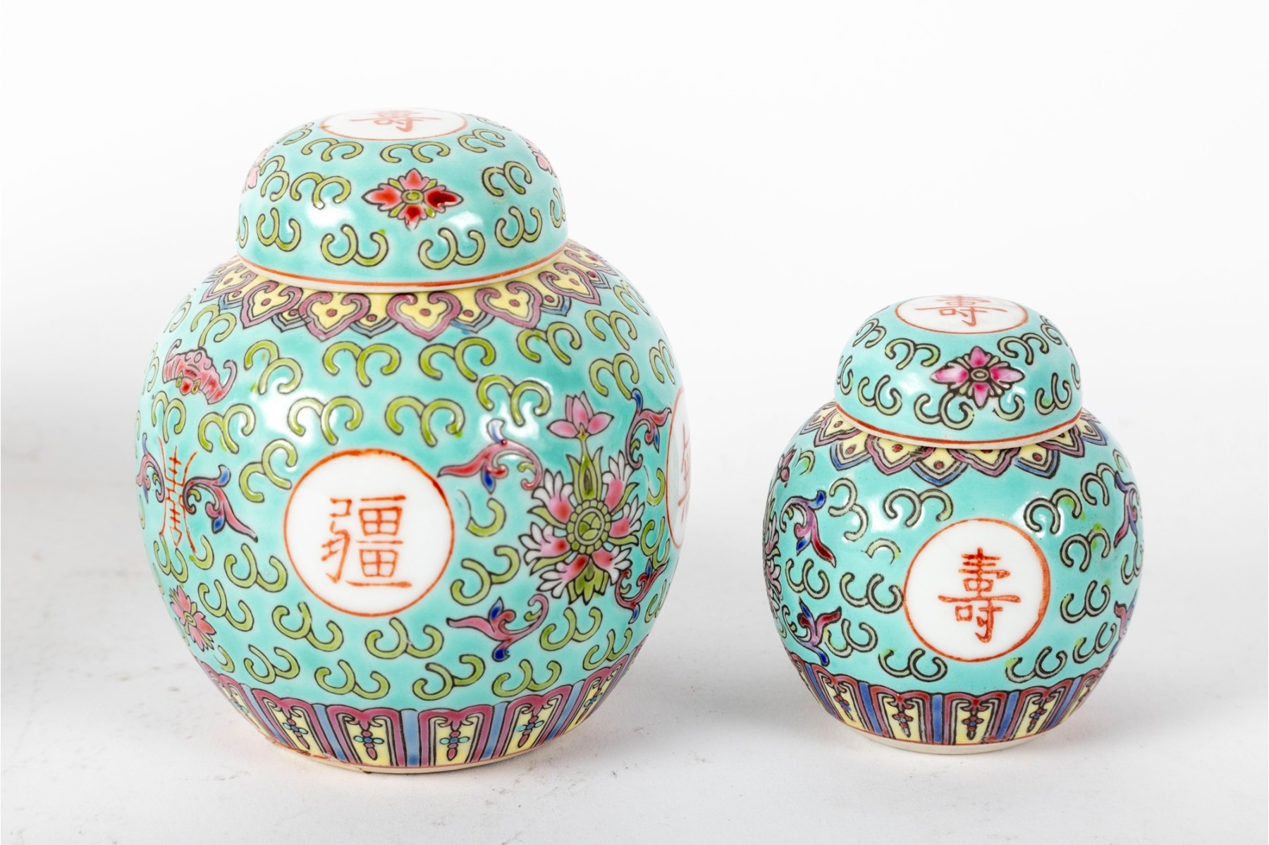 A set of three Chinese lidded porcelain jars with a turquoise enameled background, decorated with intricate floral and cloud motifs. The largest jar features a hand-painted scene of a seated woman in traditional Chinese attire, while the two smaller jars display Chinese calligraphy in circular cartouches. Multiple seals and marks -- see photos for details.