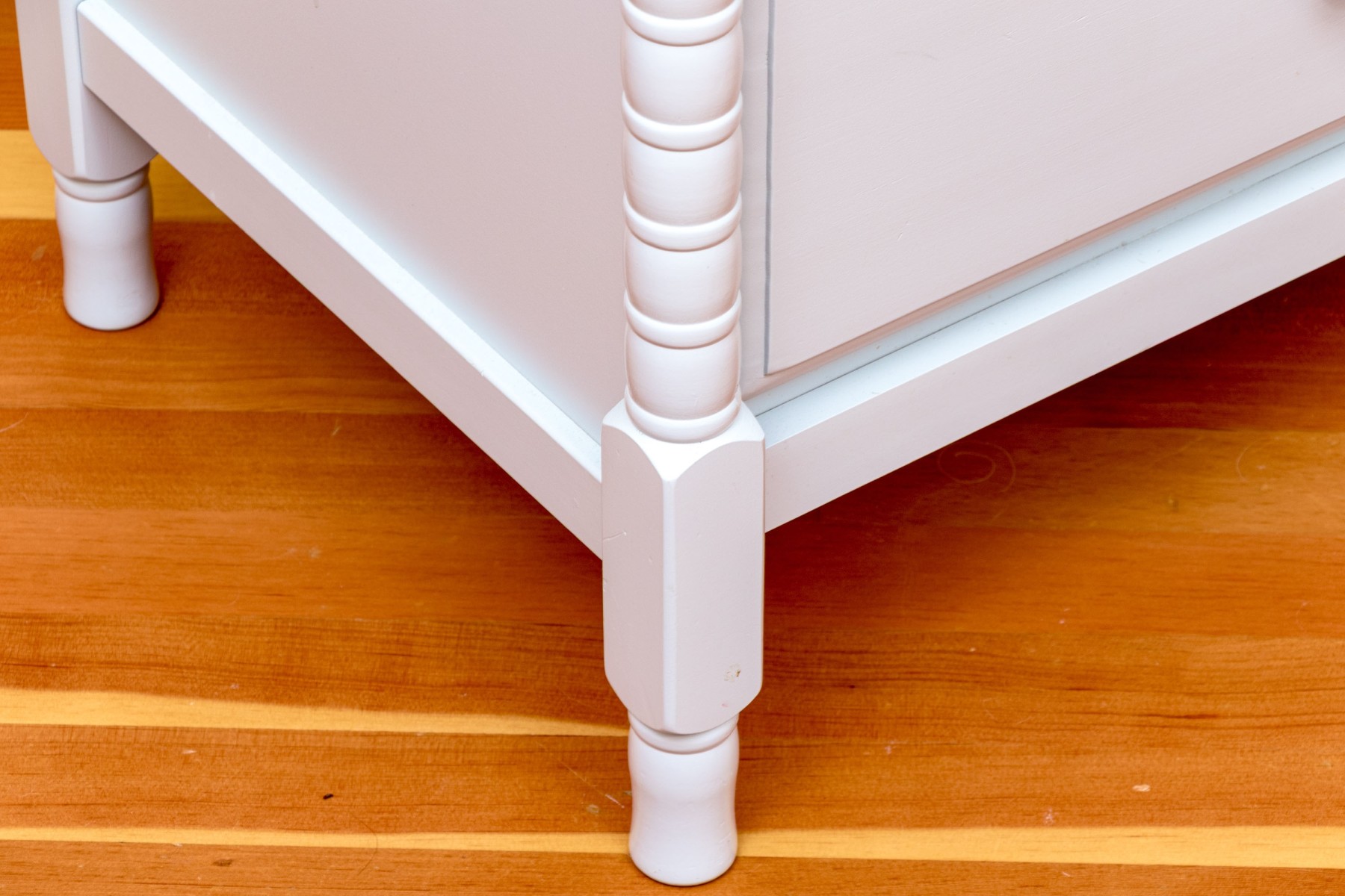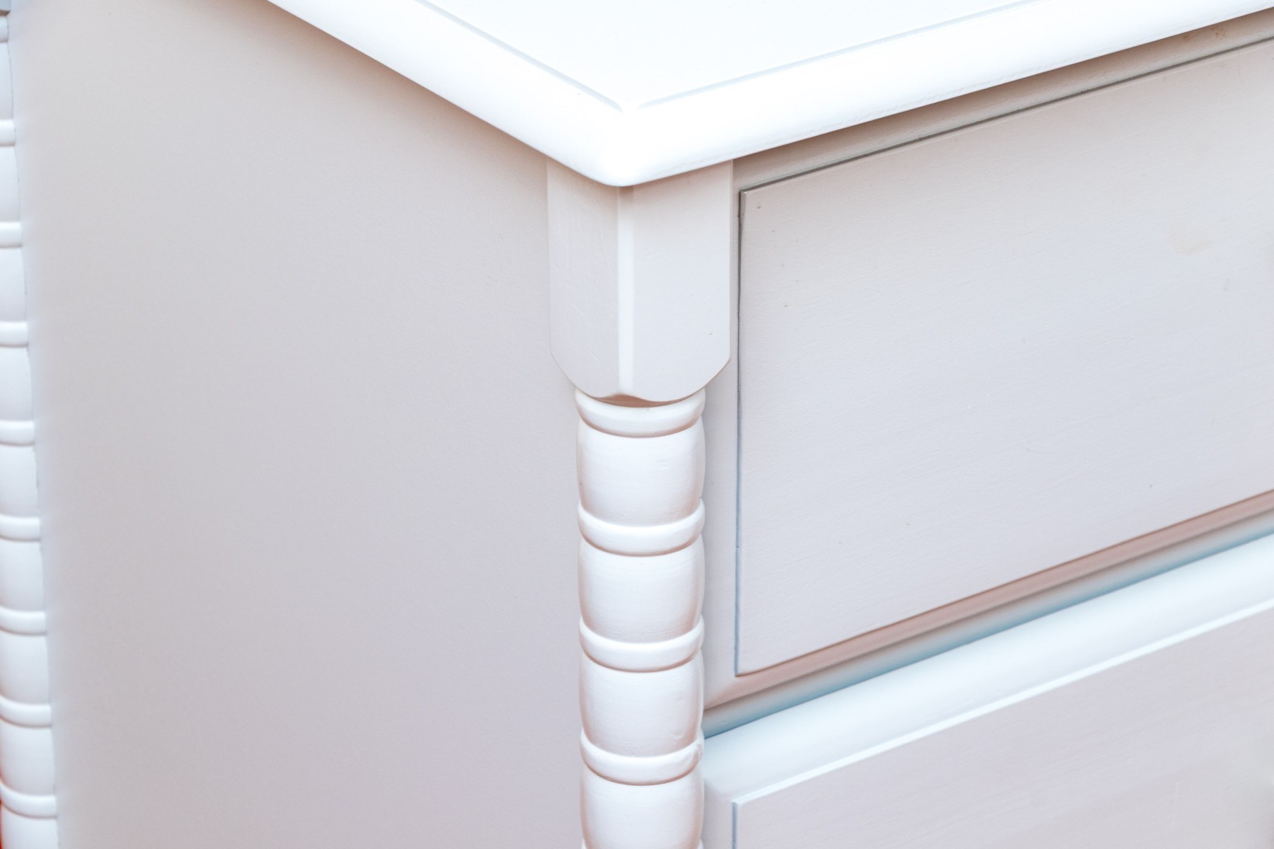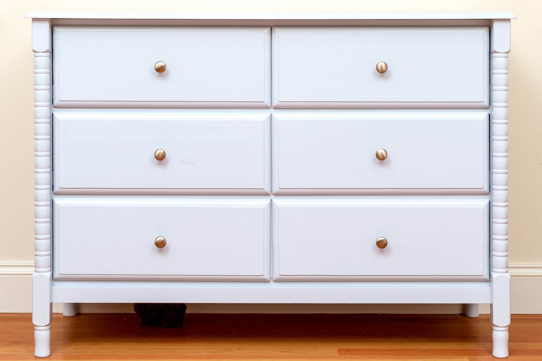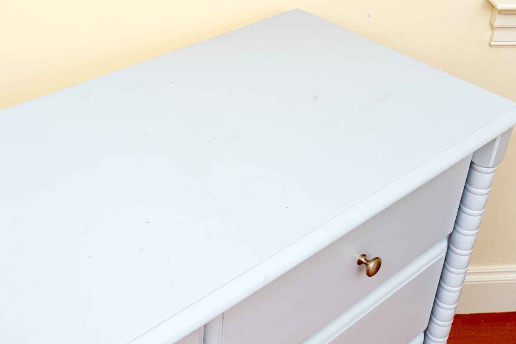 A handsome dresser, likely DaVinci Jenny Lind, designed in chic transitional style with a touch of traditional elegance. The dresser is painted in pale gray and sports a rectangular top with a rounded bevel edge overhanging two bays of three drawer each adorned with brass tone circular knobs. The dresser is supported by nicely turned spindle posts on thick arrow feet.