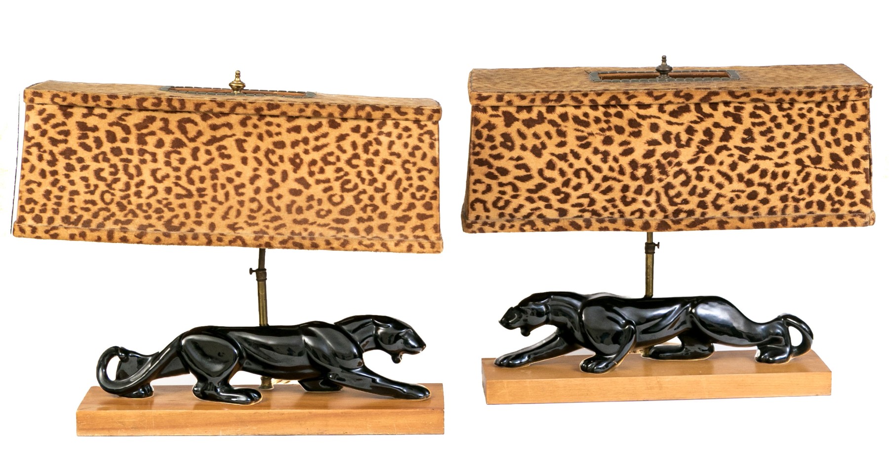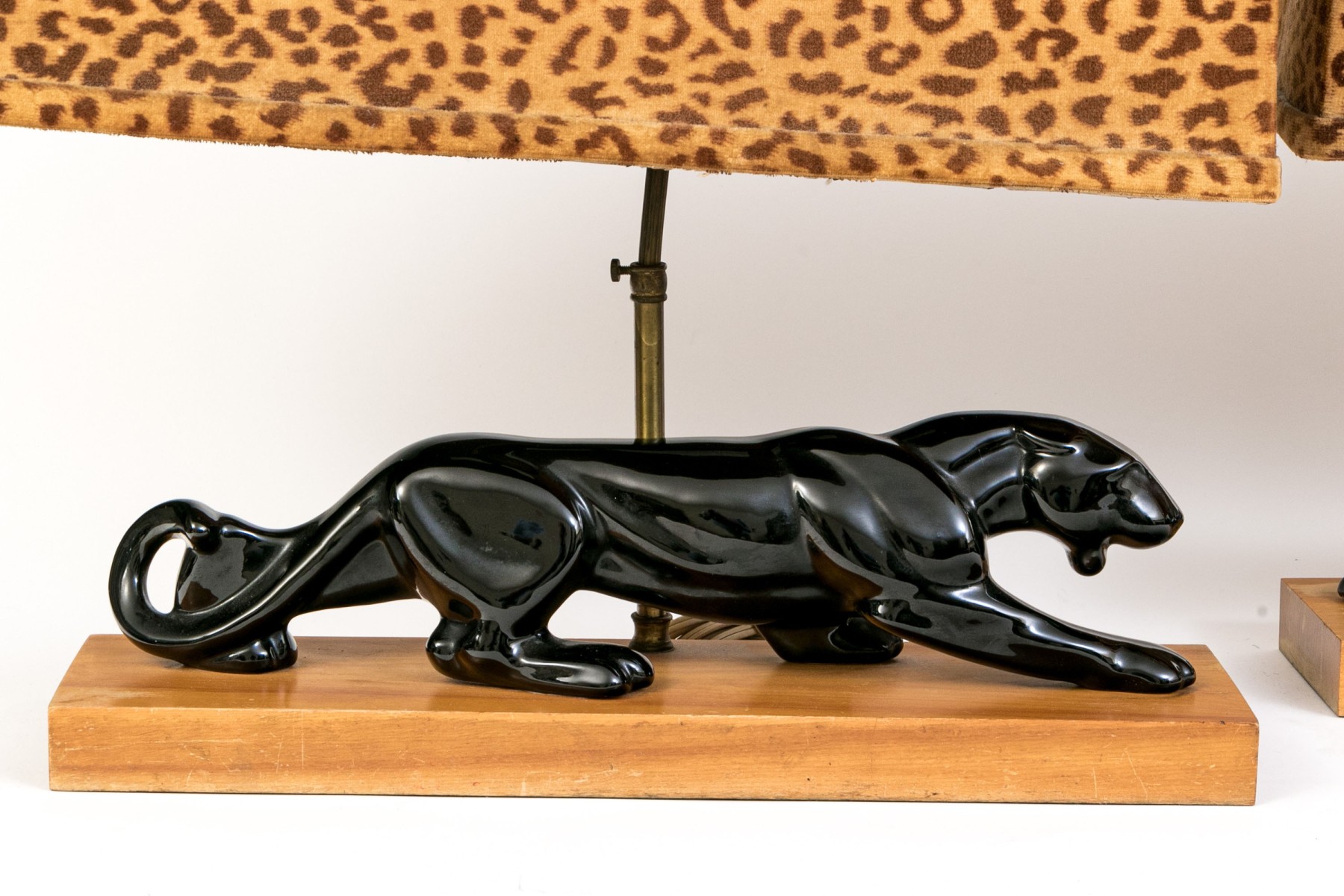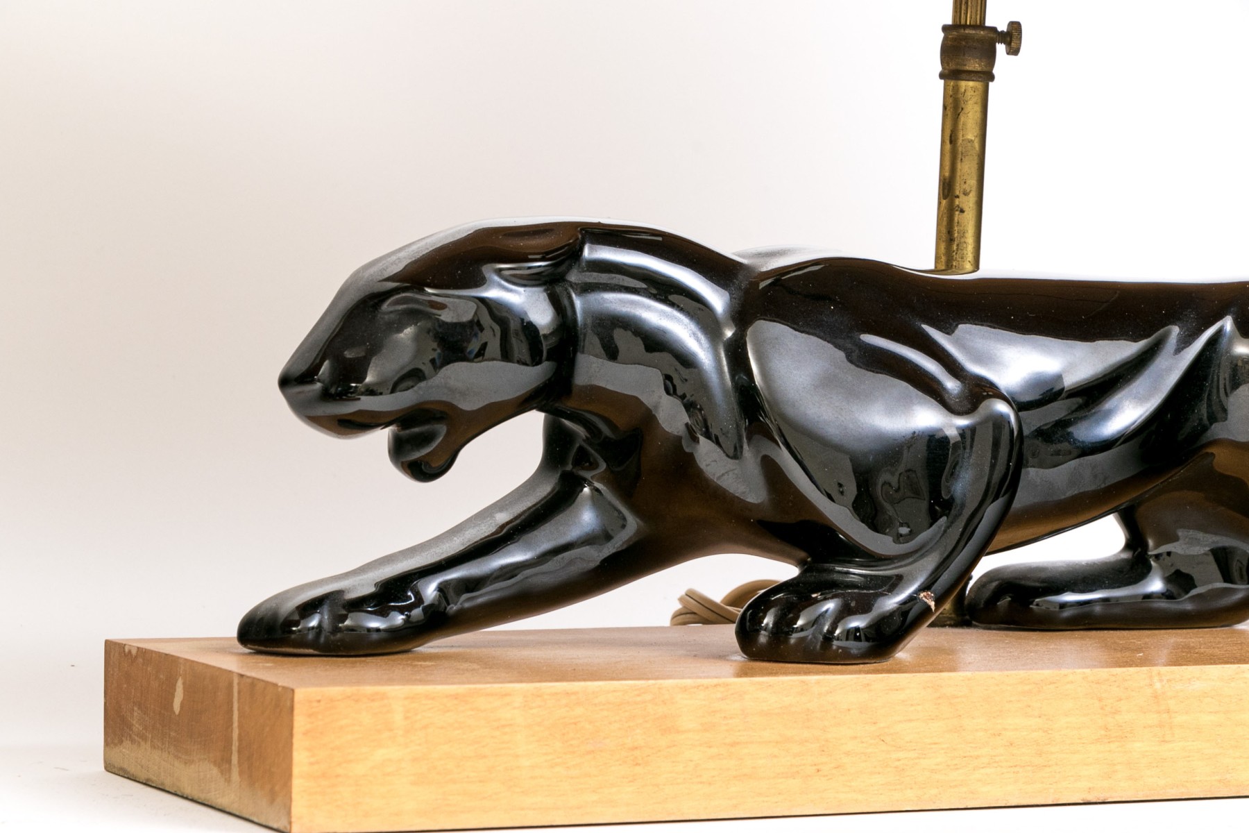 Presented on natural finished wooden bases, the black finished ceramic jaguars have been mounted as table lamps.
