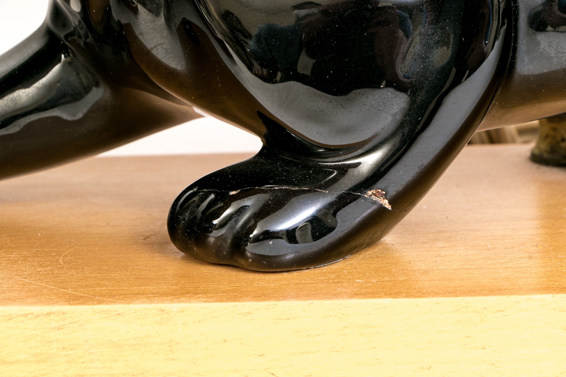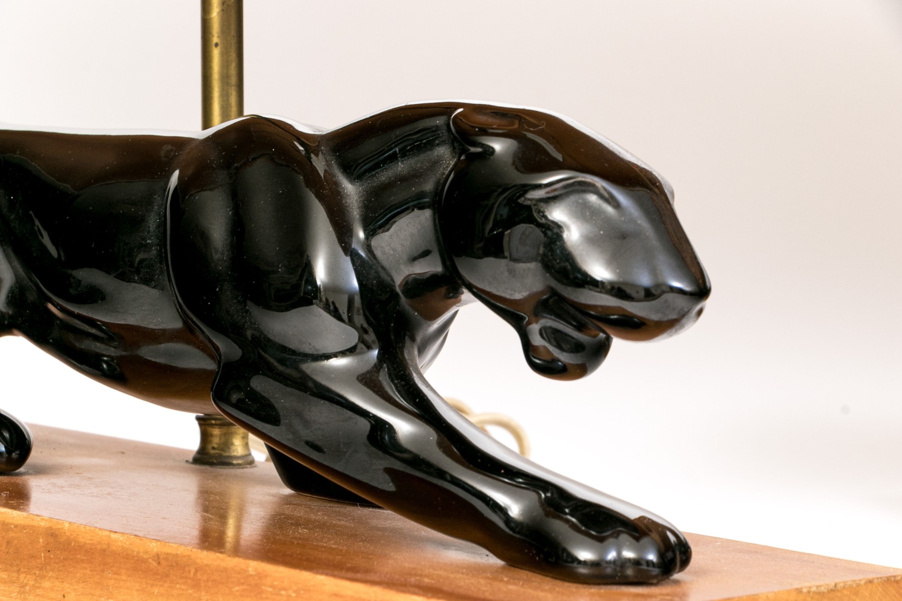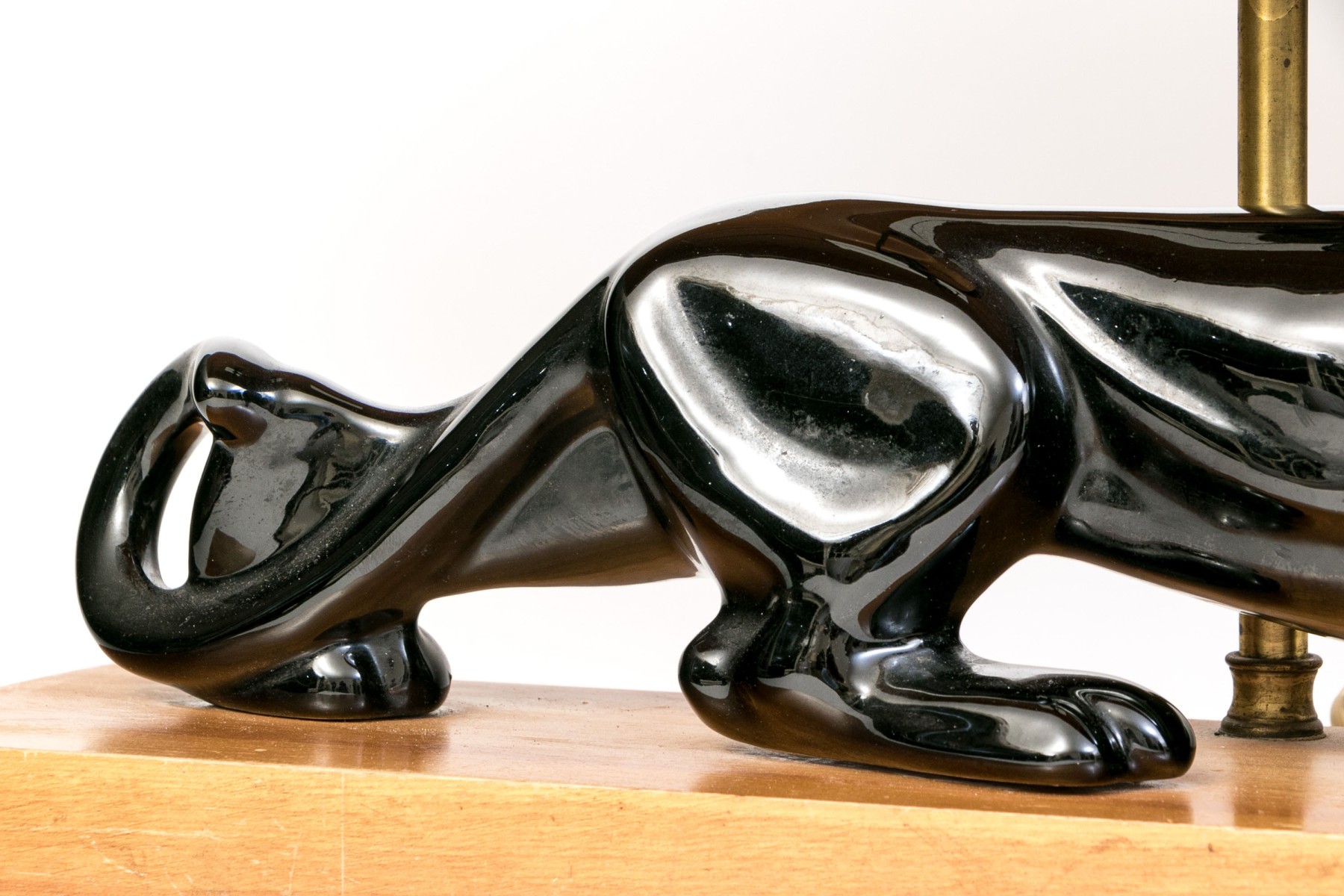 Presented on natural finished wooden bases, the black finished ceramic jaguars have been mounted as table lamps.