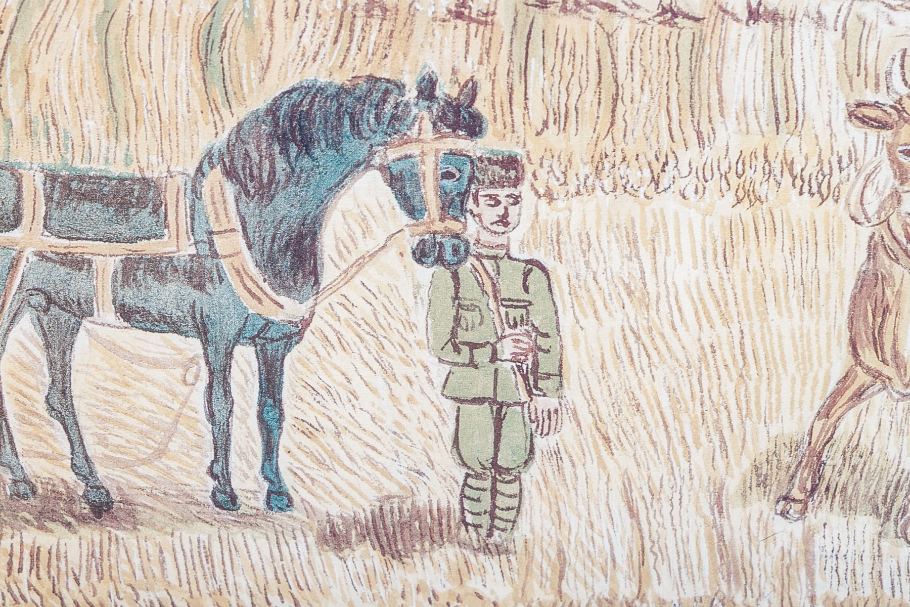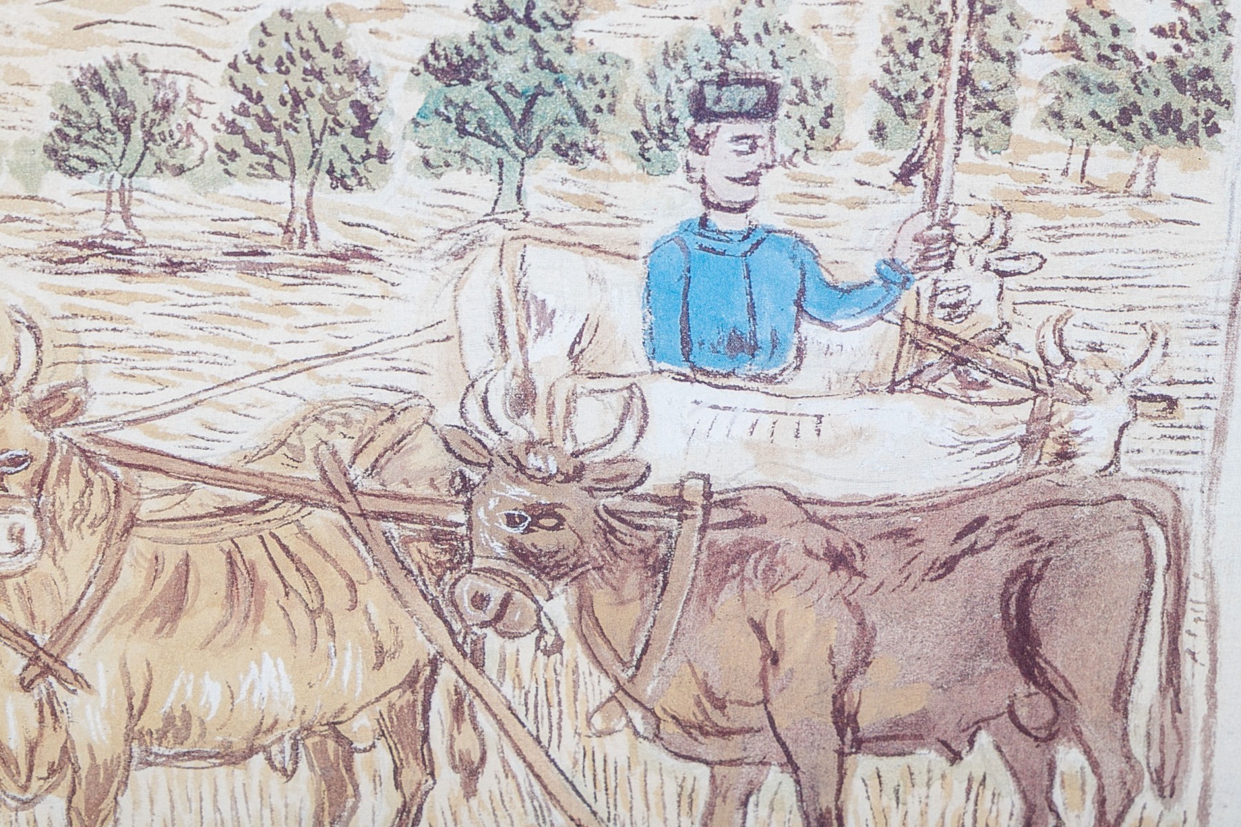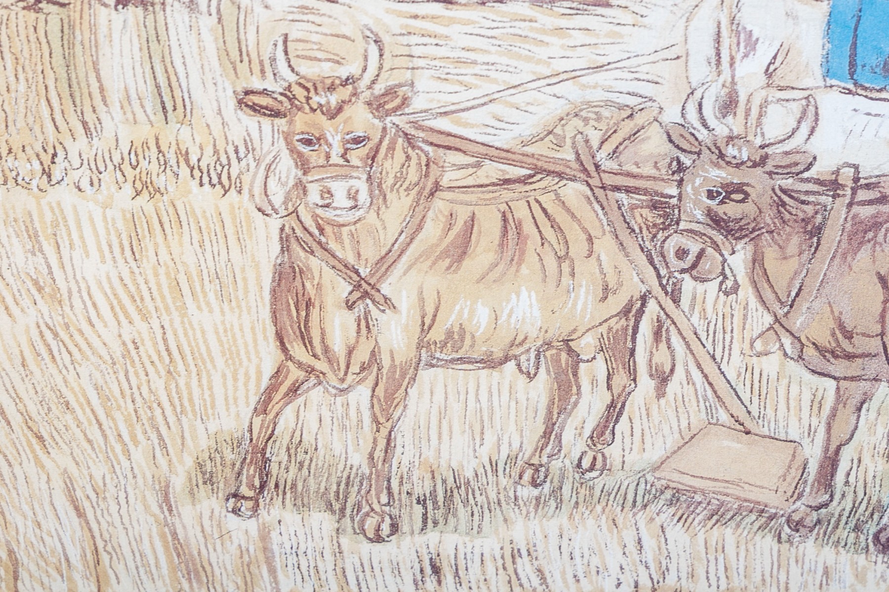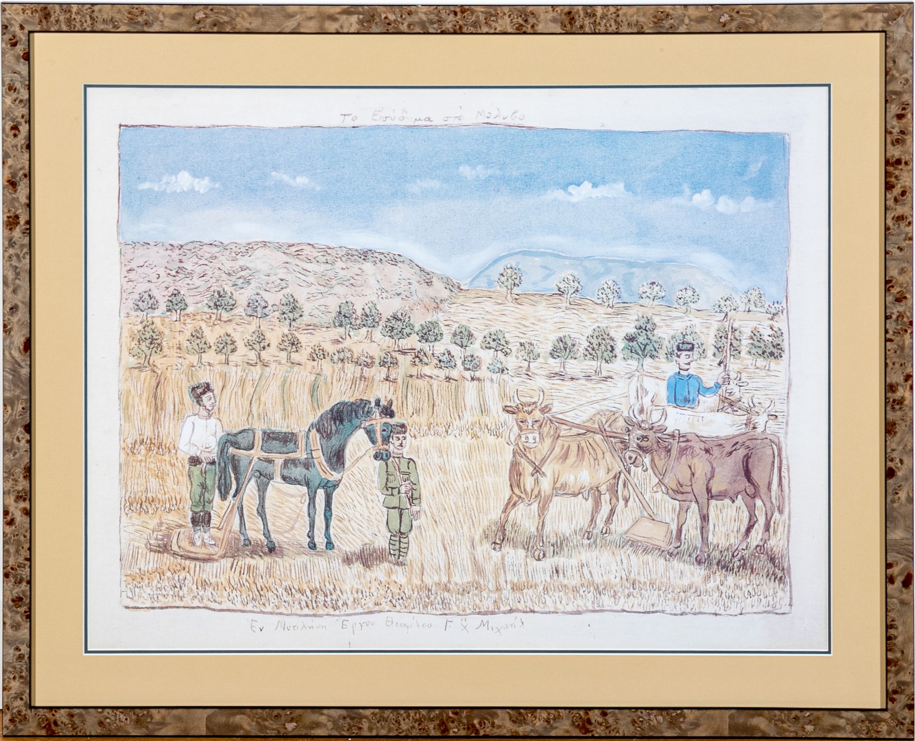 Print depicting field farmers with oxen and horse. Labeled in Greek above and below.