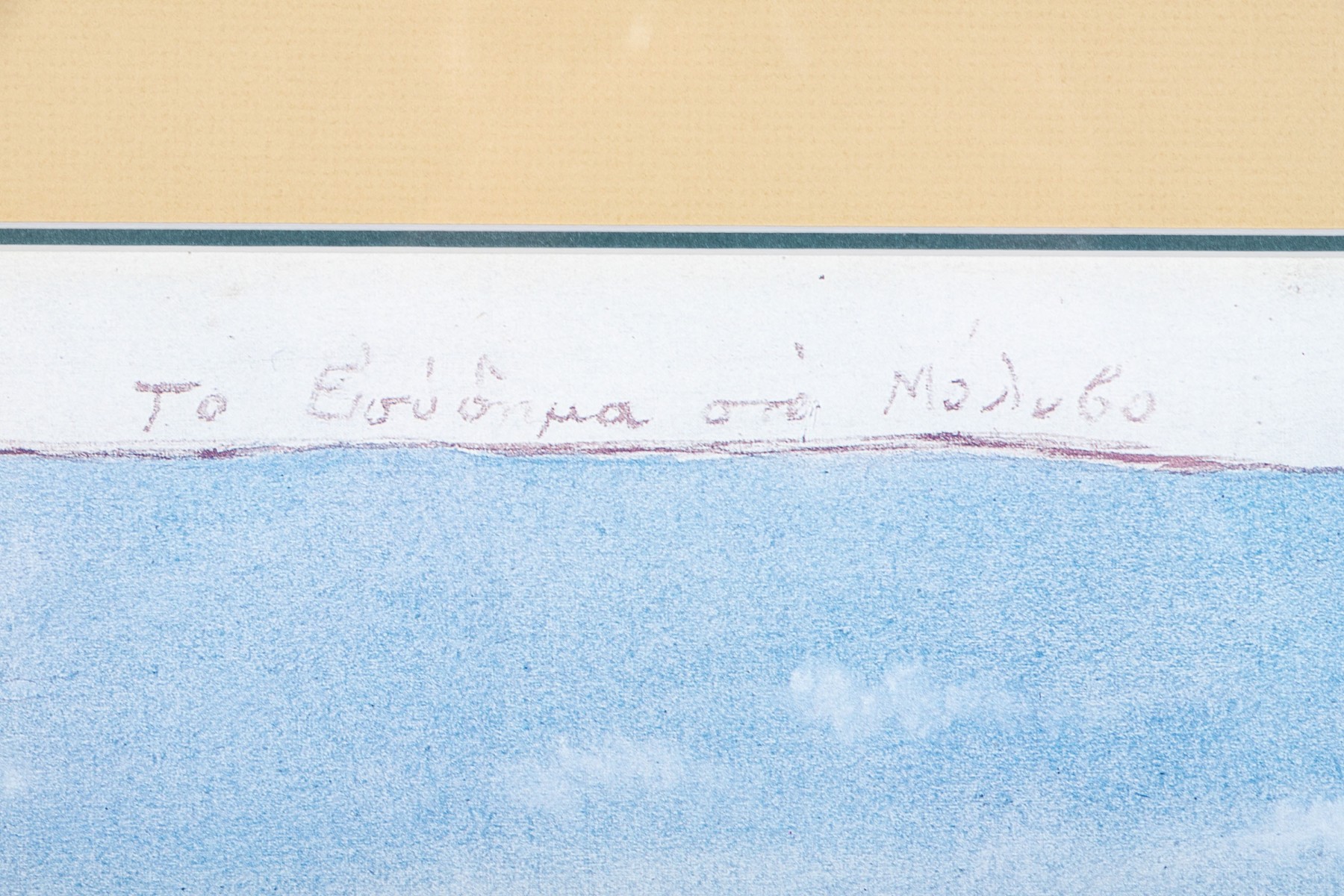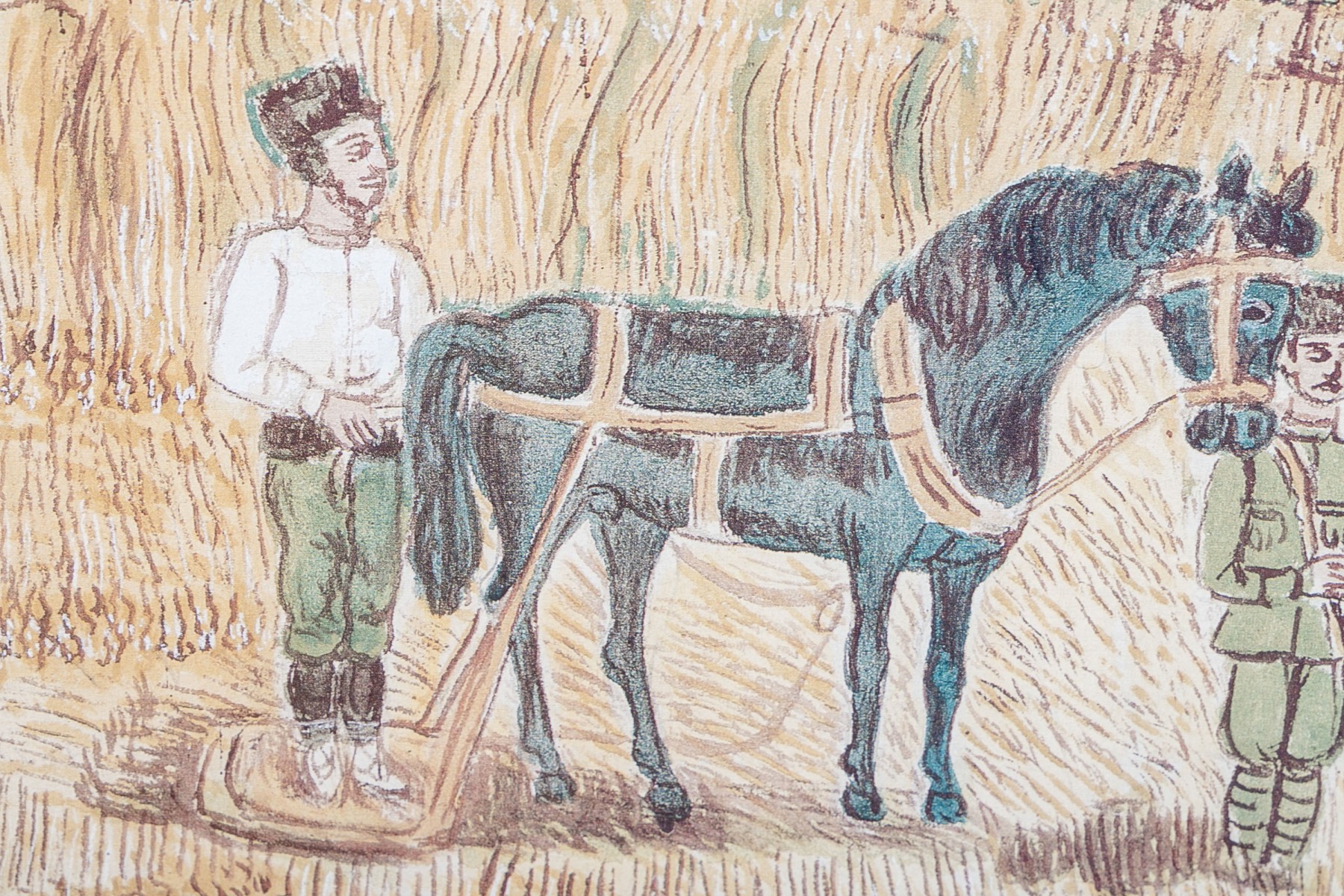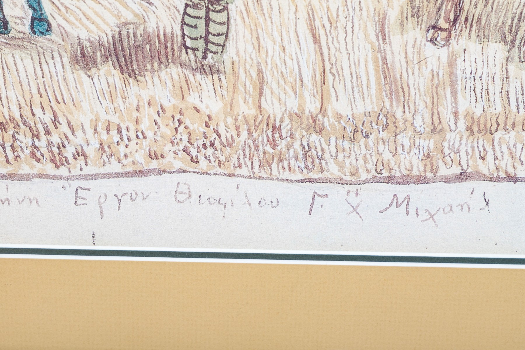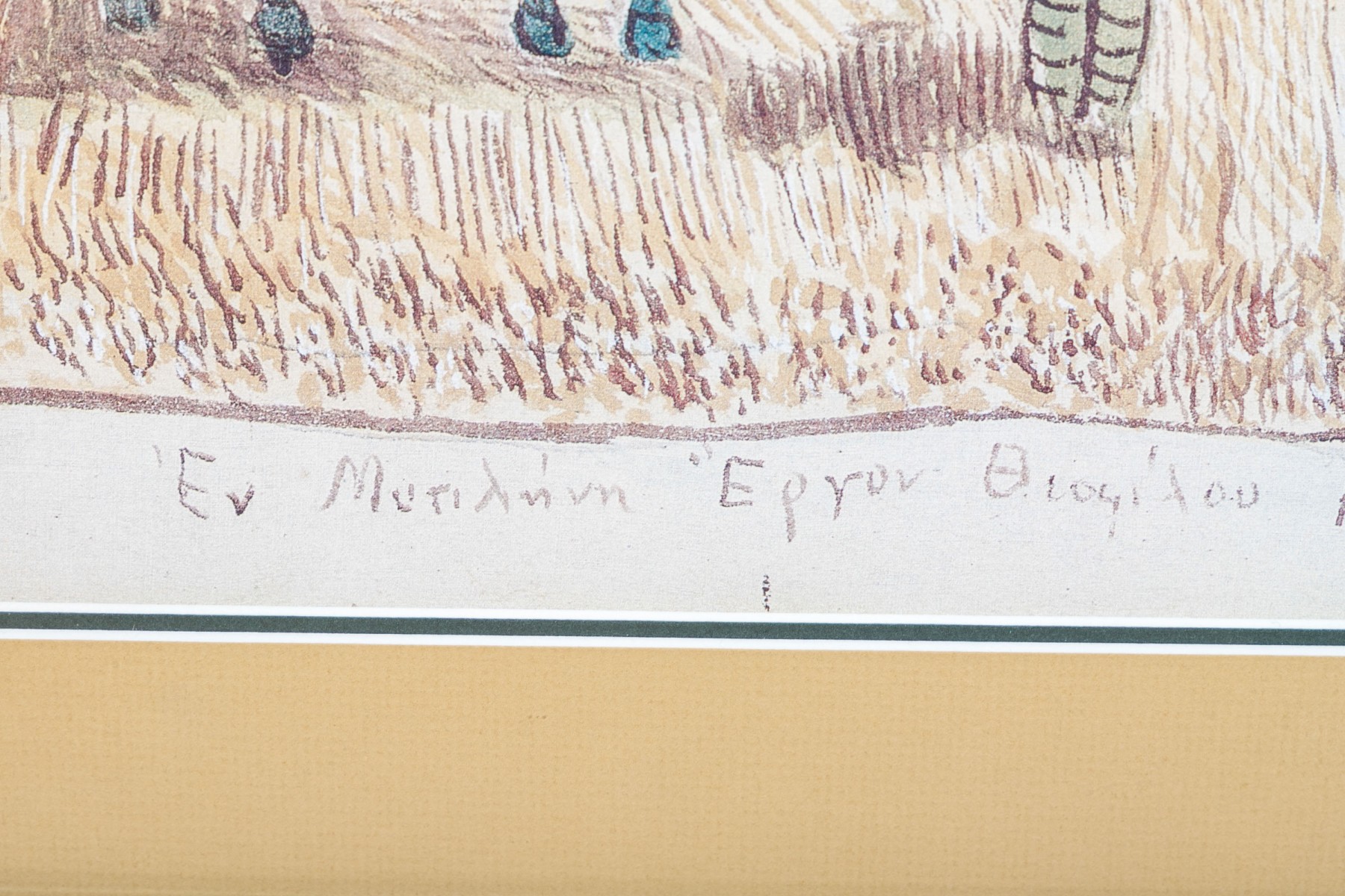Print depicting field farmers with oxen and horse. Labeled in Greek above and below.