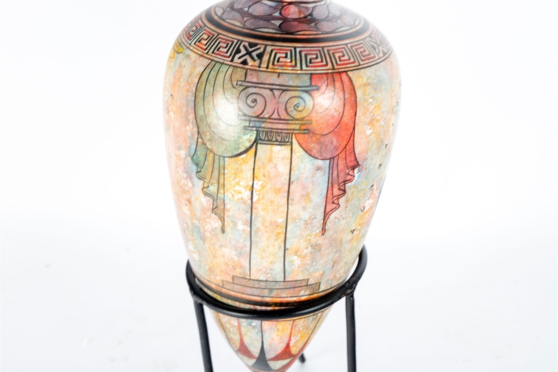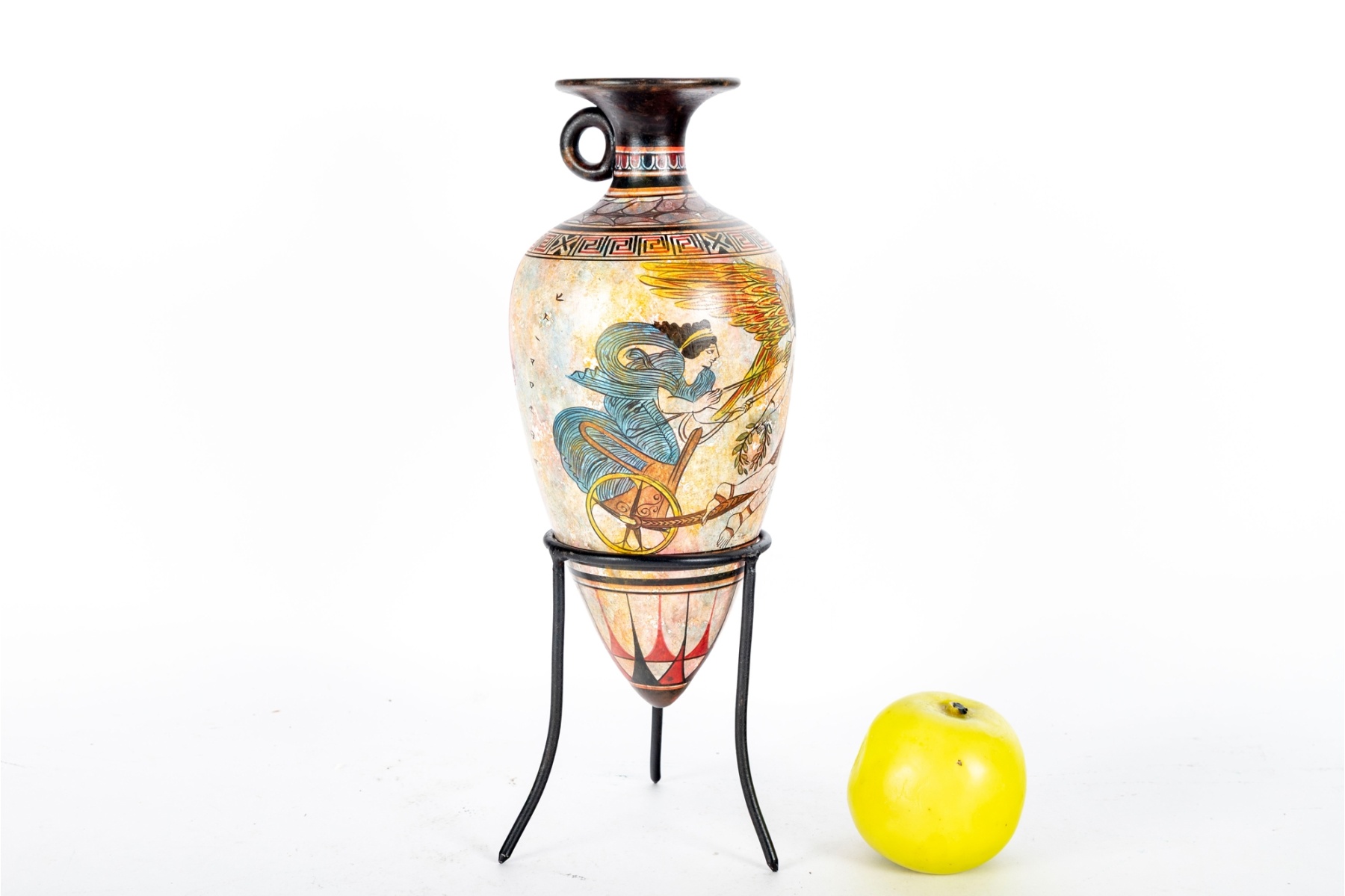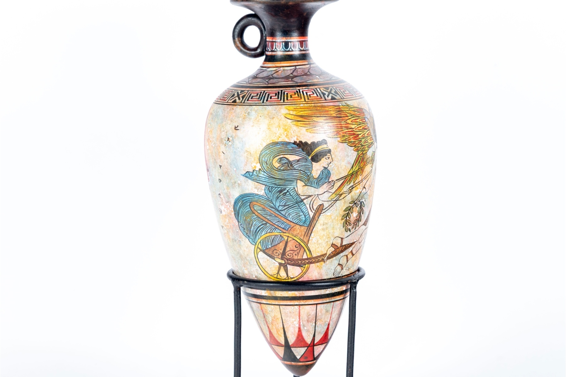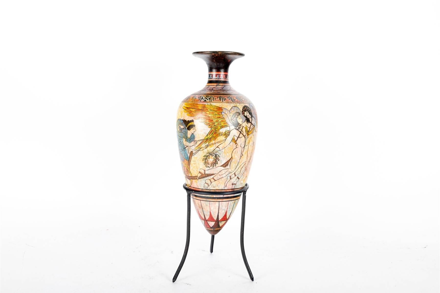 Decorative Greek-style pottery amphora vase featuring a mythological figure in flight surrounded by intricate geometric and meander motifs. Rendered in polychrome tones of terracotta, black, and gold with a flared rim and ring handle. Presented on a black metal display stand.