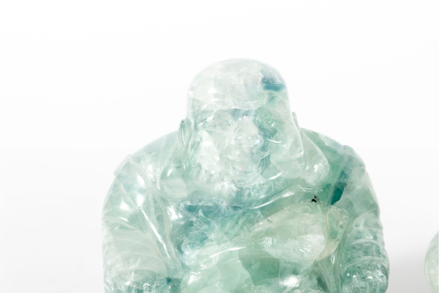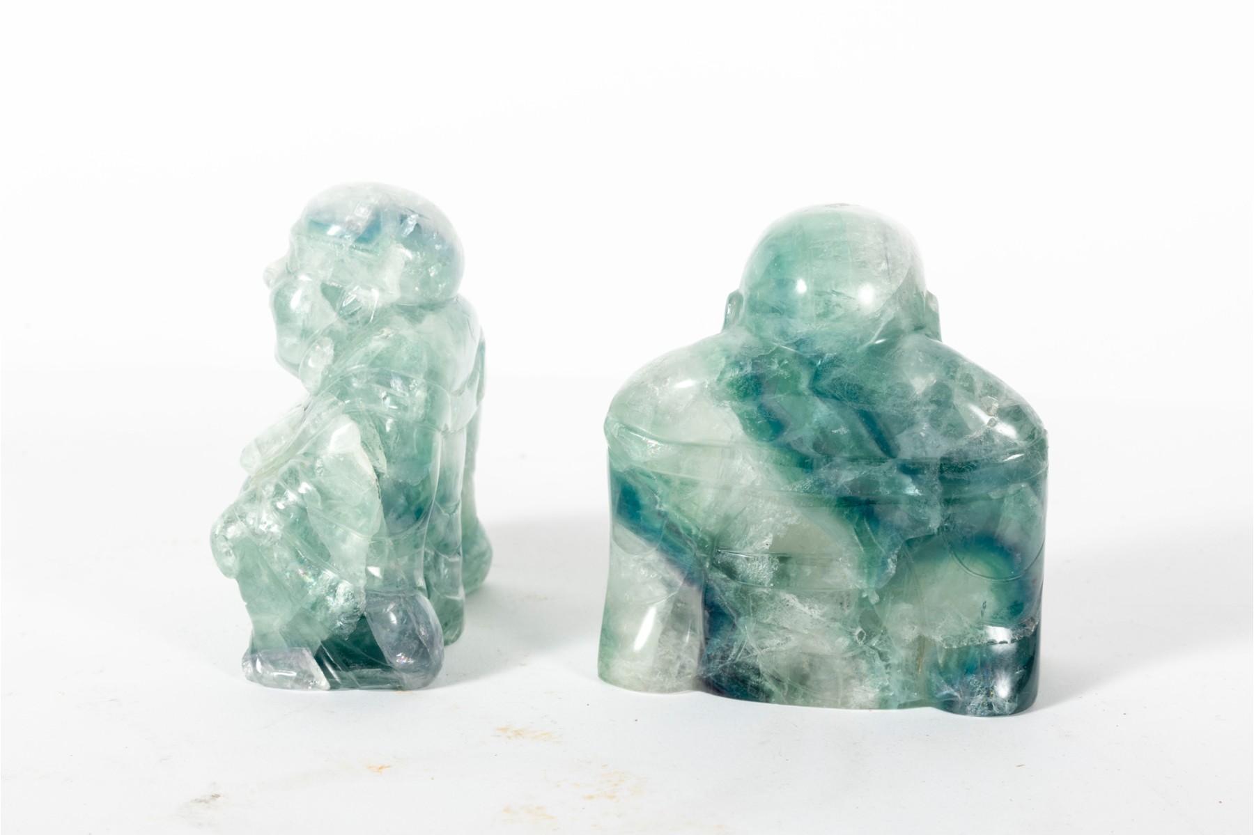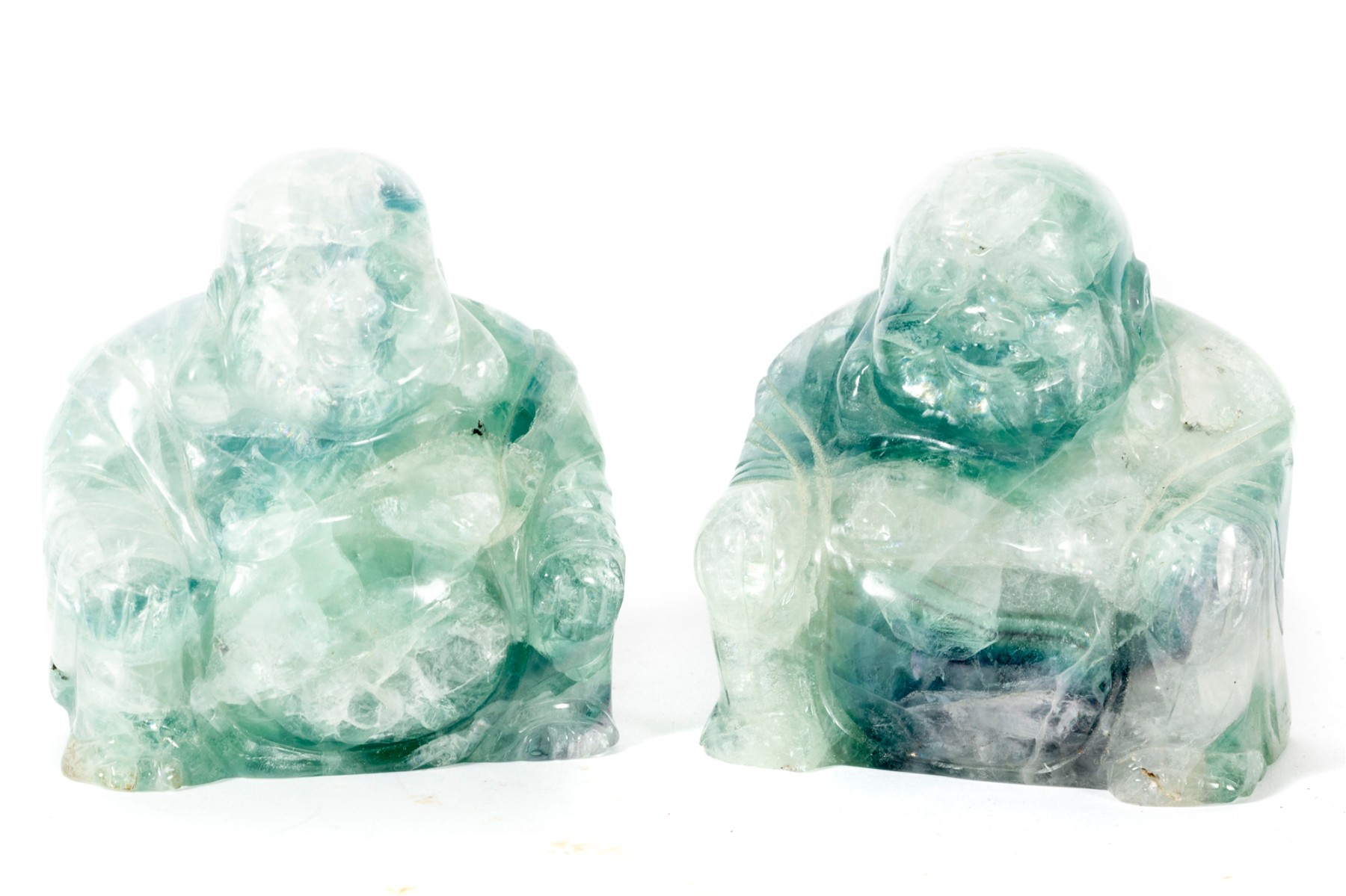 A pair of marvelous miniature 3" Budai (Or Hotei) carvings crafted from green/transparent banded Flourite stone. Hotei is one of the Seven Lucky Gods always depicted as smiling or laughing, earning him the nickname, "Laughing Buddha".