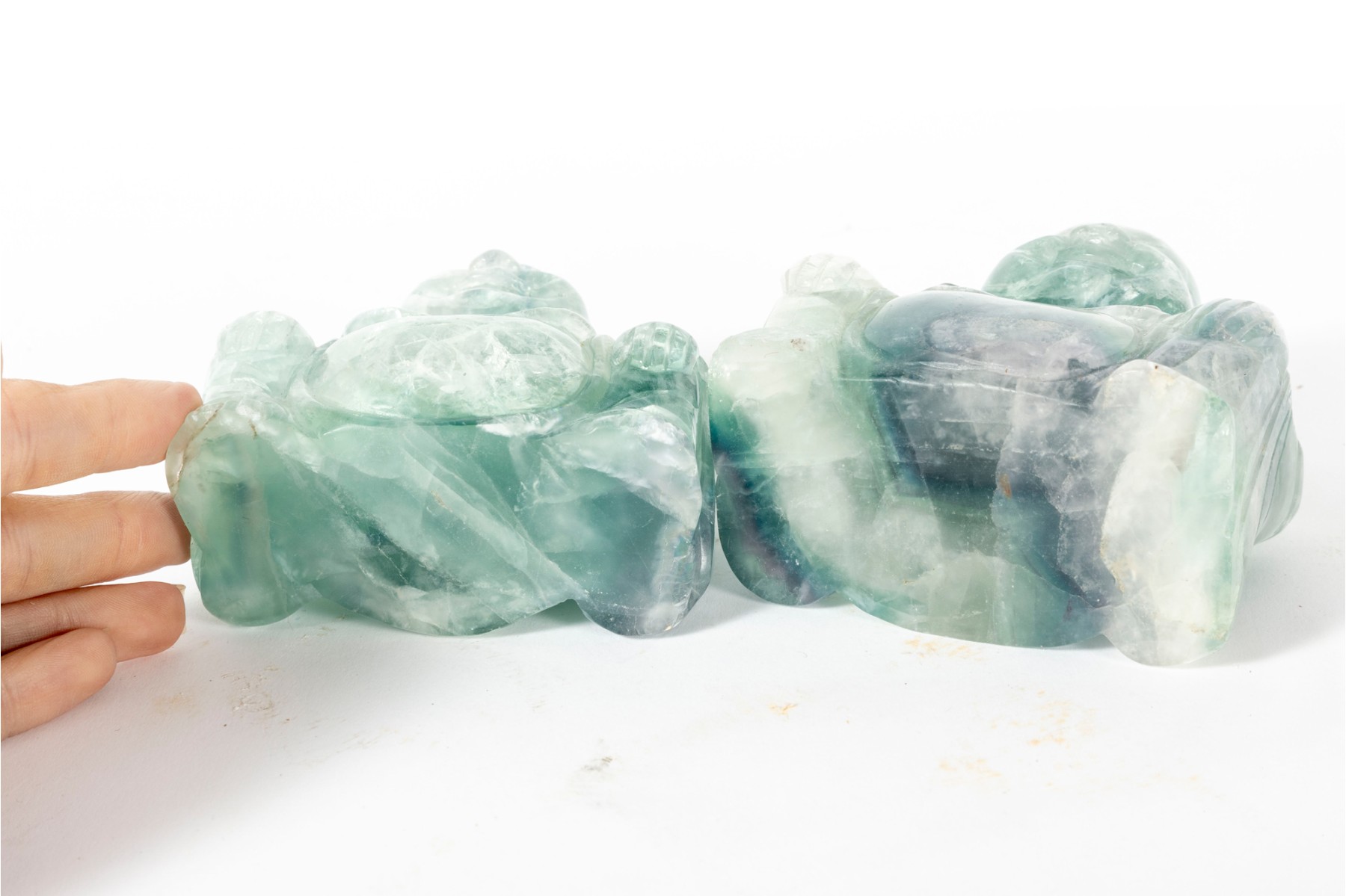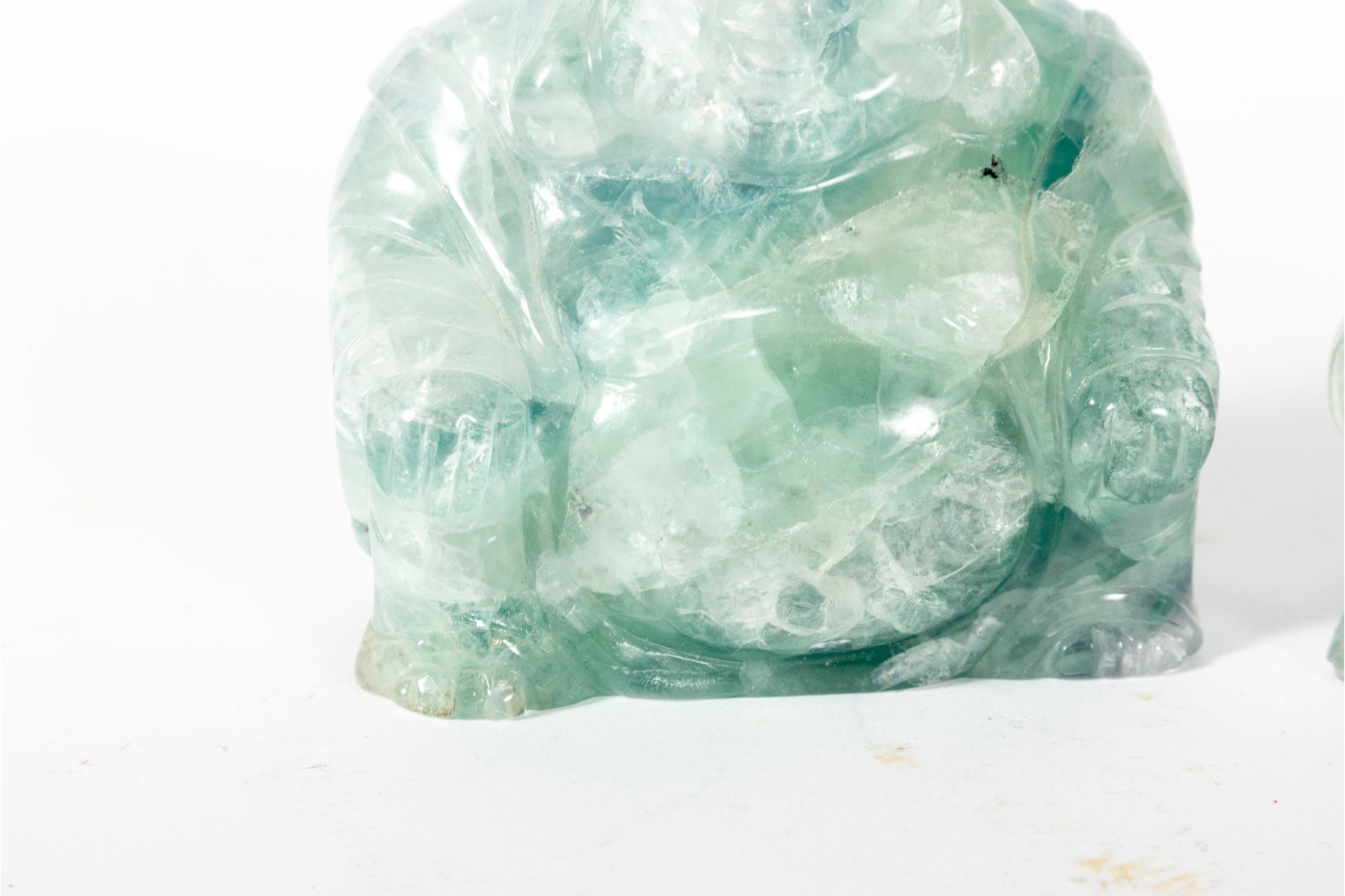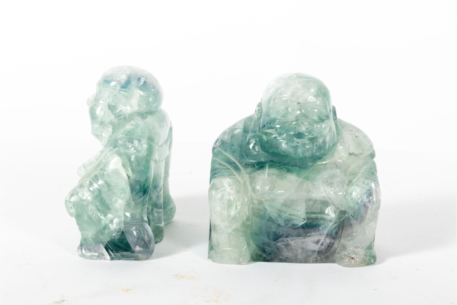 A pair of marvelous miniature 3" Budai (Or Hotei) carvings crafted from green/transparent banded Flourite stone. Hotei is one of the Seven Lucky Gods always depicted as smiling or laughing, earning him the nickname, "Laughing Buddha".