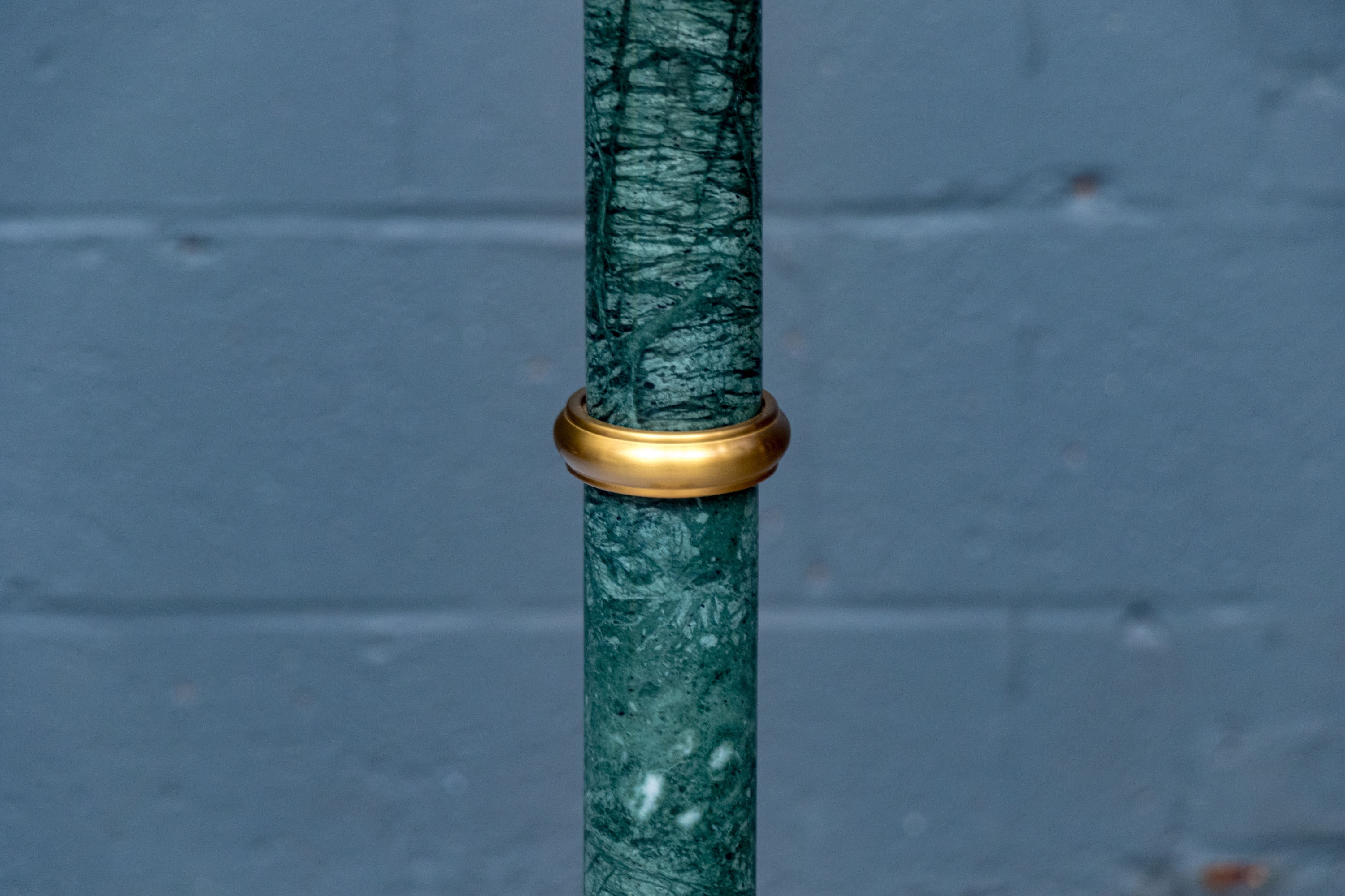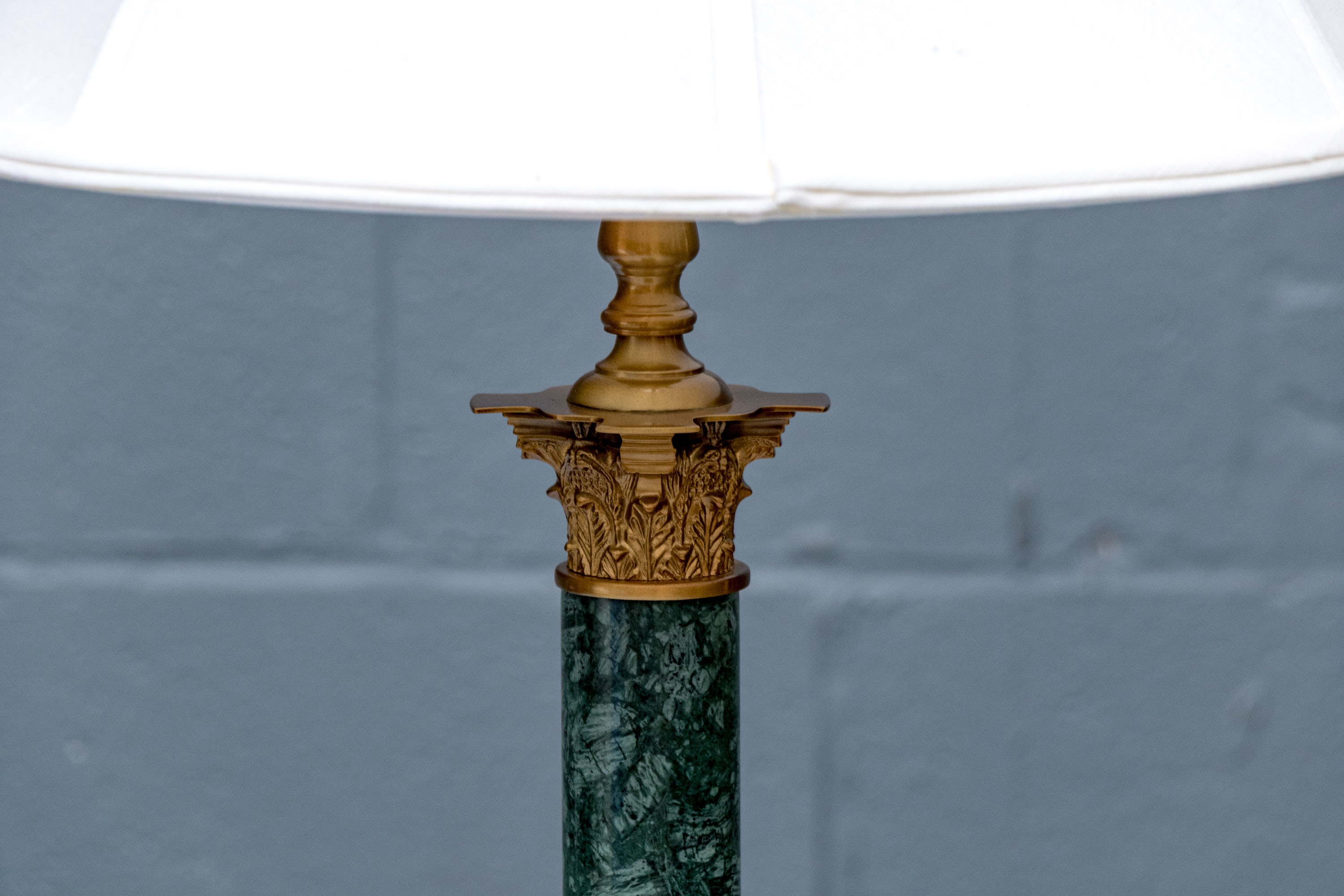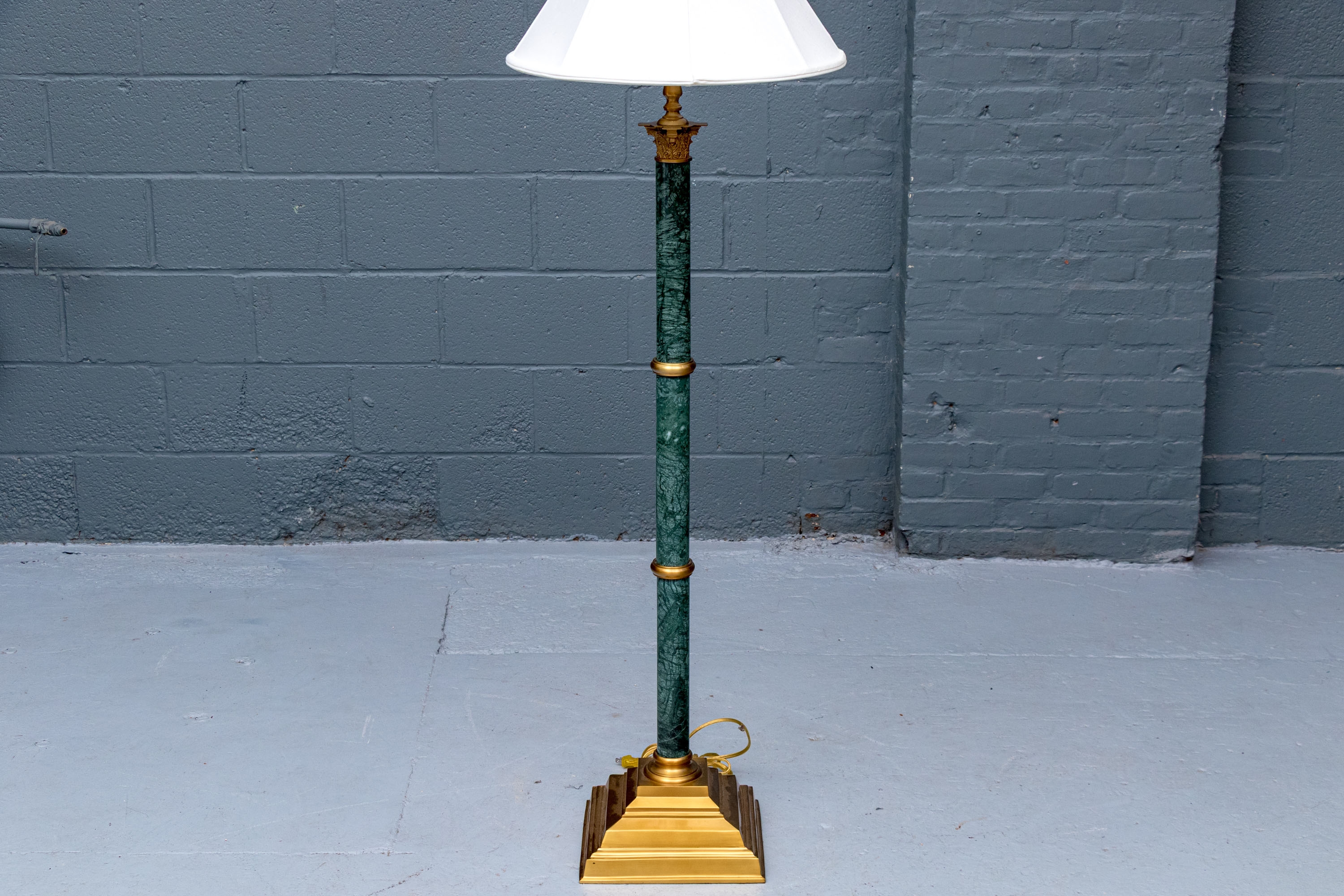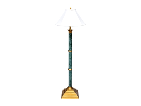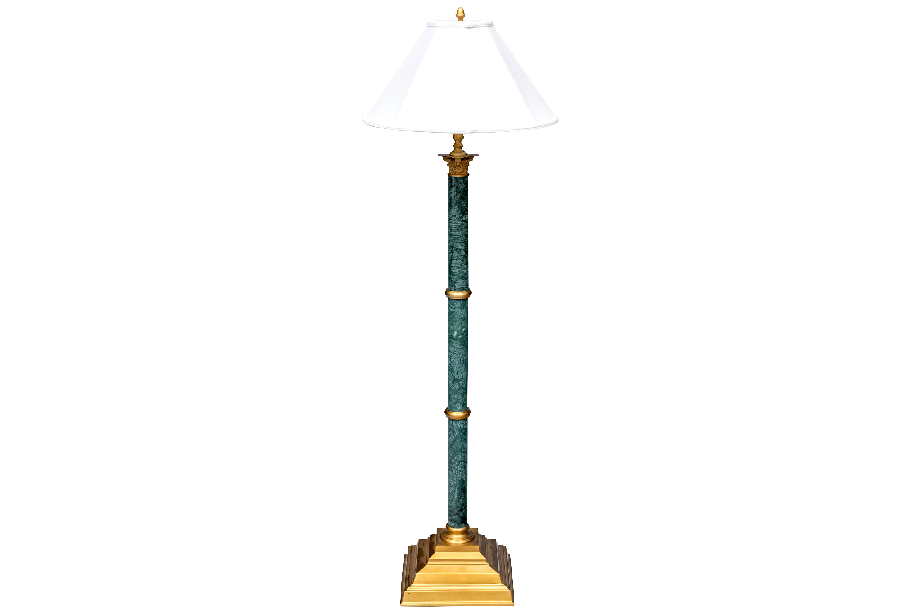 A striking green marble floor lamp in the form of a Corinthian column with a well cast capital and accentuated with brass rings. The lamp is resting on a golden brass multi-tiered square base and covered with a silk lined shade.