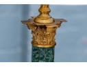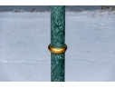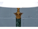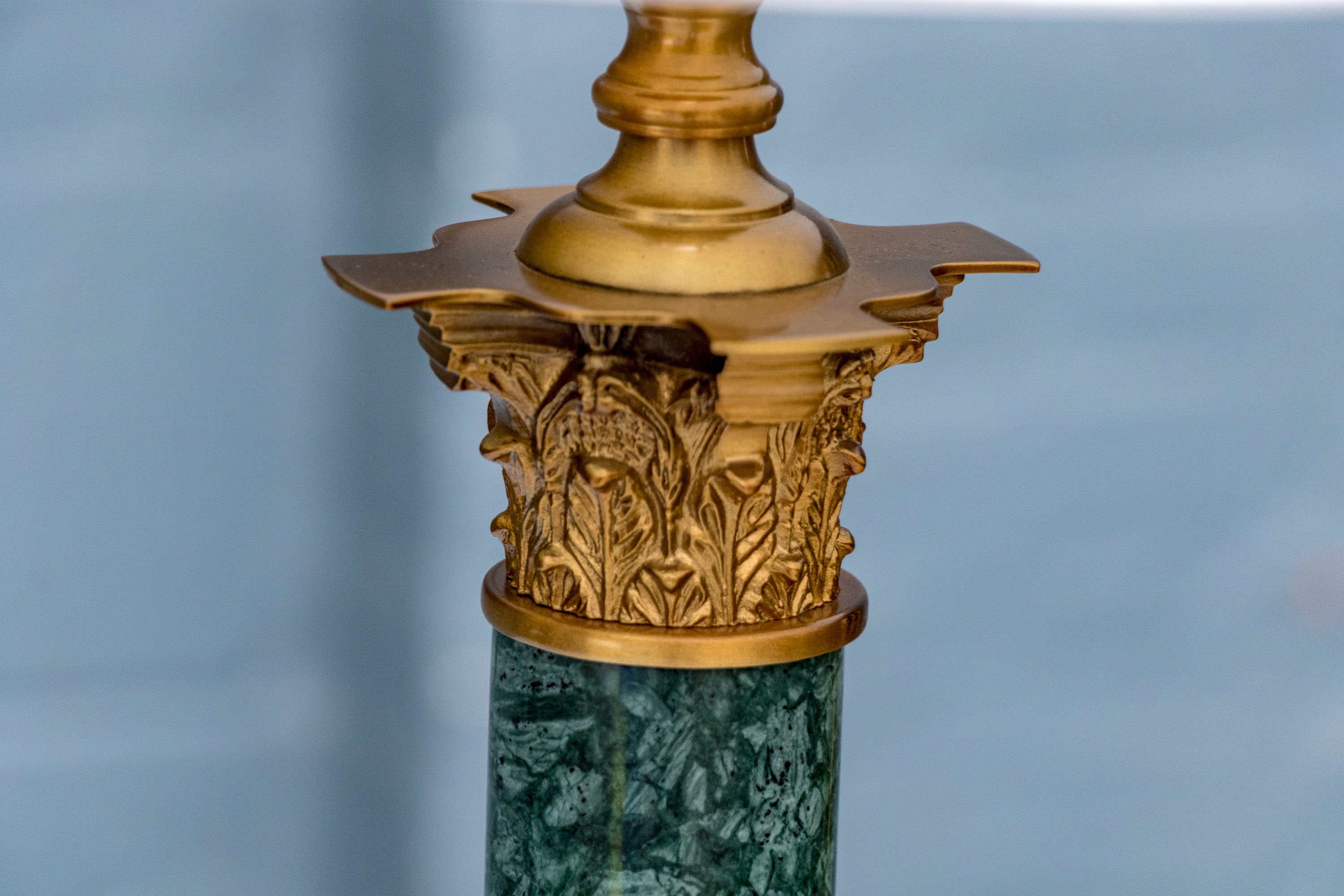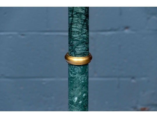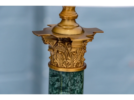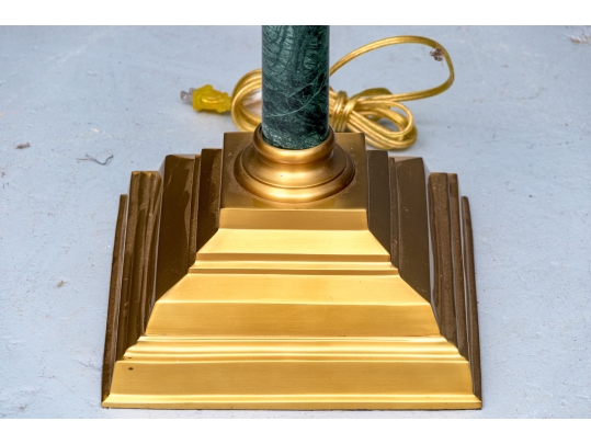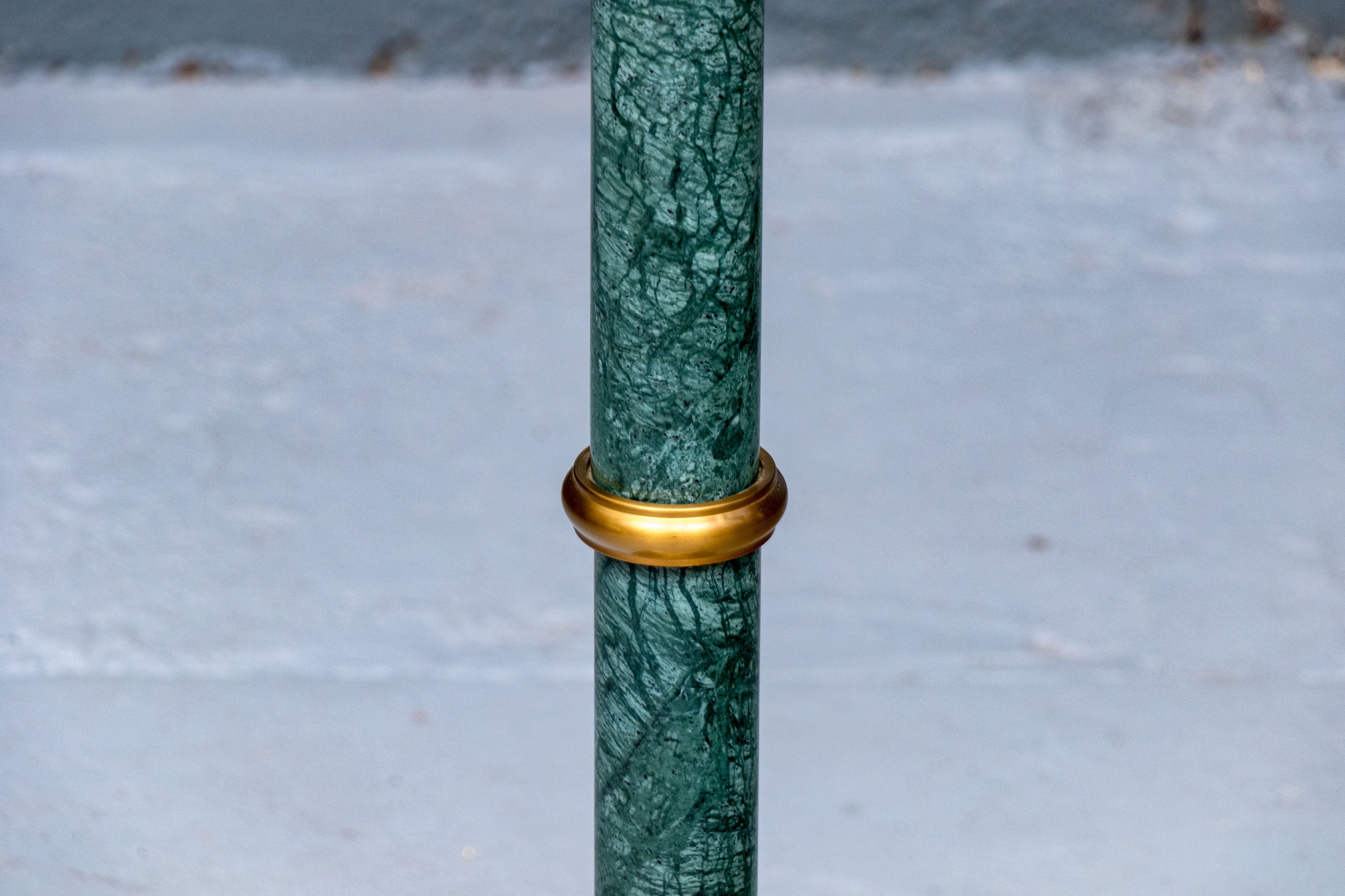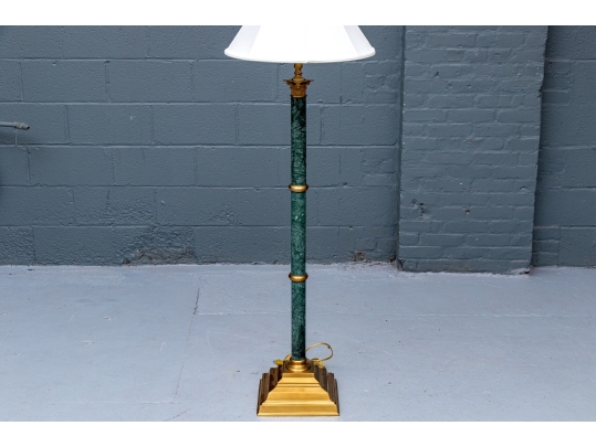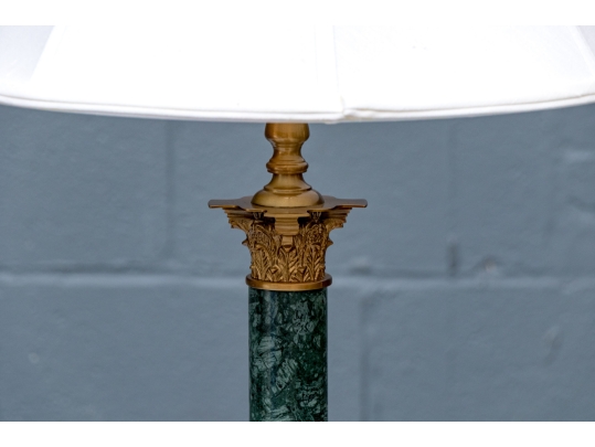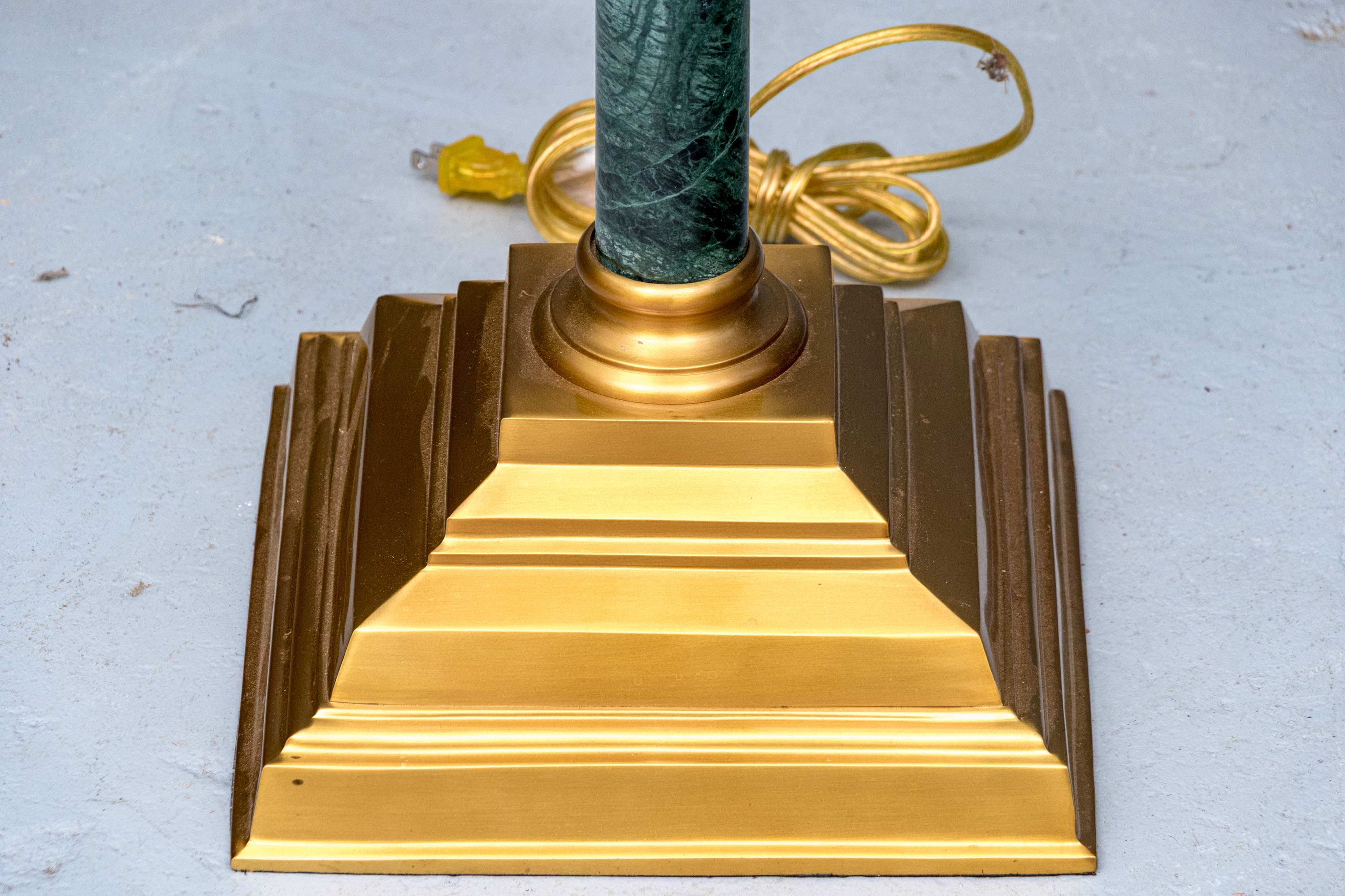 A striking green marble floor lamp in the form of a Corinthian column with a well cast capital and accentuated with brass rings. The lamp is resting on a golden brass multi-tiered square base and covered with a silk lined shade.