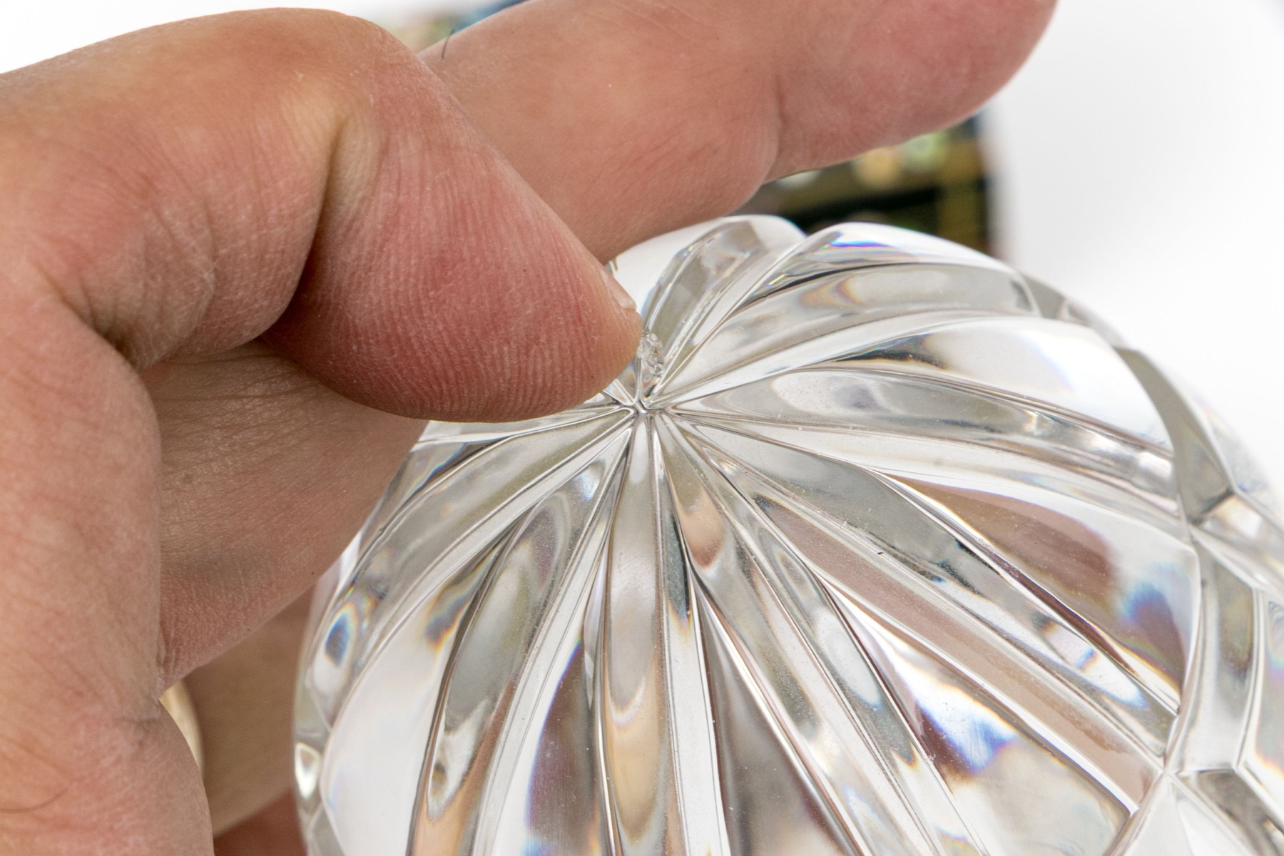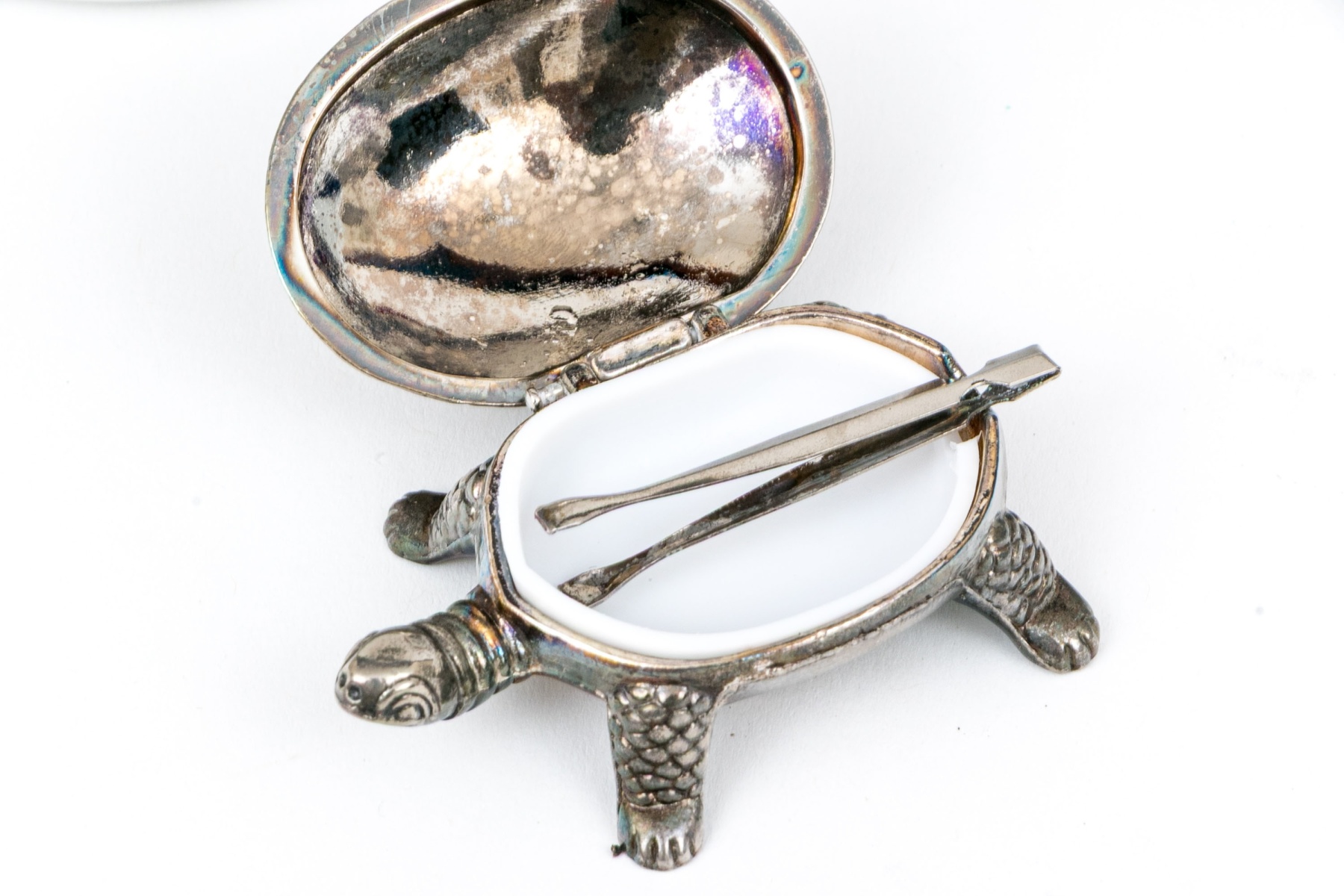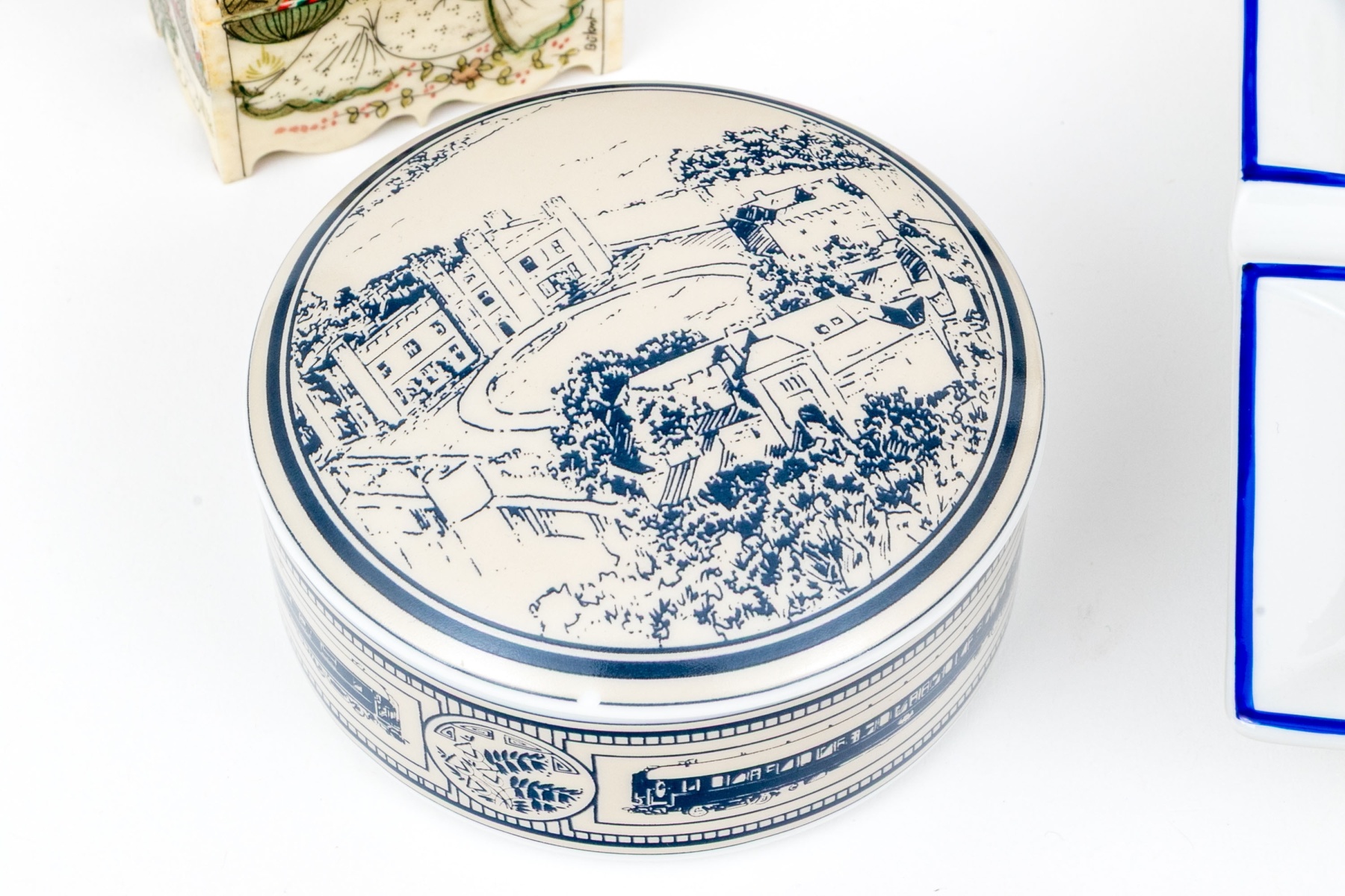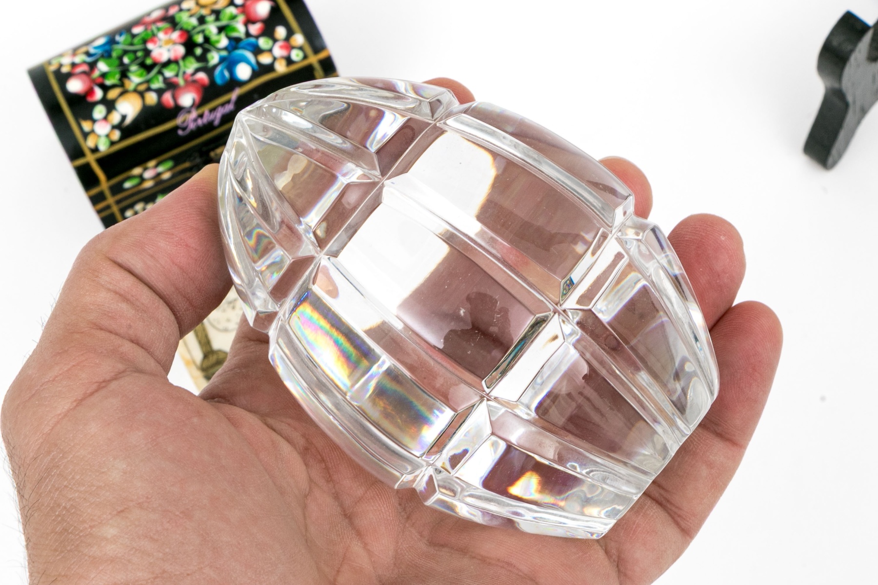 A fabulous variety of tabletop pieces comprised of ceramic boxes and crystal egg with Chinese made potpourri footed box with lid and turtle form pill box.