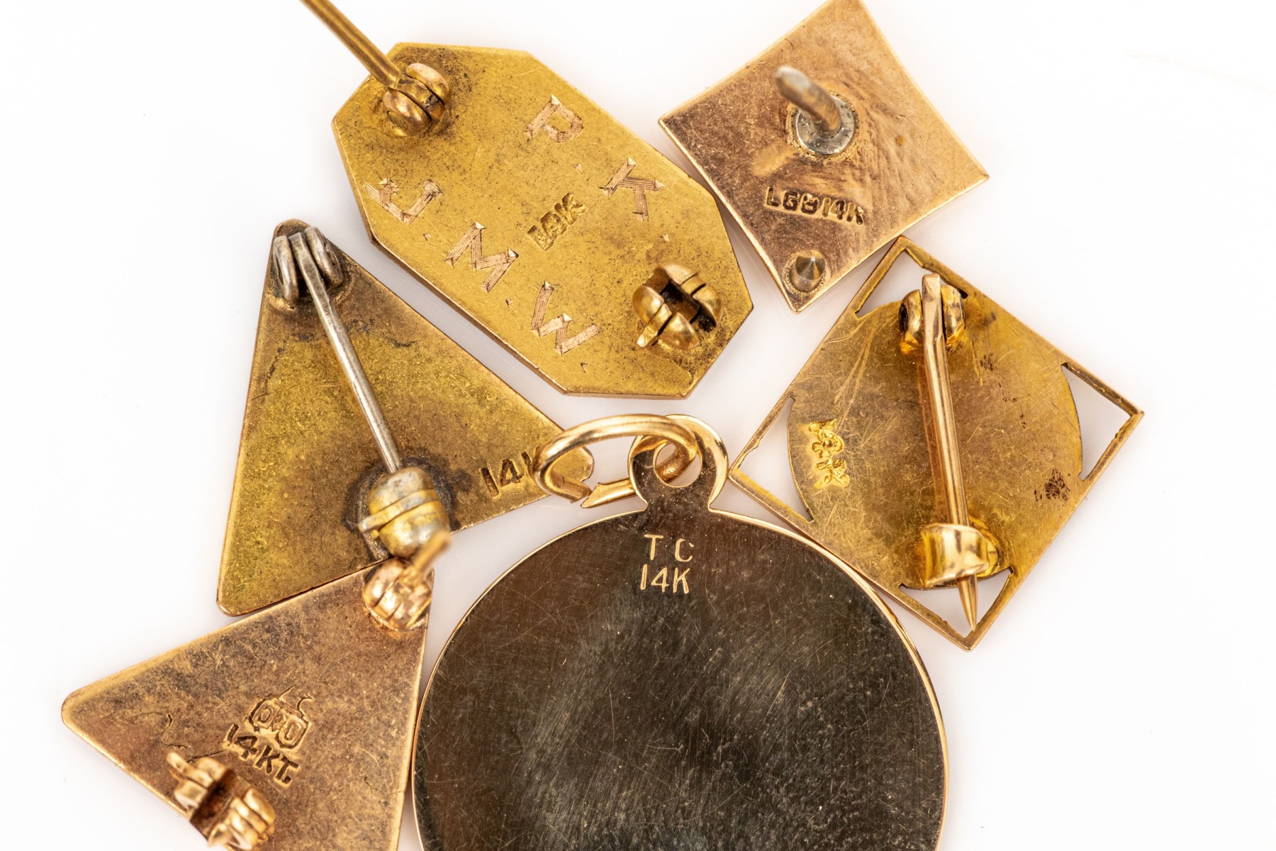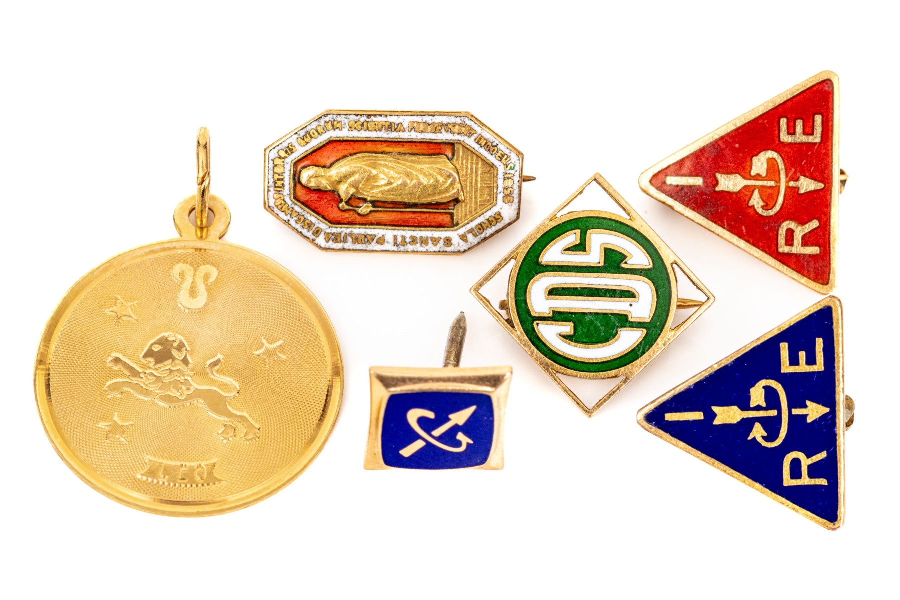 and a collection of pins with enamel initials and a figure