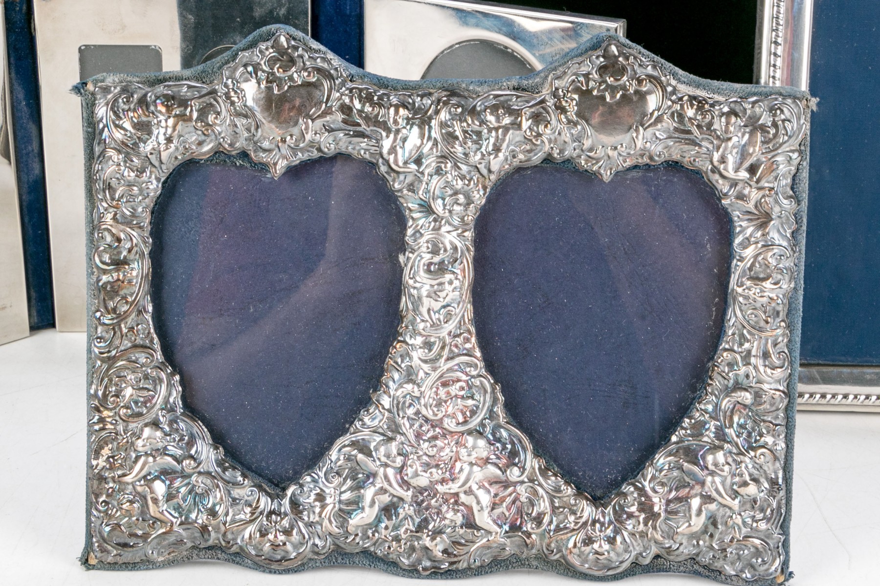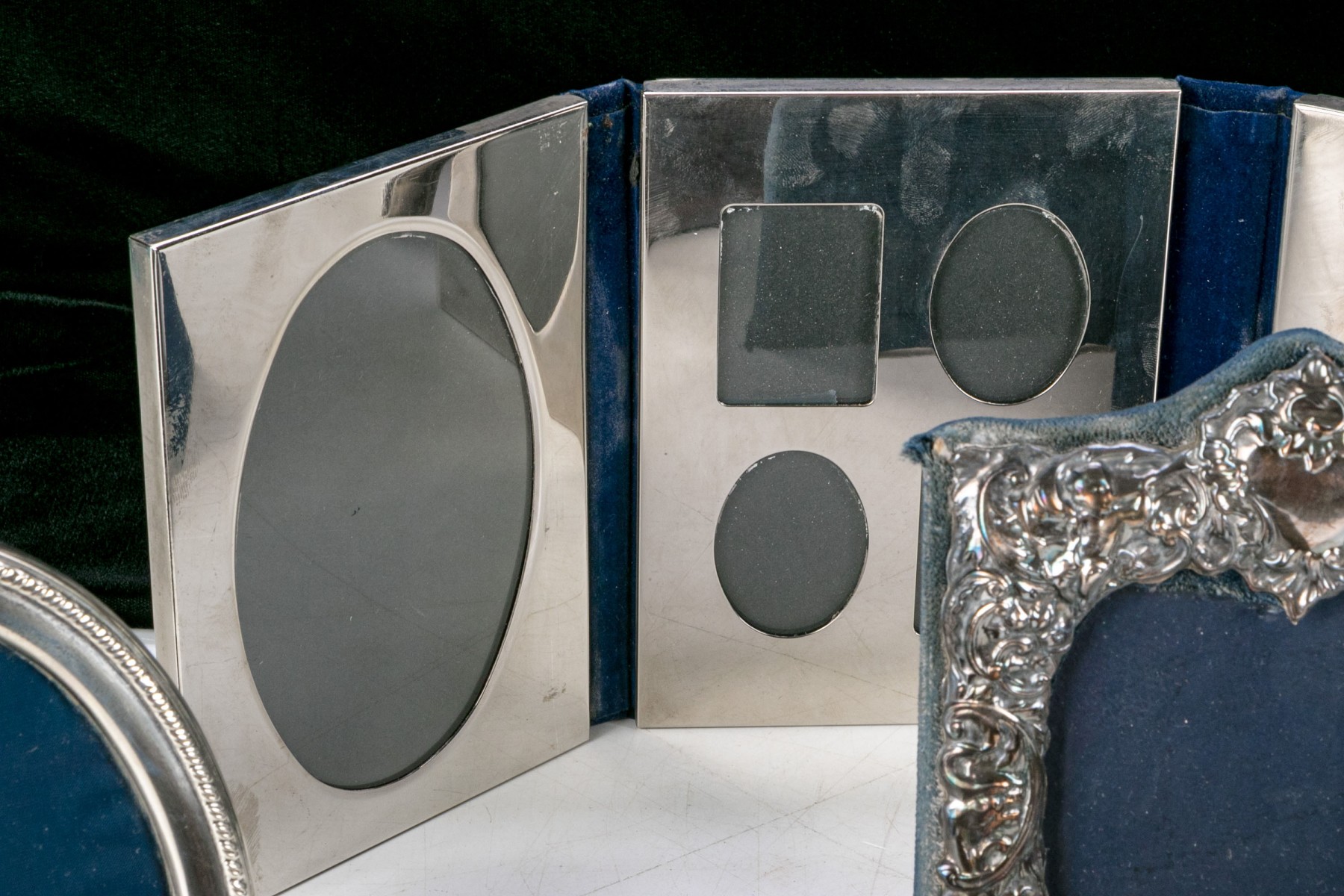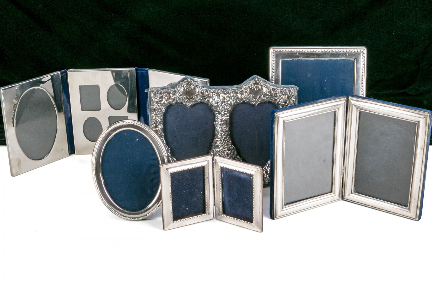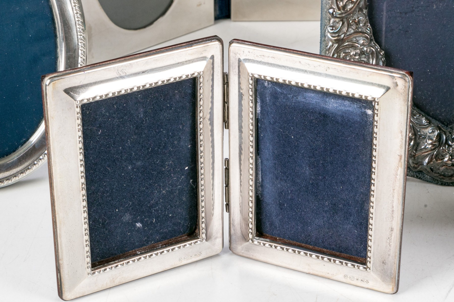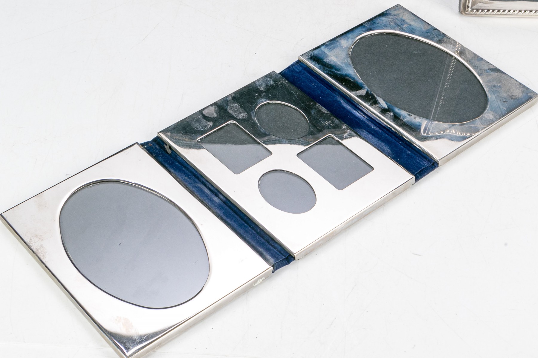 Group of sterling silver and silver plate photo frames including repose` frame (unmarked).