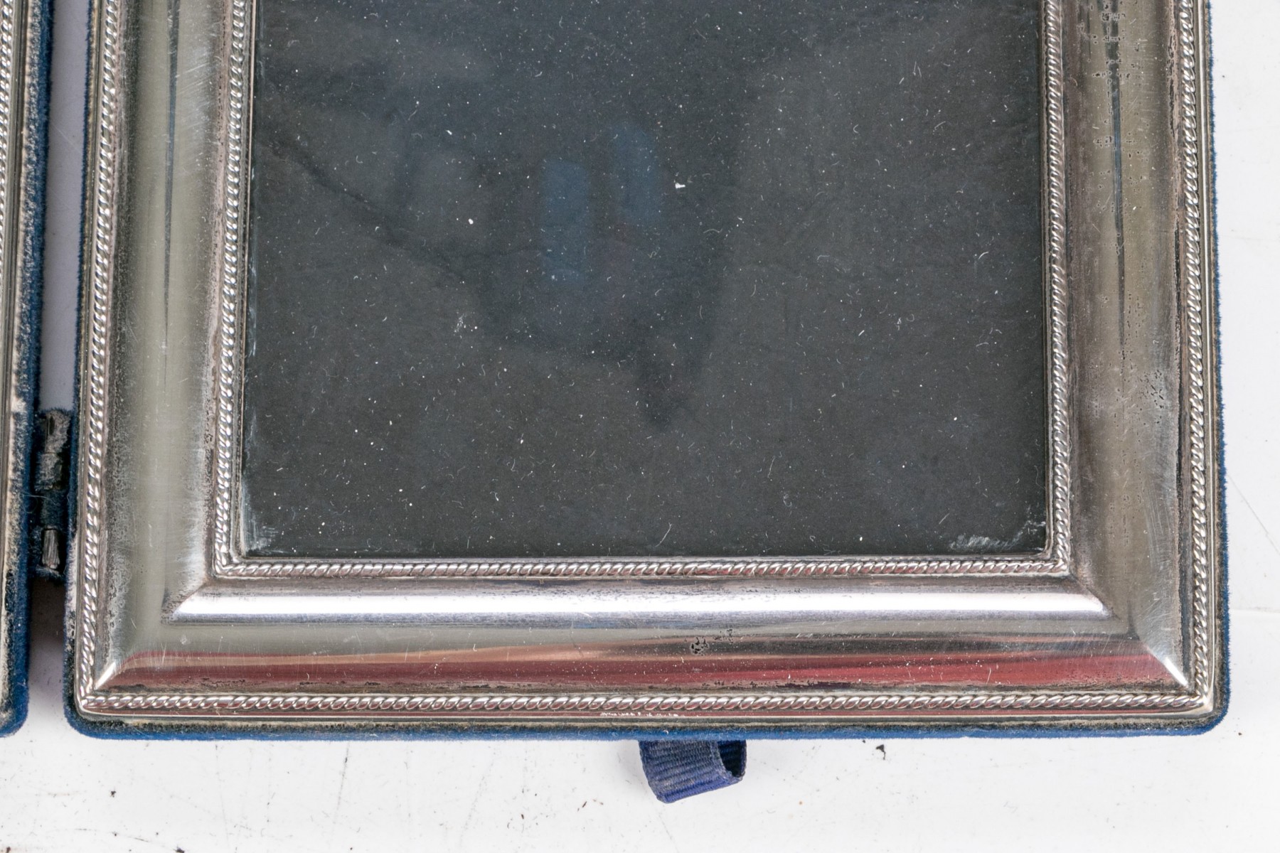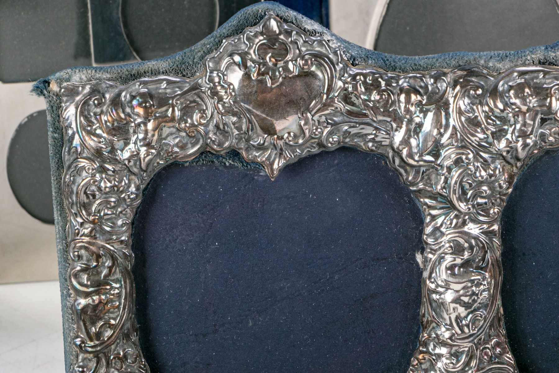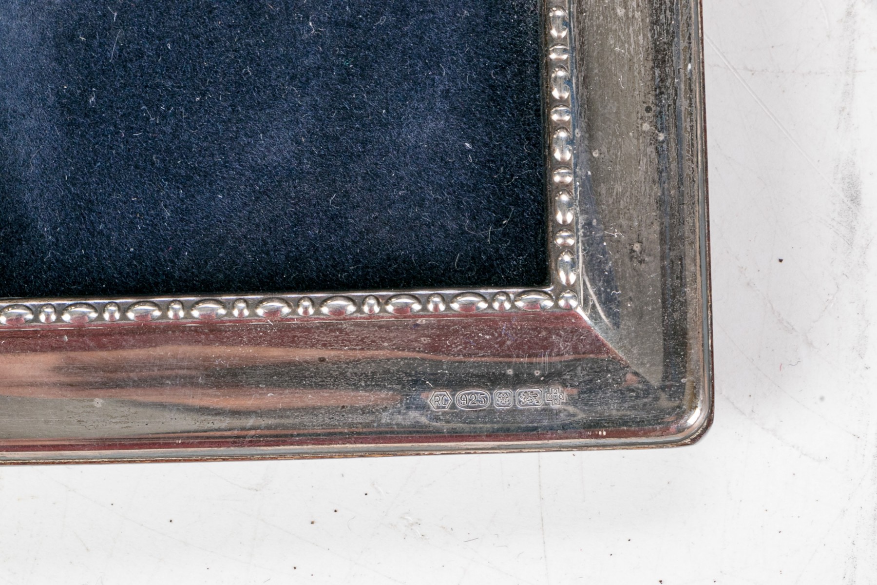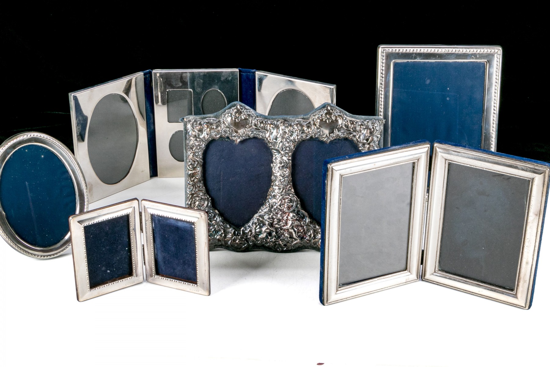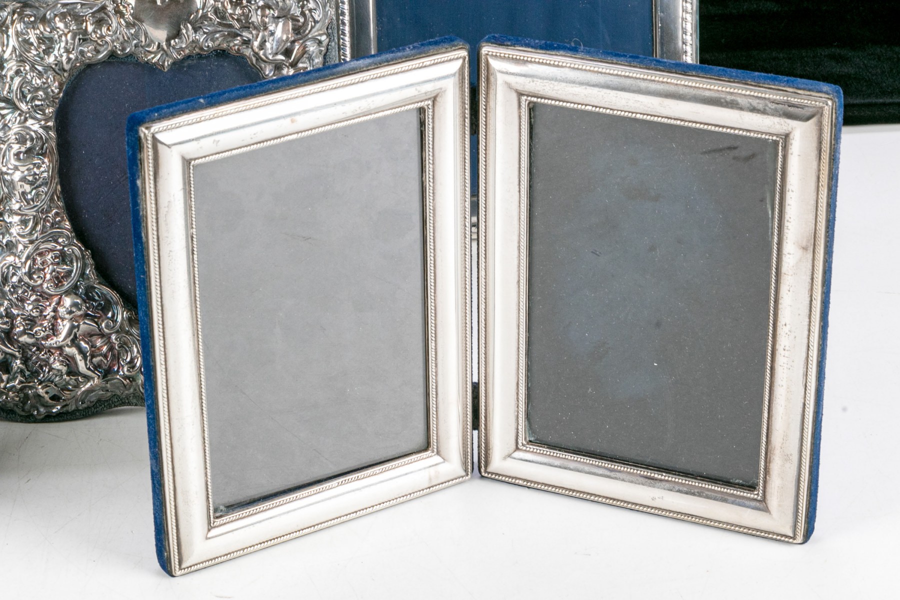 Group of sterling silver and silver plate photo frames including repose` frame (unmarked).