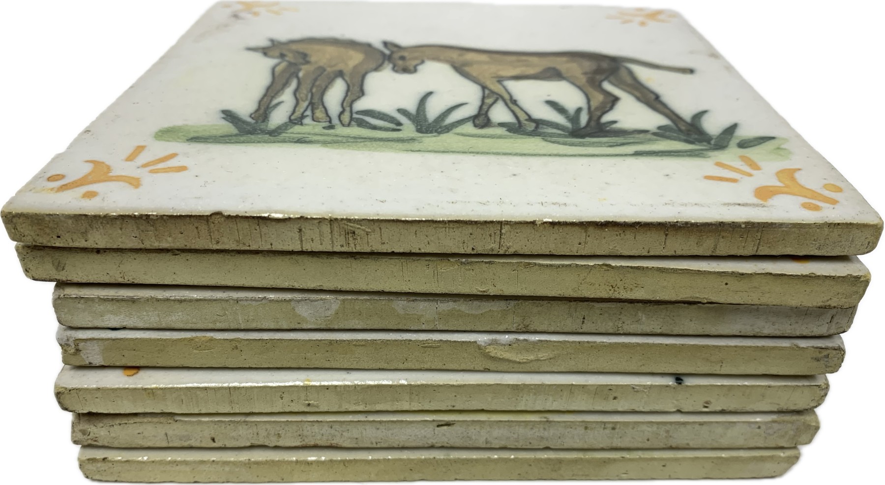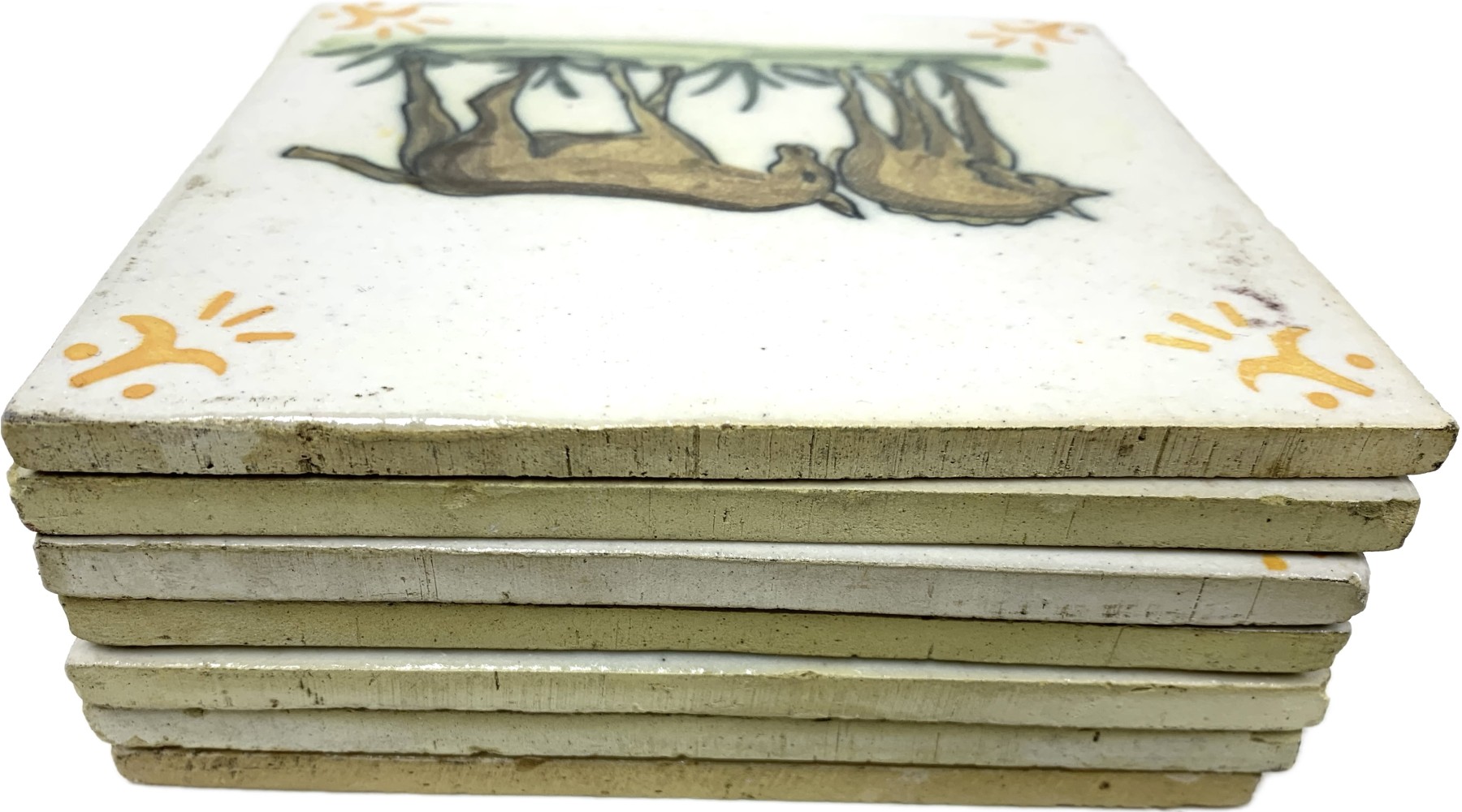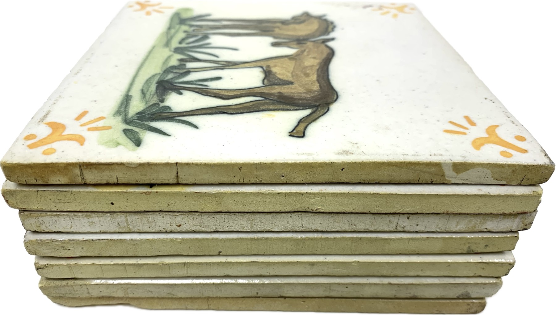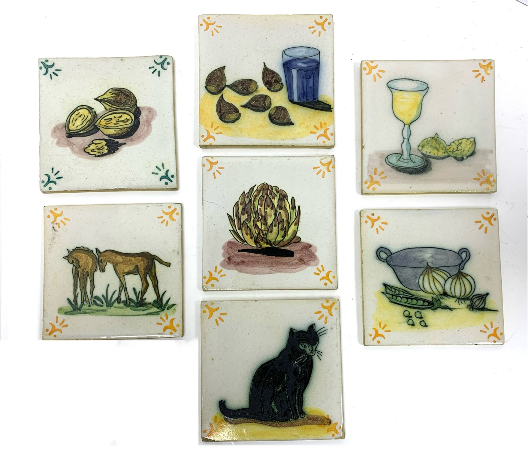 A great group of older Sant’ Anna tiles from Lisbon, Portugal. With colorful and Primitive depictions of Ponies, Figs, Cat, Artichoke and Wine Glasses. The company in production from the 1700’s. Solid feeling with good weight and suitable as Summer coasters or mounting. Each with markings on the back of the company name and “Portugal”.