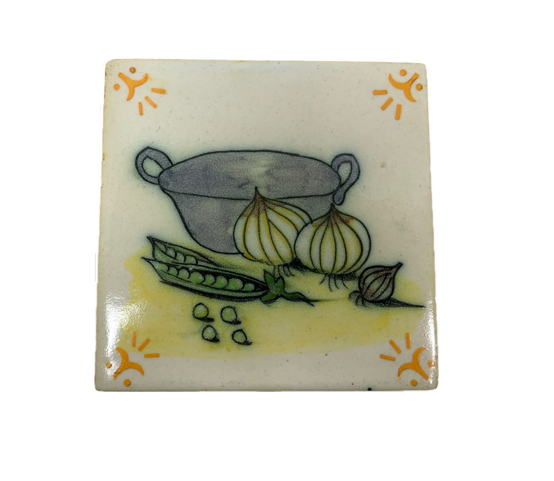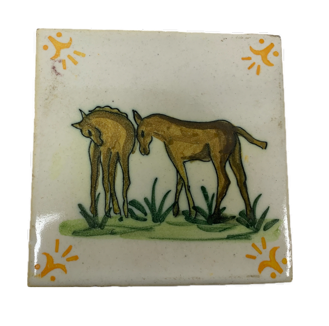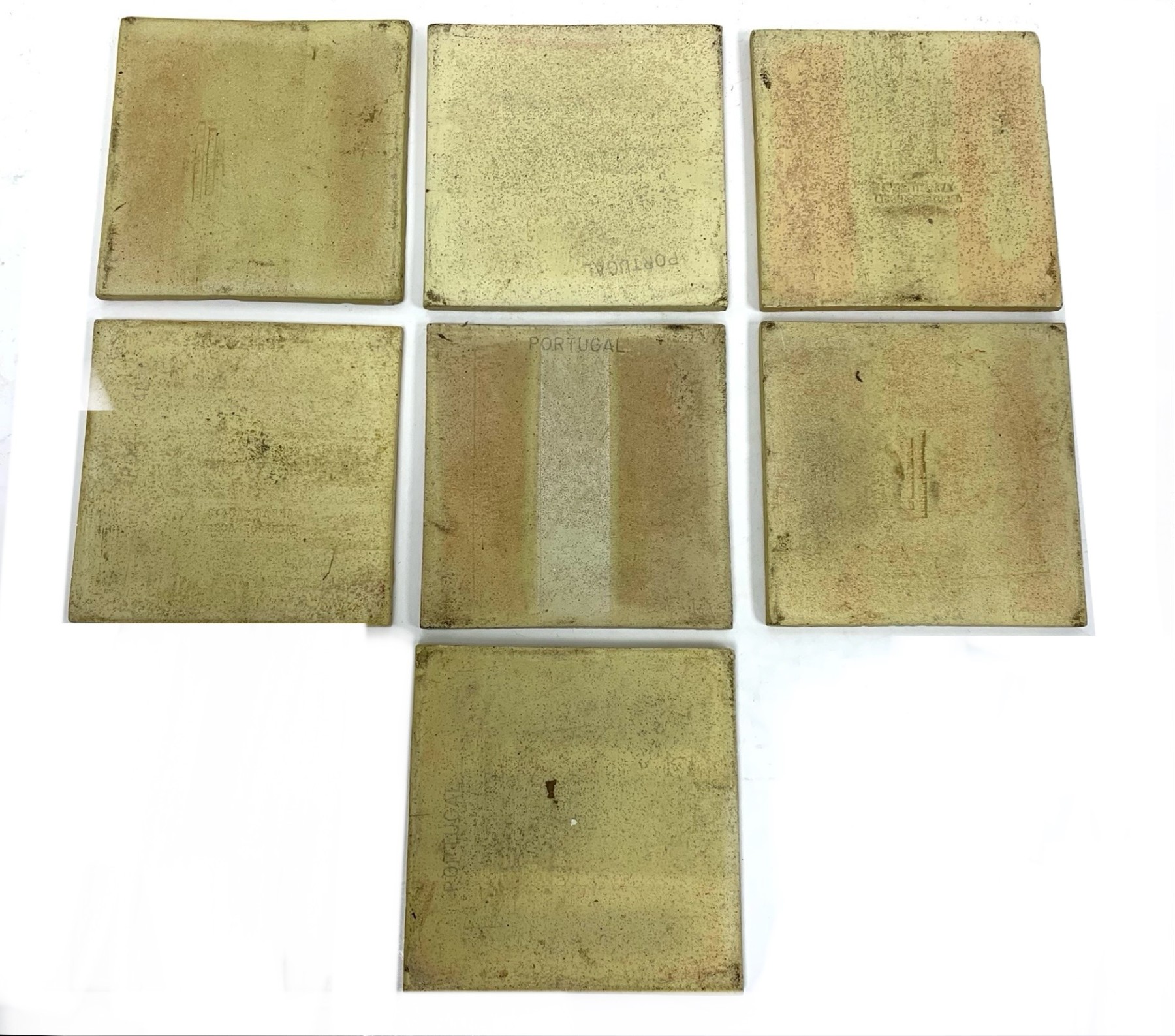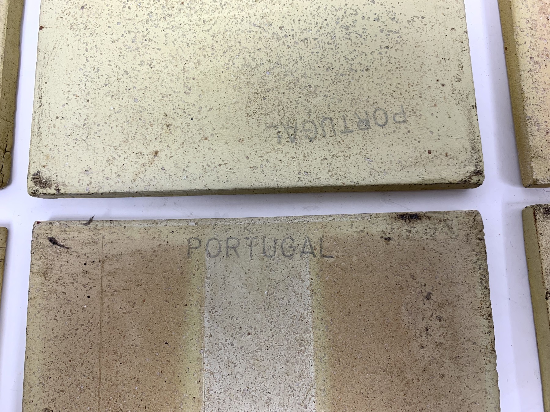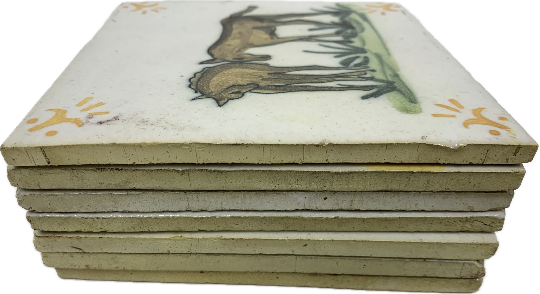 A great group of older Sant’ Anna tiles from Lisbon, Portugal. With colorful and Primitive depictions of Ponies, Figs, Cat, Artichoke and Wine Glasses. The company in production from the 1700’s. Solid feeling with good weight and suitable as Summer coasters or mounting. Each with markings on the back of the company name and “Portugal”.