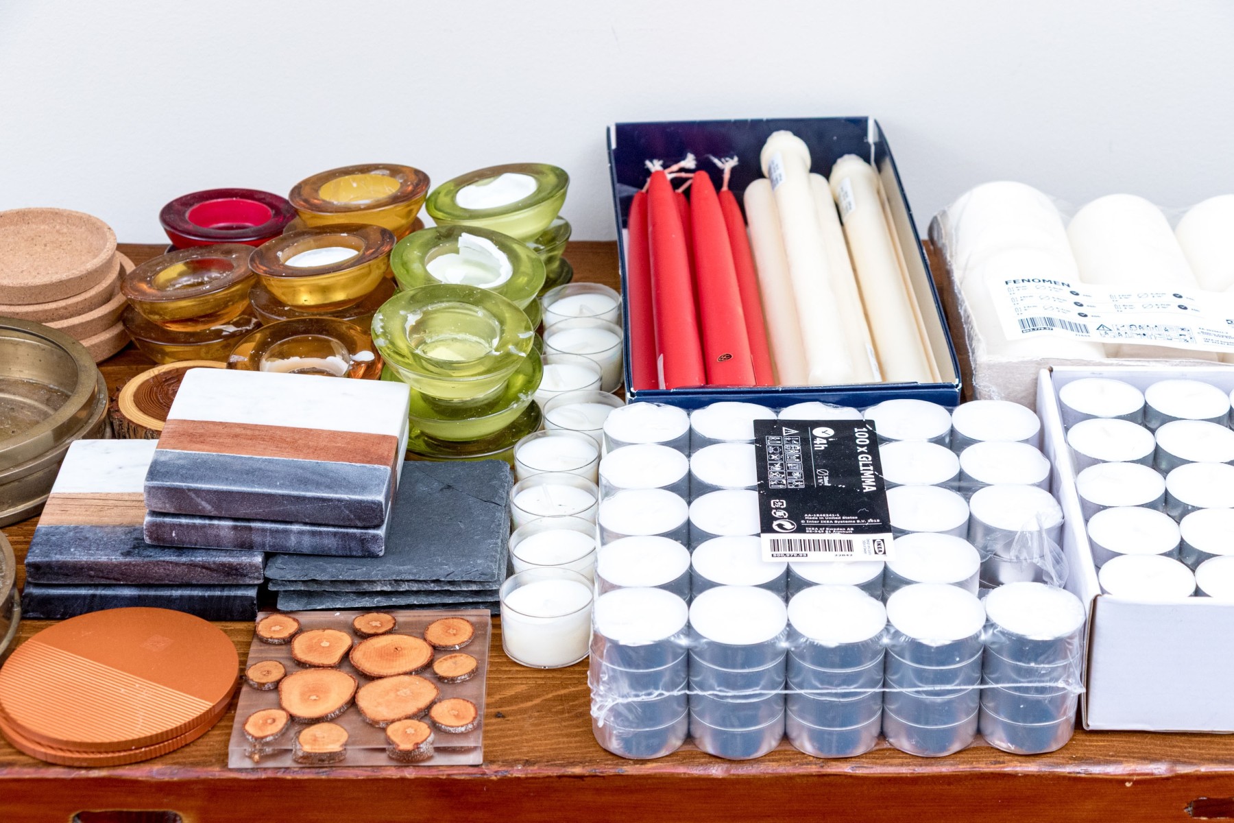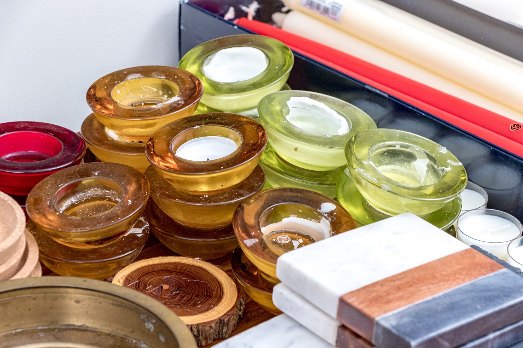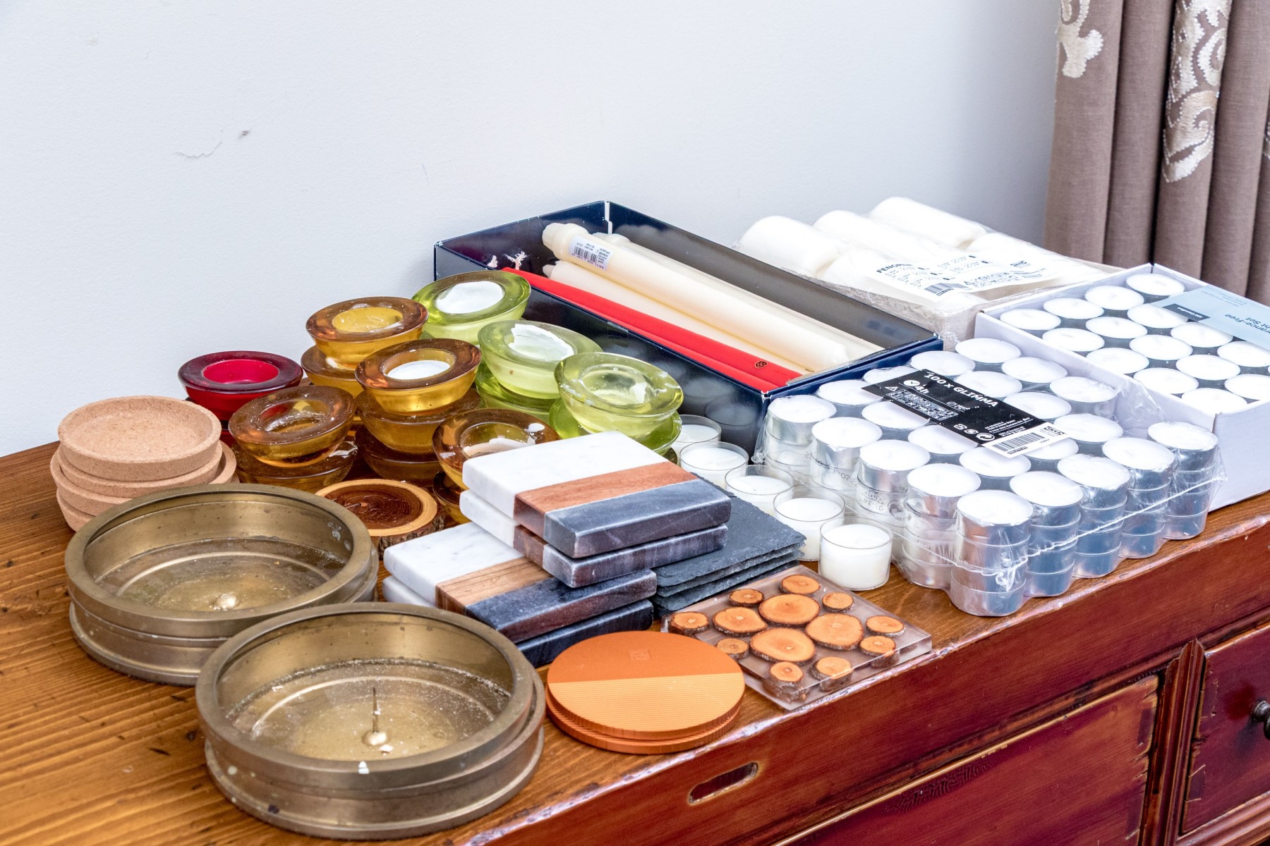 A substantial collection of tabletop decor including packages of votive,, taper, and cylindrical candles; a handful of glass votive holders in cranberry, amber, and green hues; brass candle prick stands; and chic multimedia coasters.