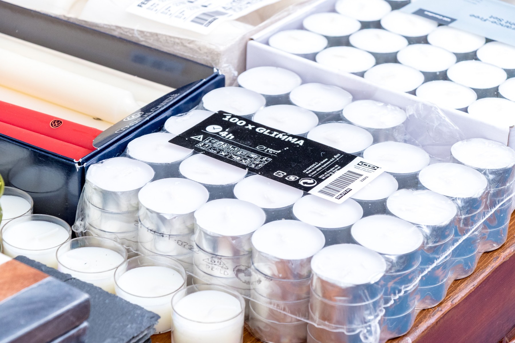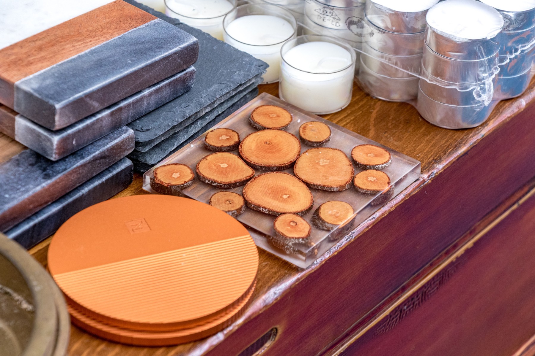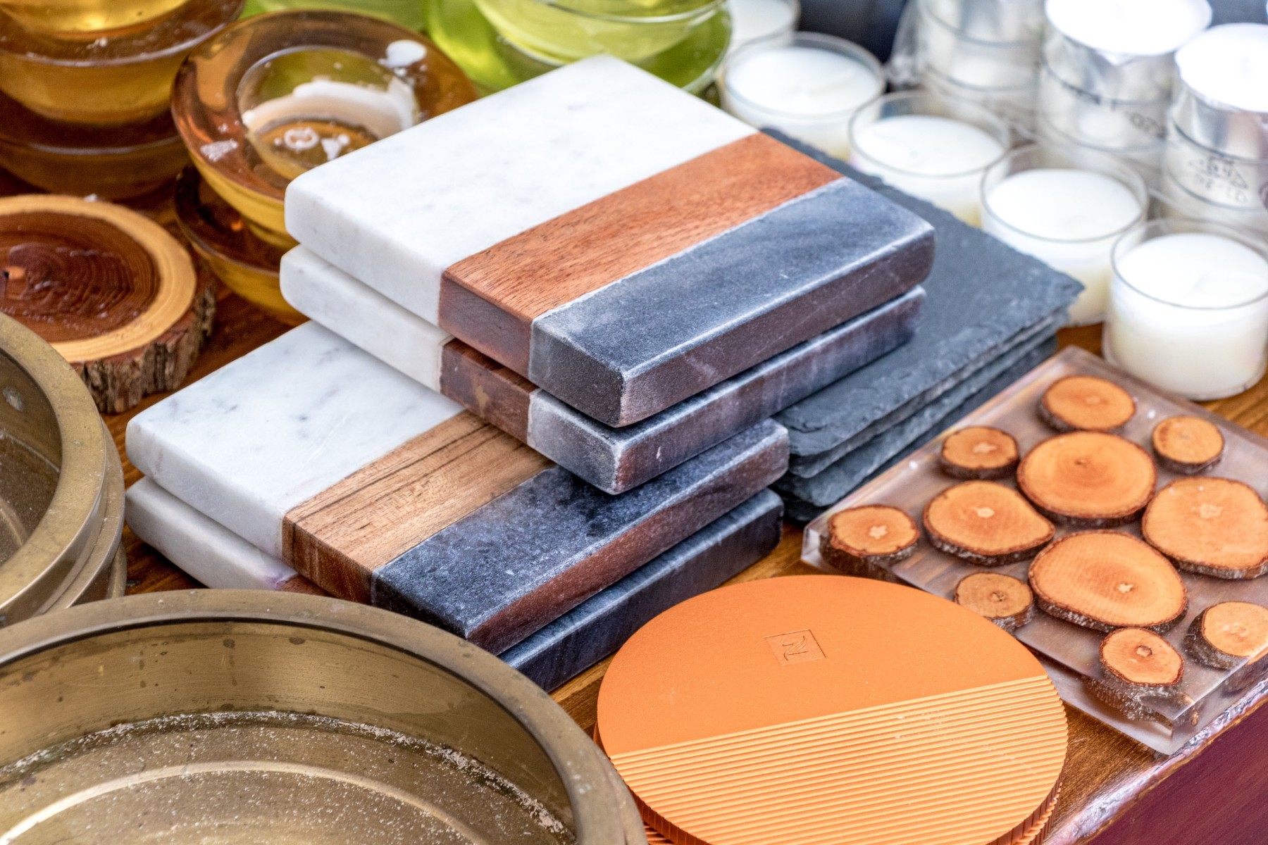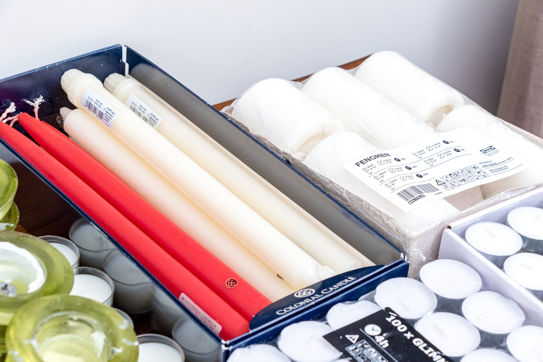 A substantial collection of tabletop decor including packages of votive,, taper, and cylindrical candles; a handful of glass votive holders in cranberry, amber, and green hues; brass candle prick stands; and chic multimedia coasters.