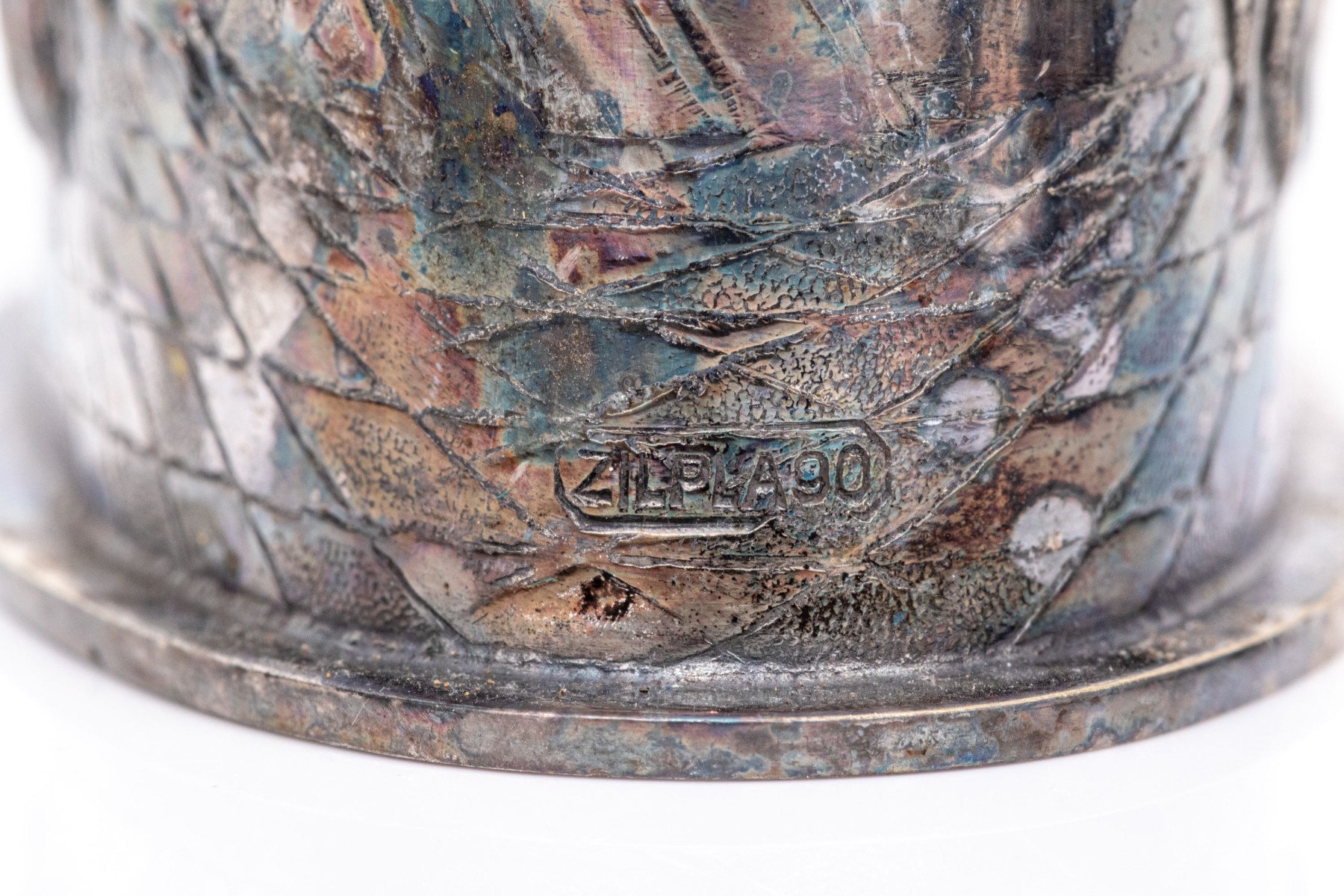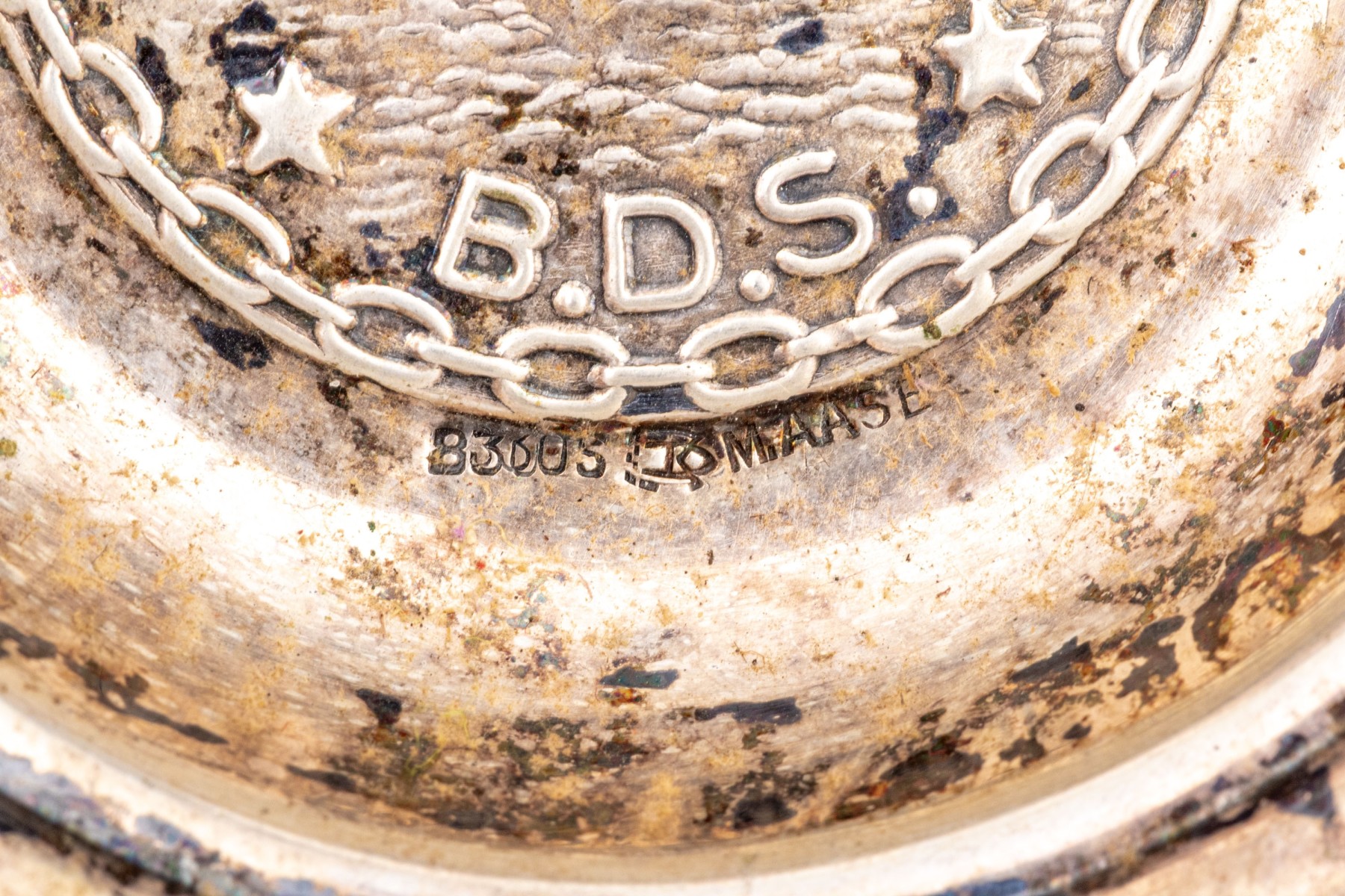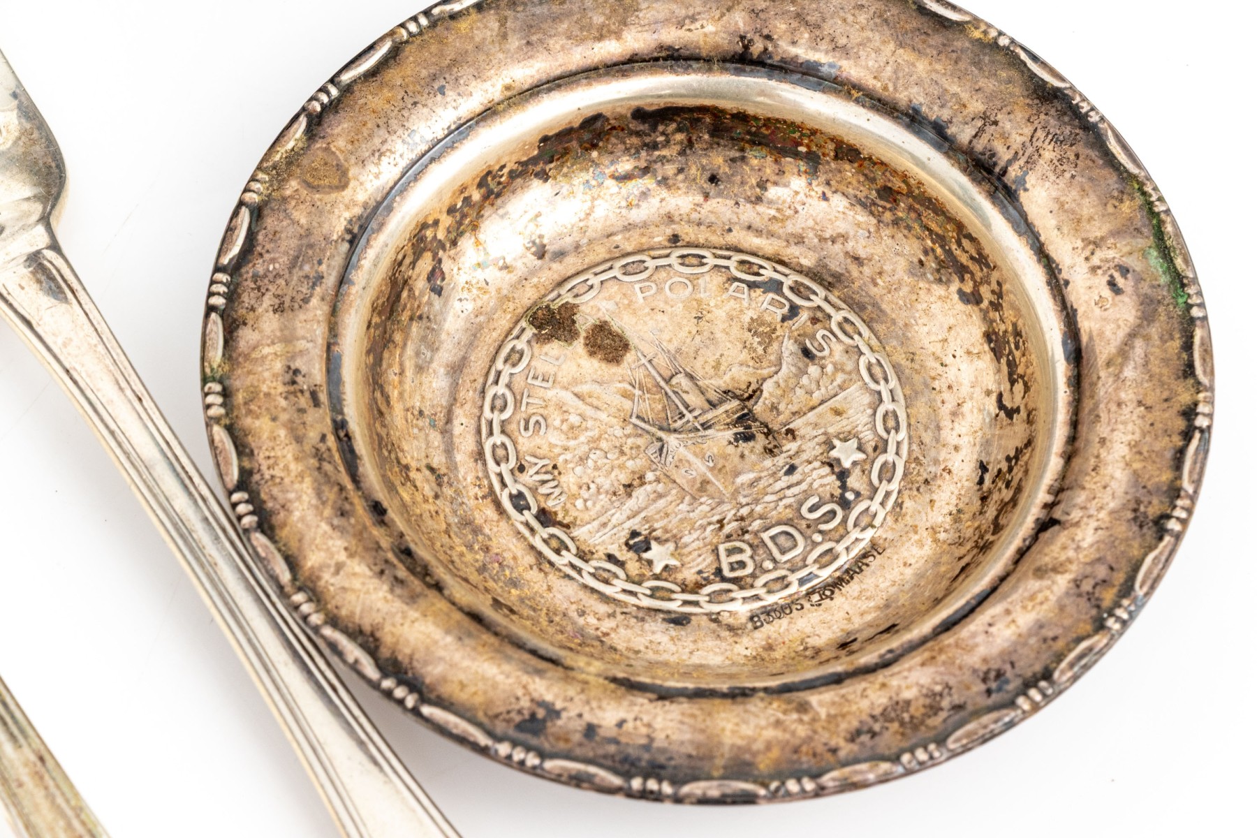 a pin dish with repousse ship motif, 3 1/2" diameter, tarnished