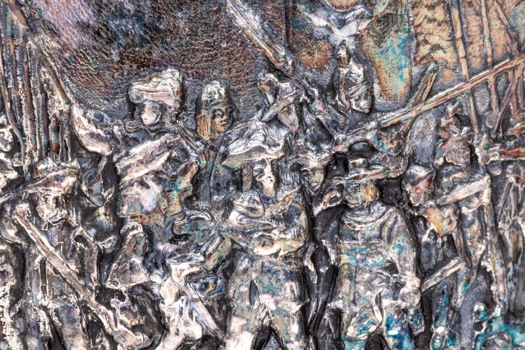 an oval divided cigarette holder with repousse figural decoration, tarnished