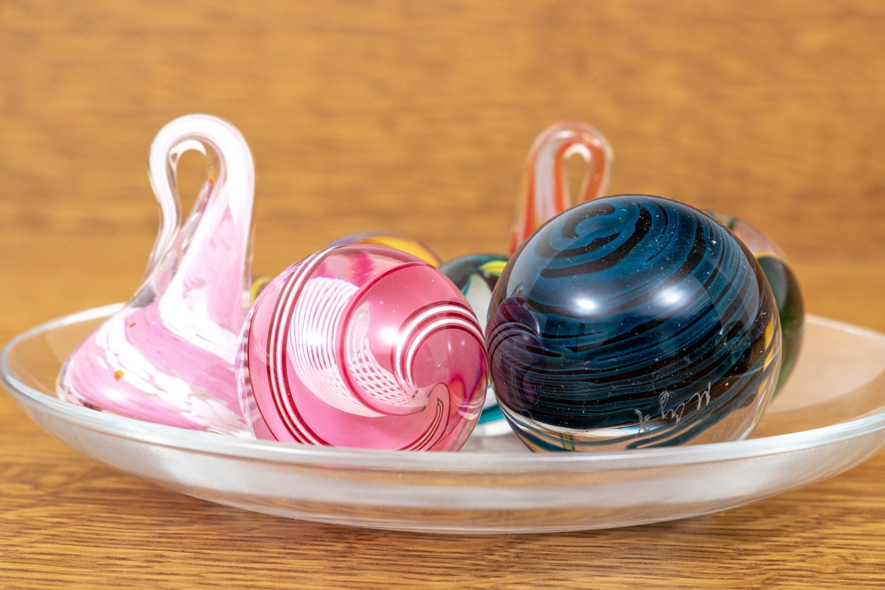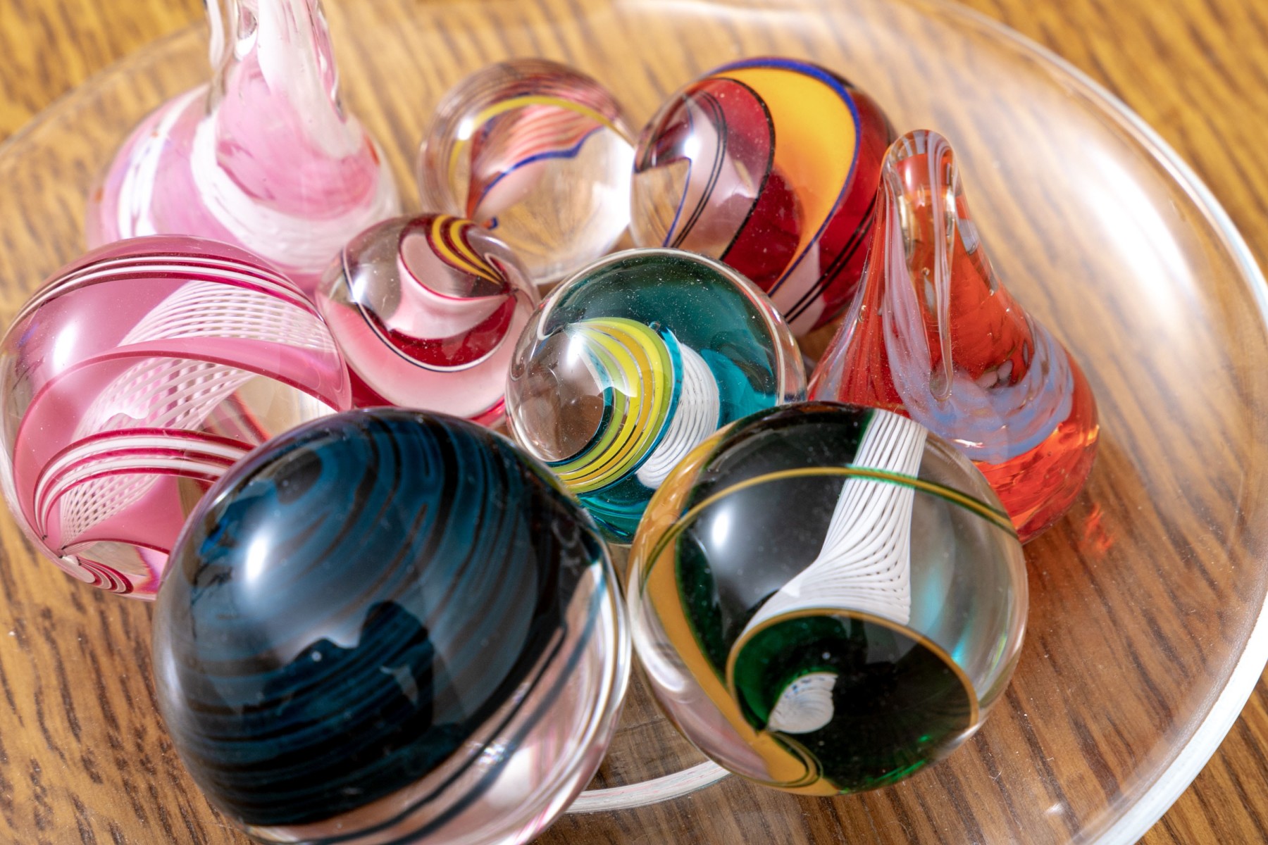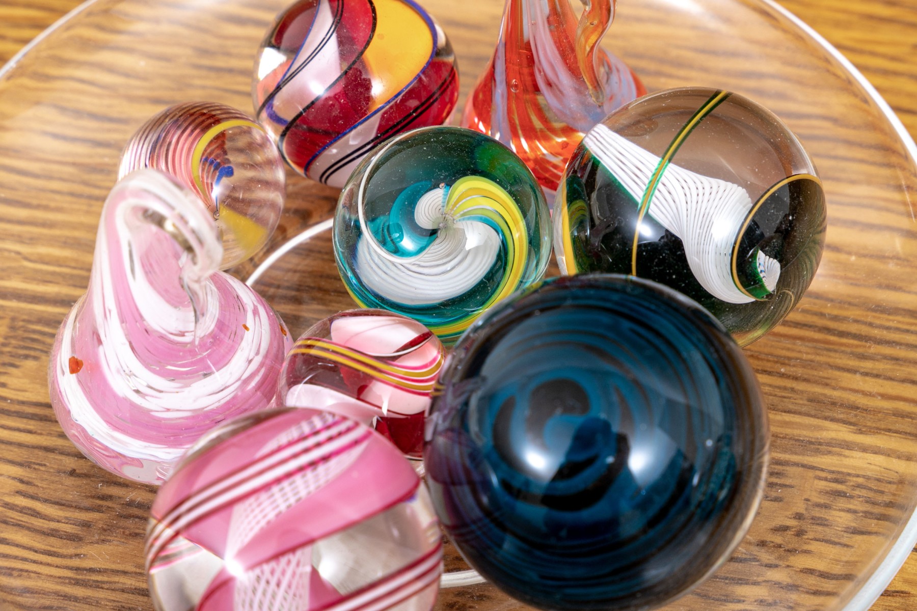 Also included are 7 marbles or spheres including one with inclusions. Two Hershey-kiss form art glass pieces and presented on an Arc France saucer.