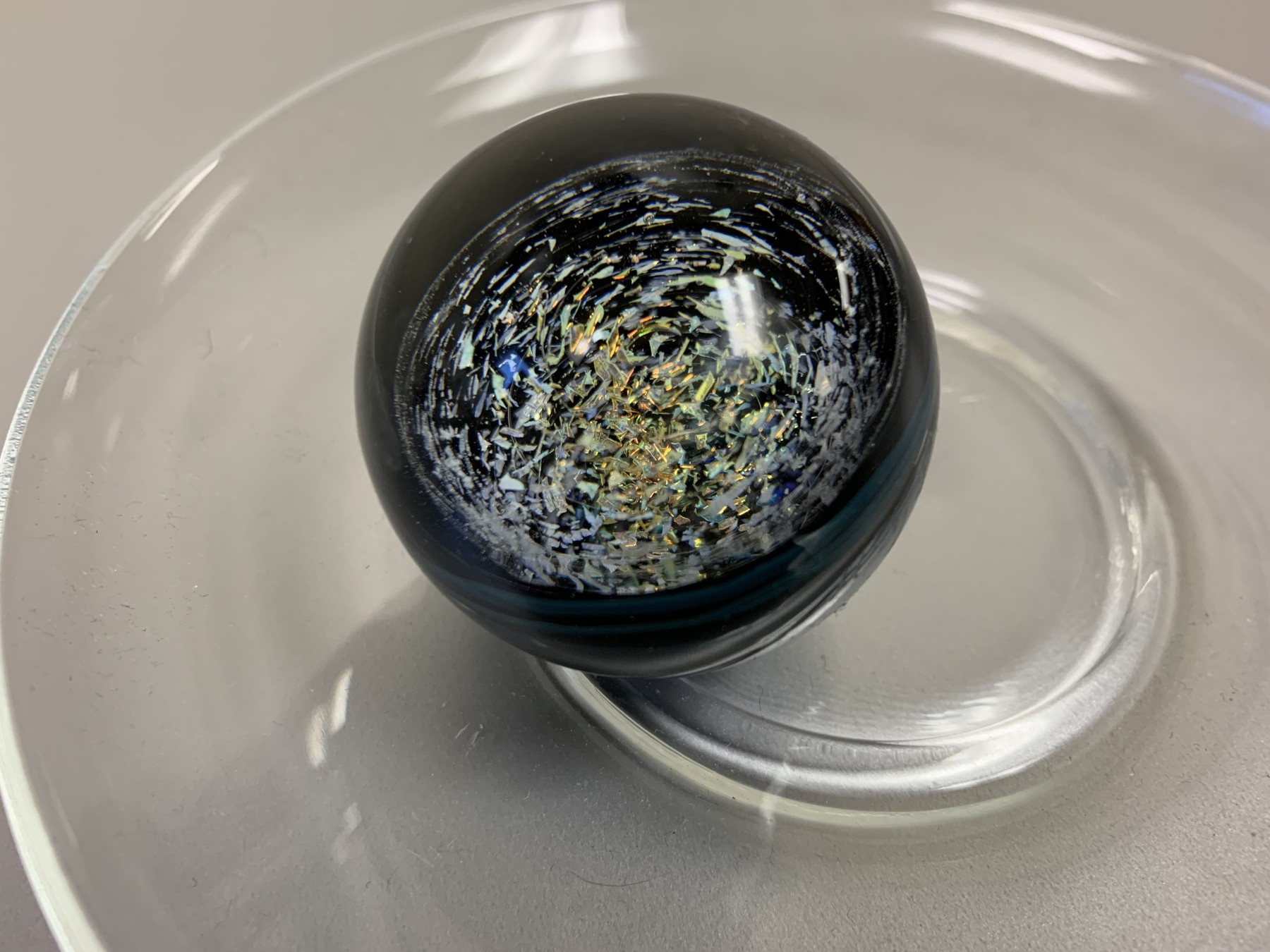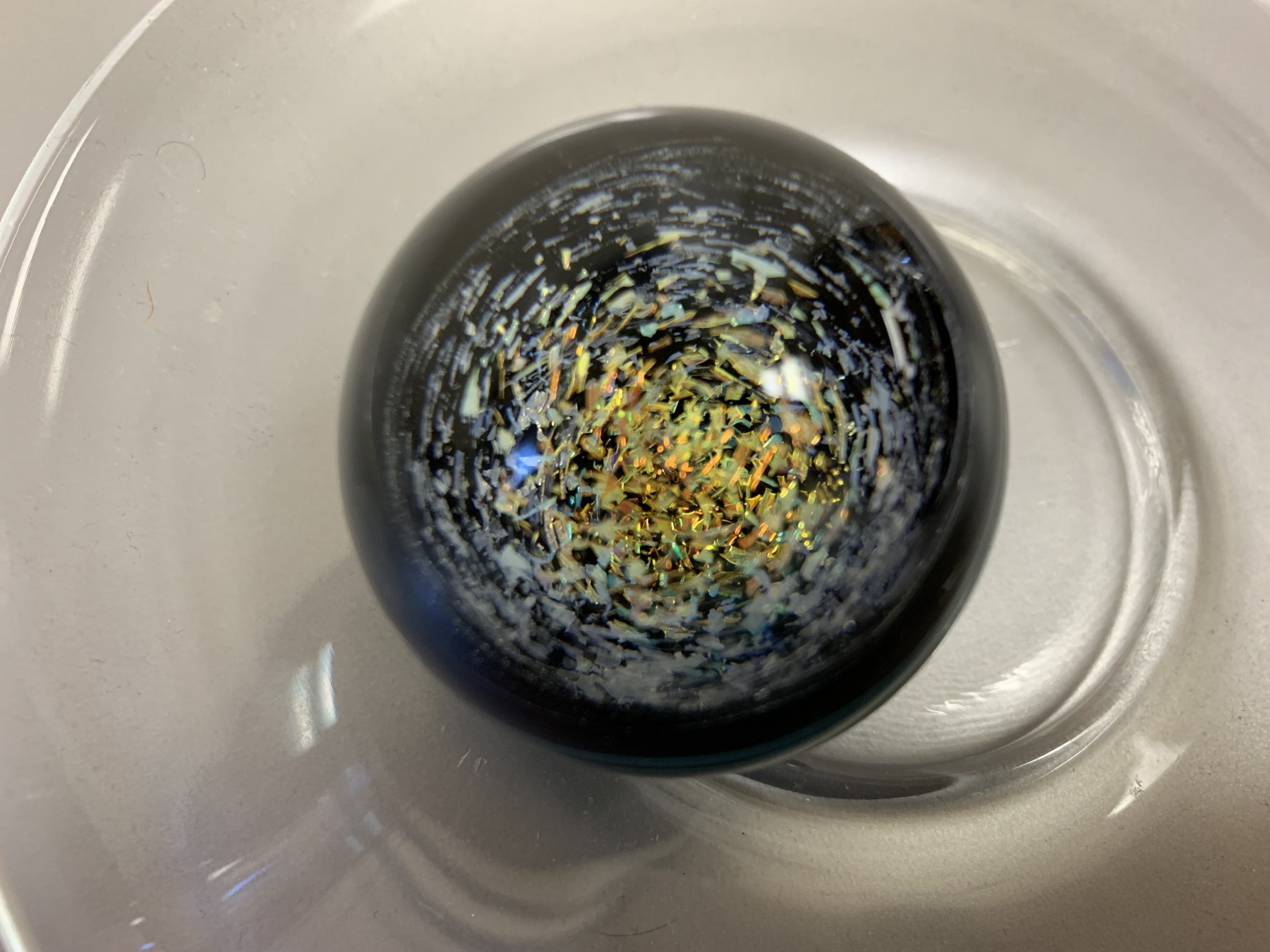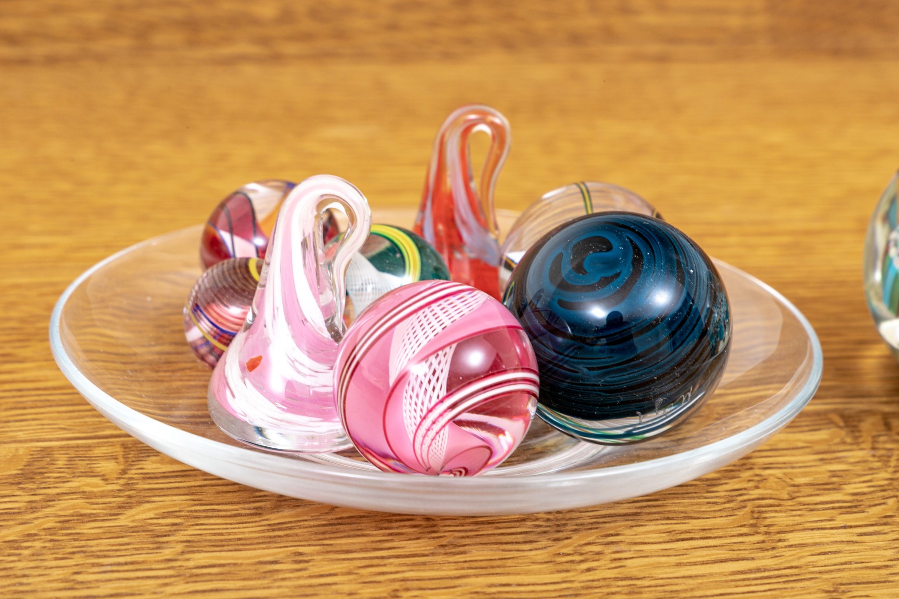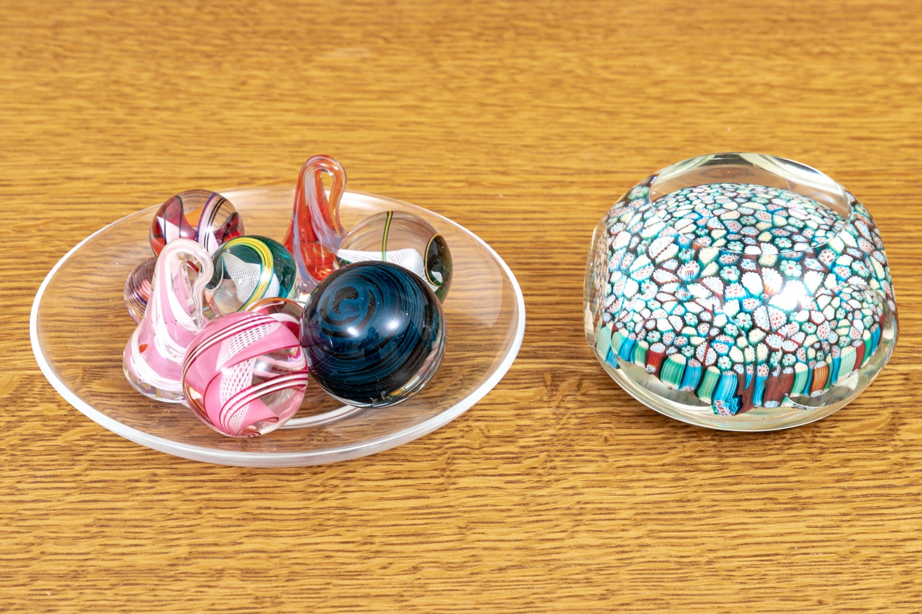 Also included are 7 marbles or spheres including one with inclusions. Two Hershey-kiss form art glass pieces and presented on an Arc France saucer.