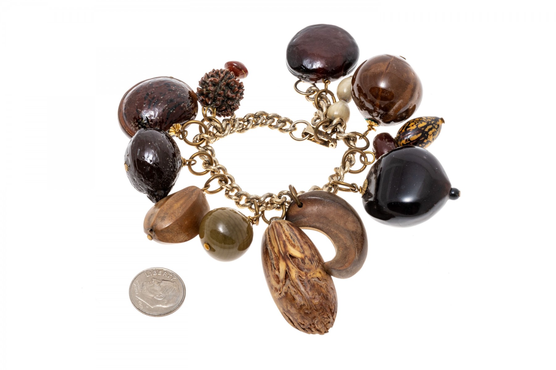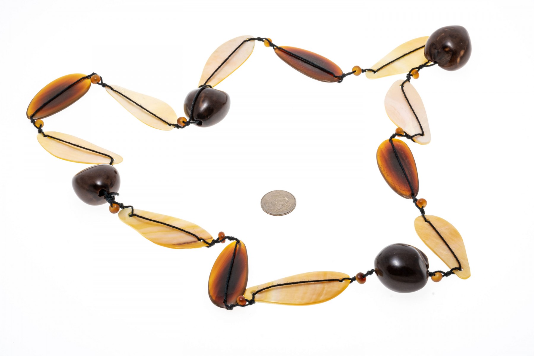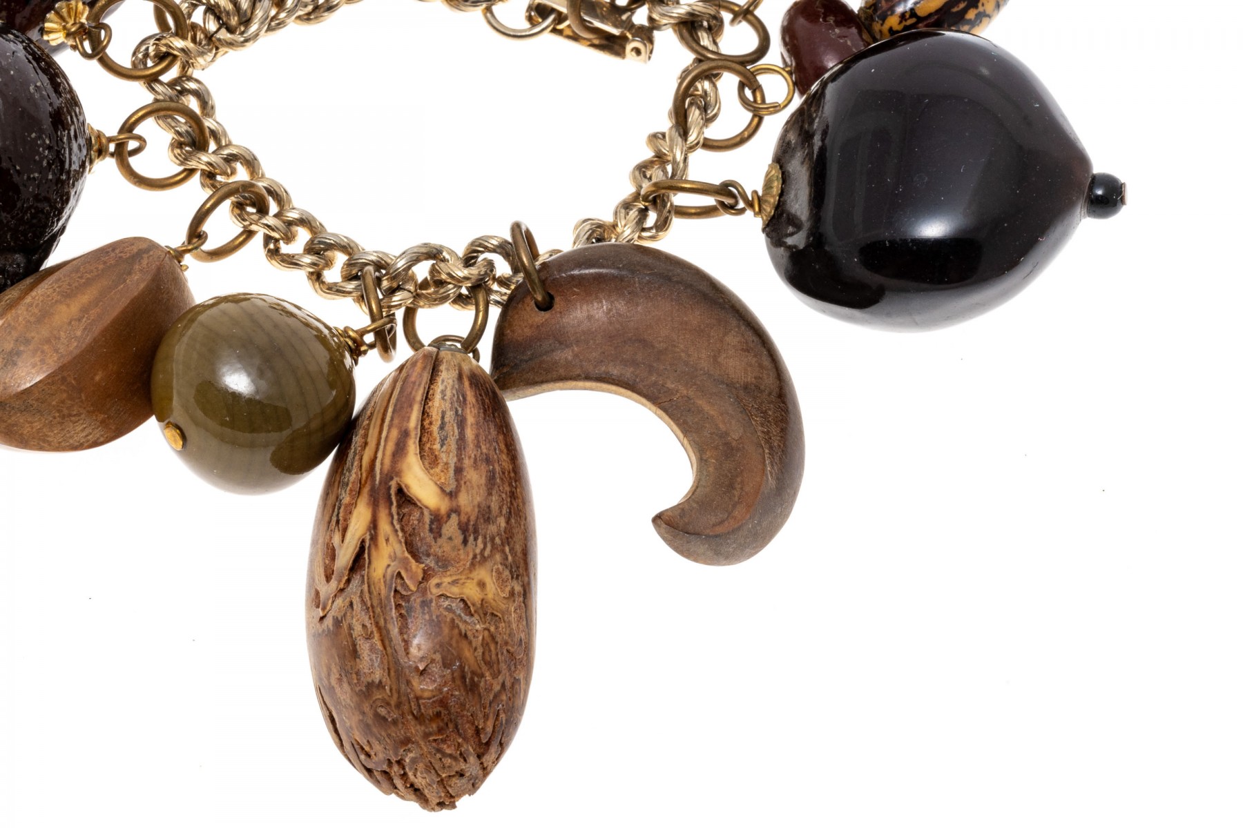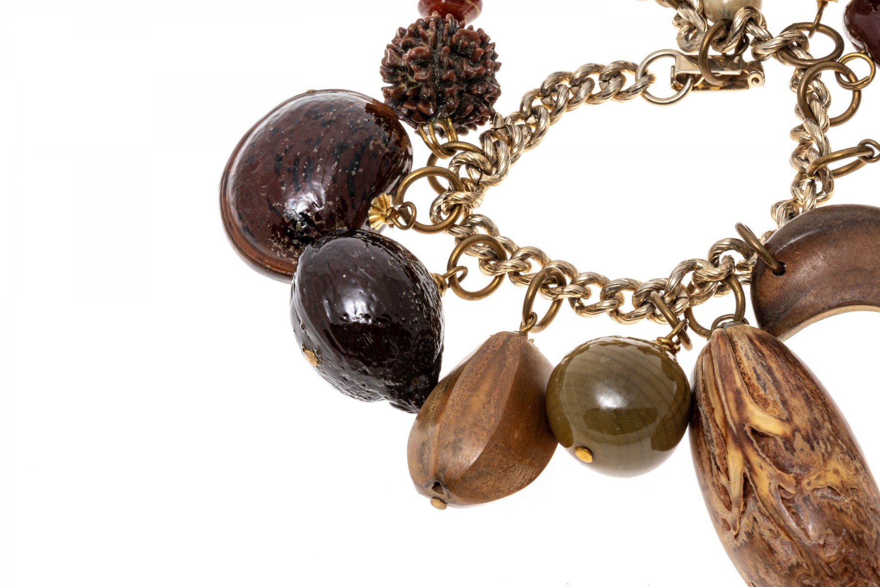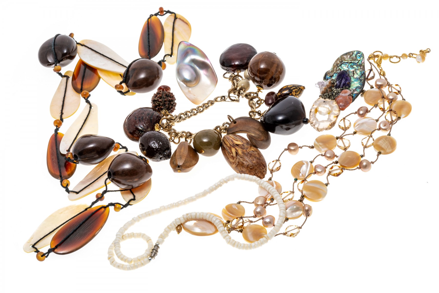 Fashion jewelry. Three necklaces, charm bracelet with wood charms, cultured blister mother of pearl brooch and a abalone and quartz brooch, wood, seeds and nuts