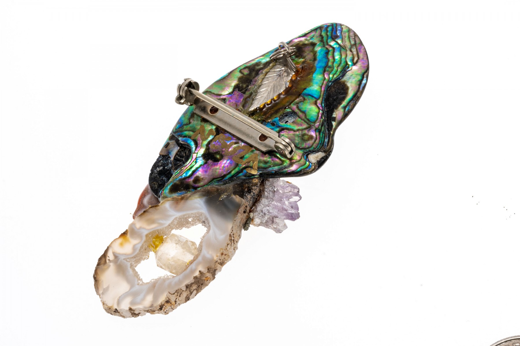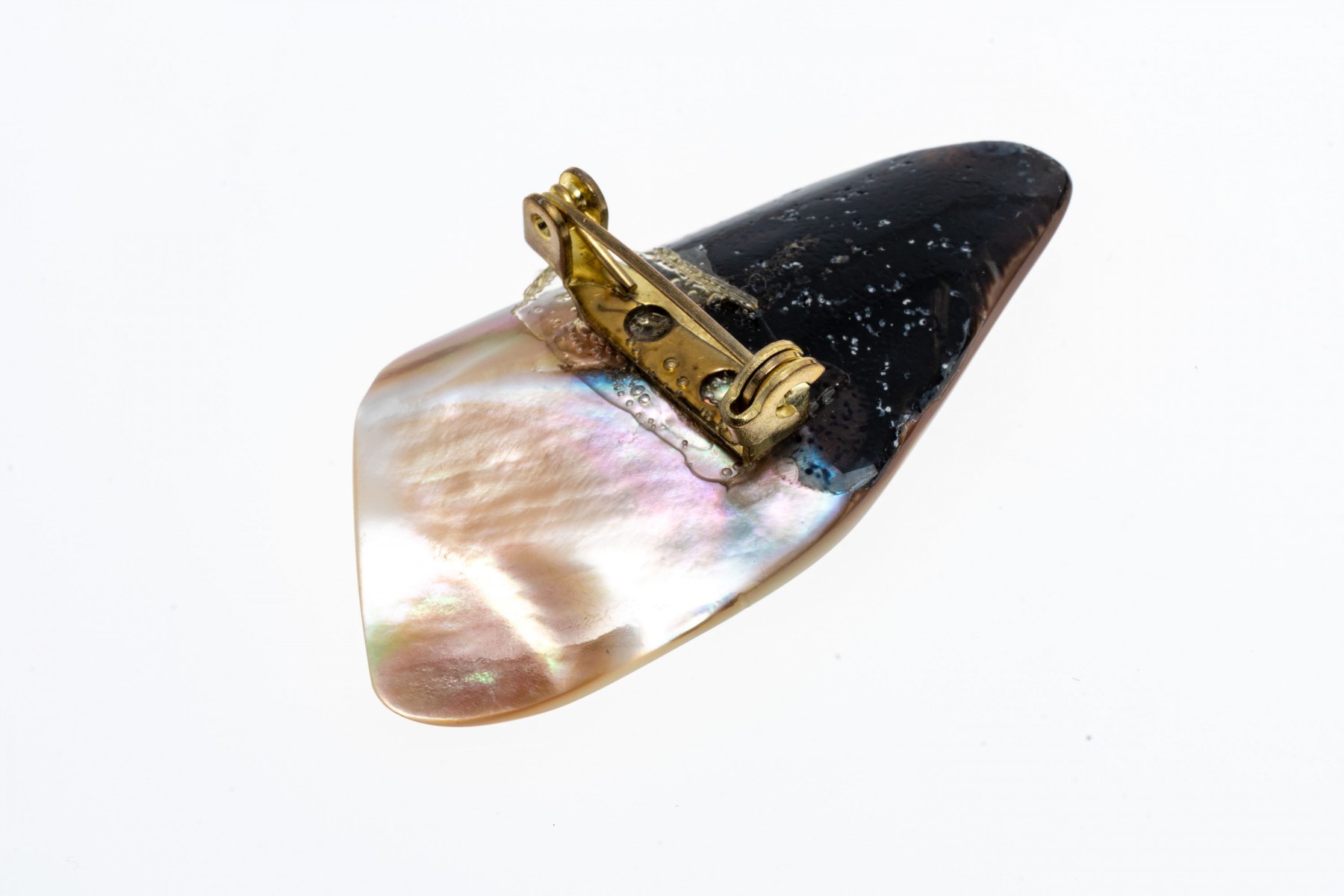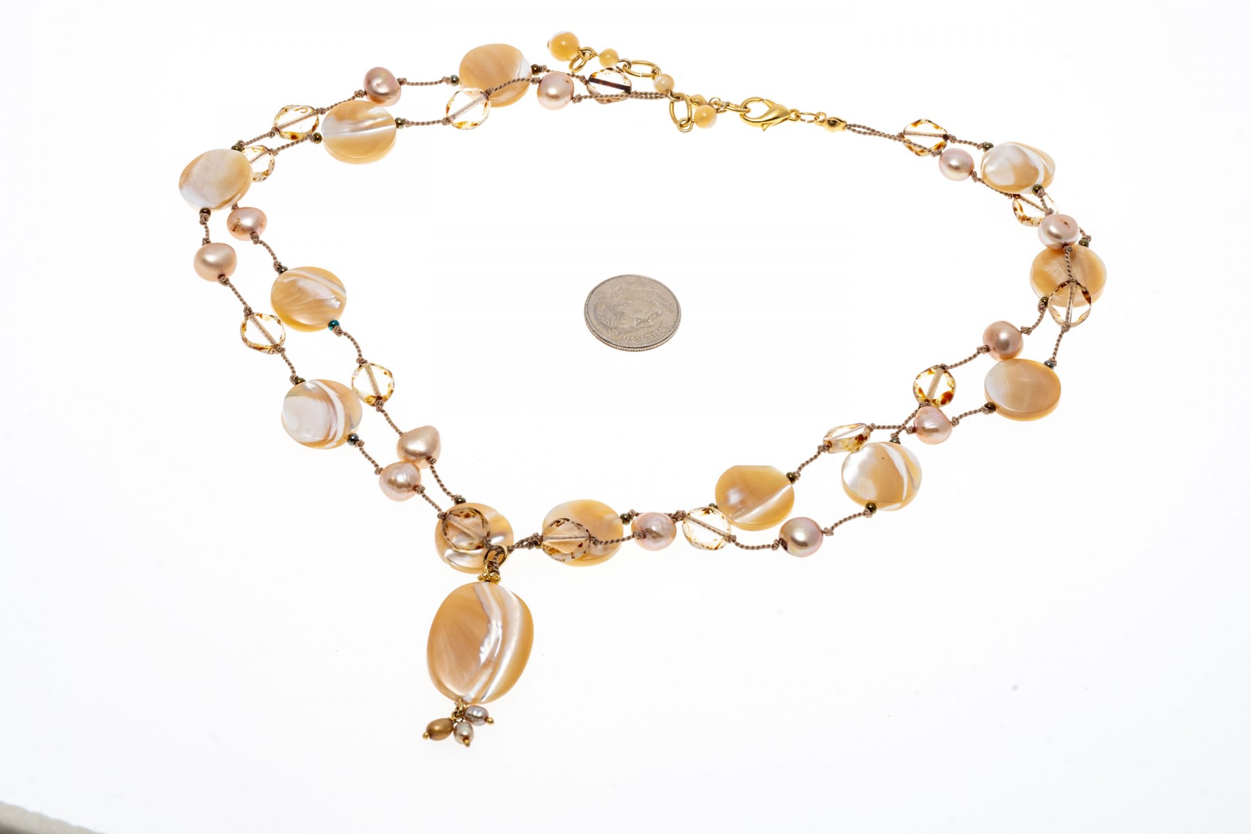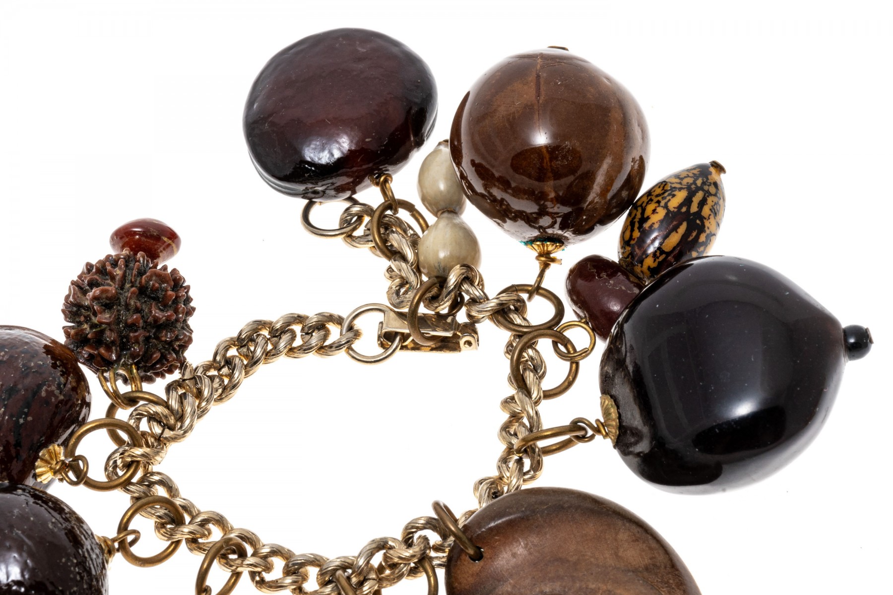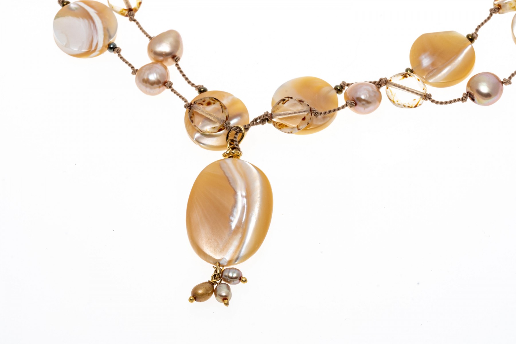 Fashion jewelry. Three necklaces, charm bracelet with wood charms, cultured blister mother of pearl brooch and a abalone and quartz brooch, wood, seeds and nuts