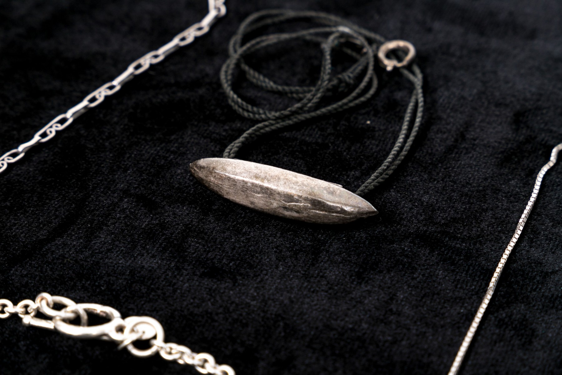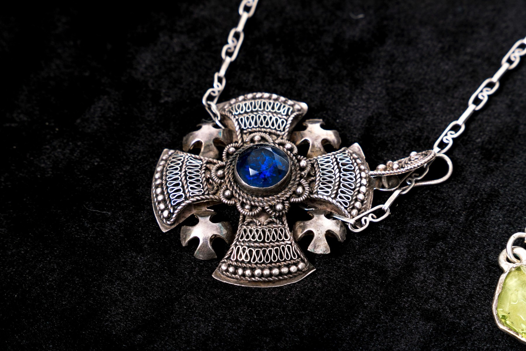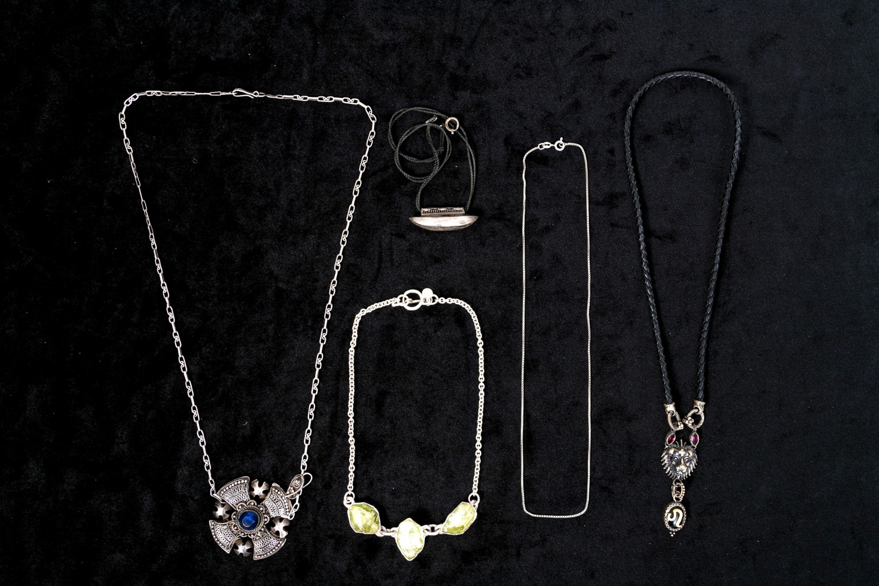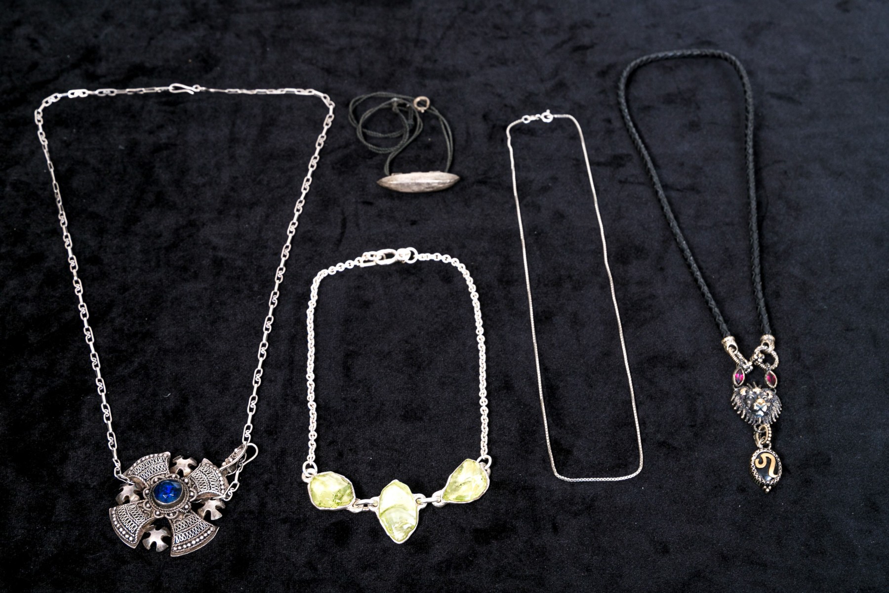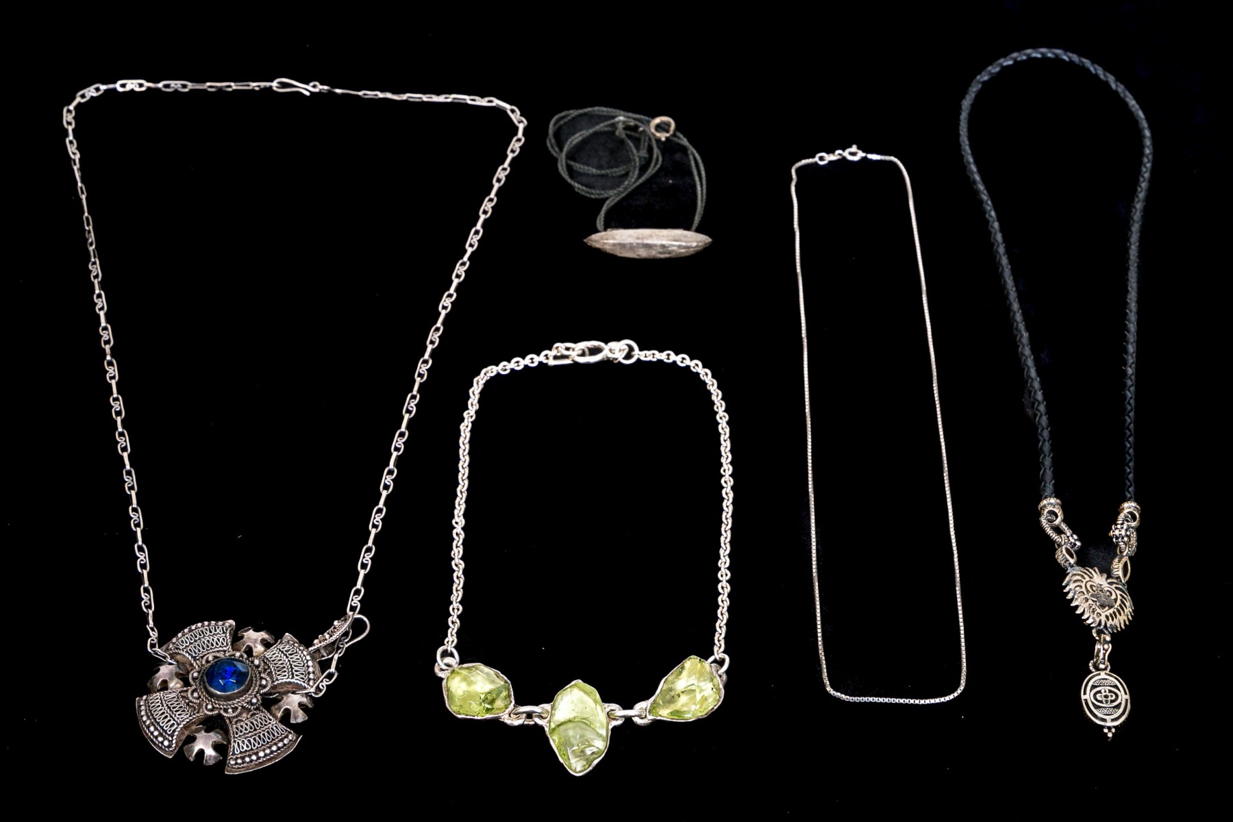 A group of sterling silver chain and pendant necklaces. Two necklaces have cords with sterling pendants. The others three are sterling chains, one with pendant and another with green glass and the last is a box style chain. hook, toggle and spring ring clasps.