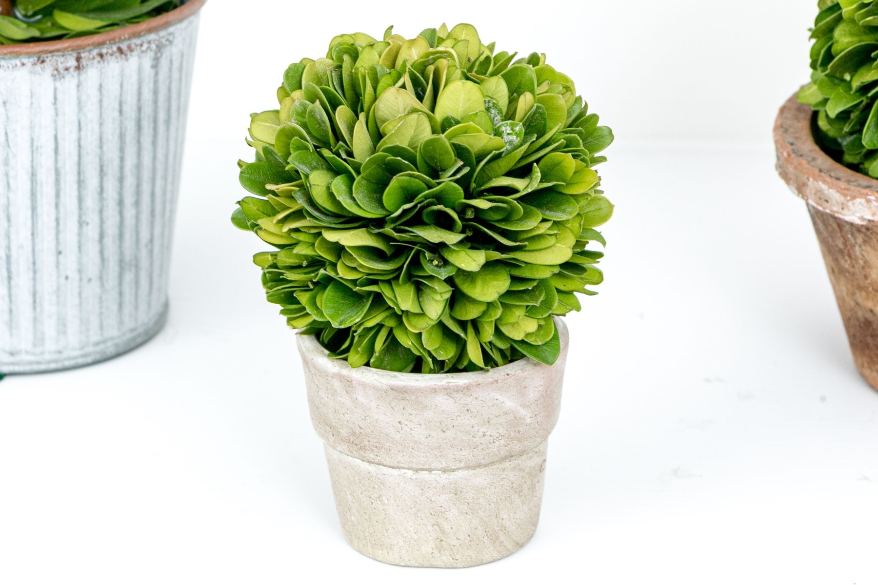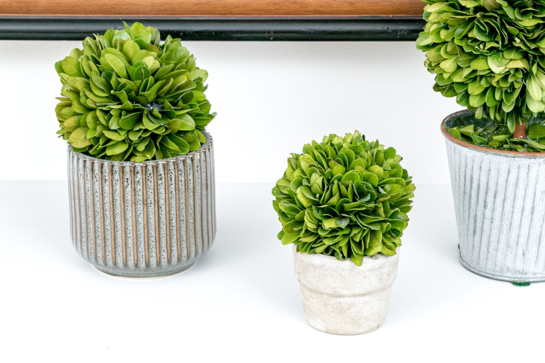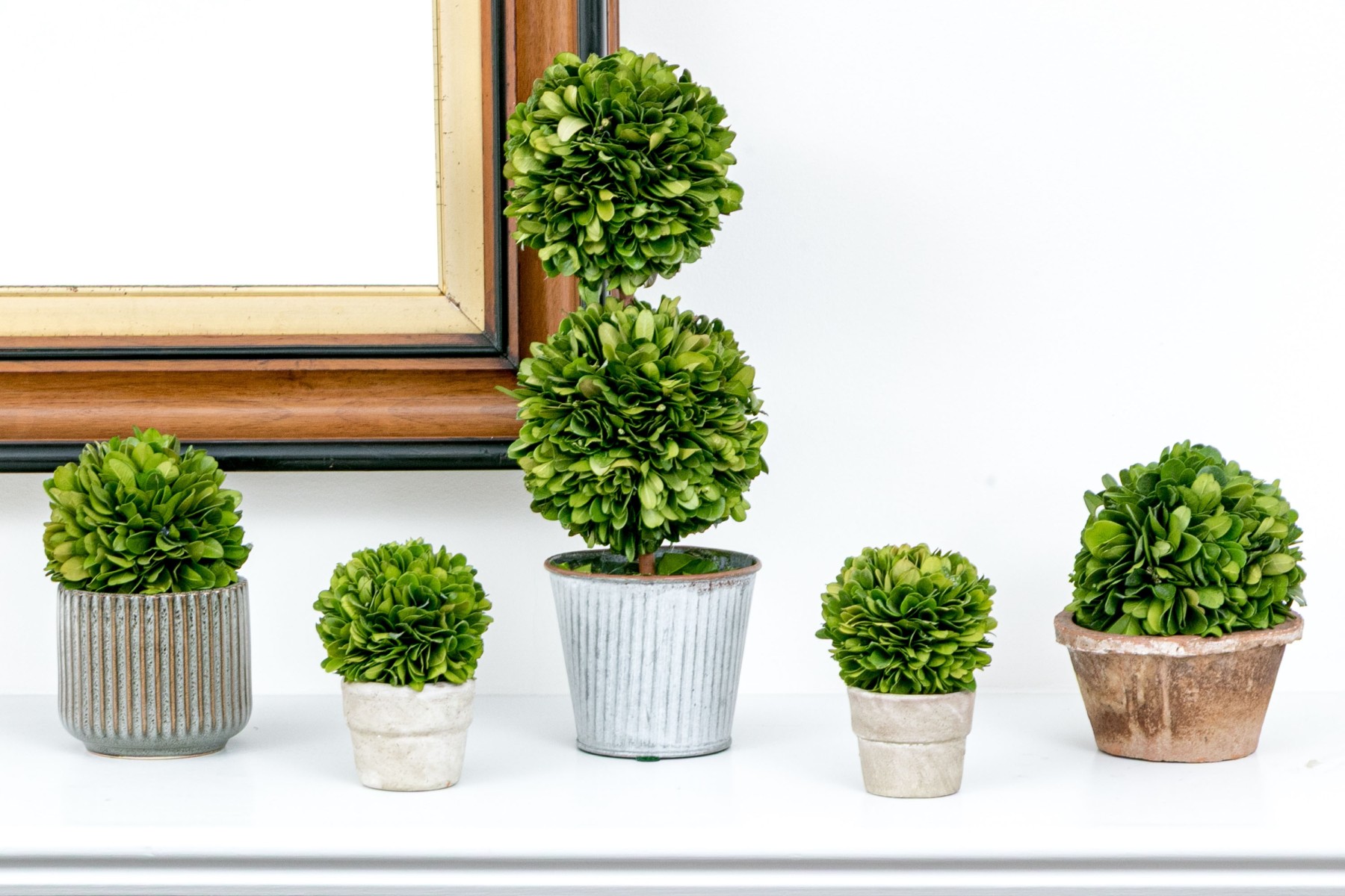 An excellent group of five preserved boxwood topiaries in a variety of planters, perfect for adding an enduring touch of refreshing greenery to any surface.