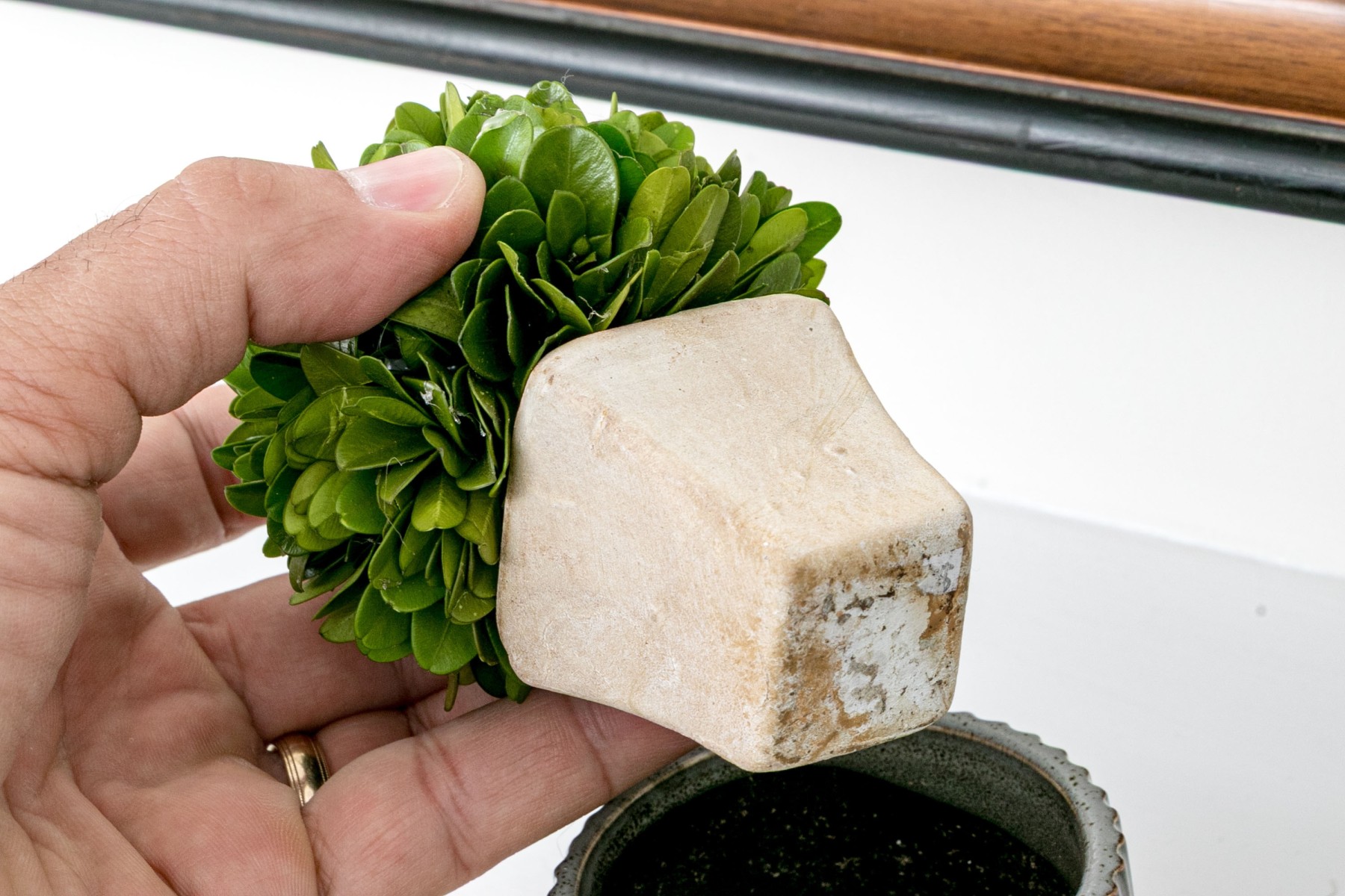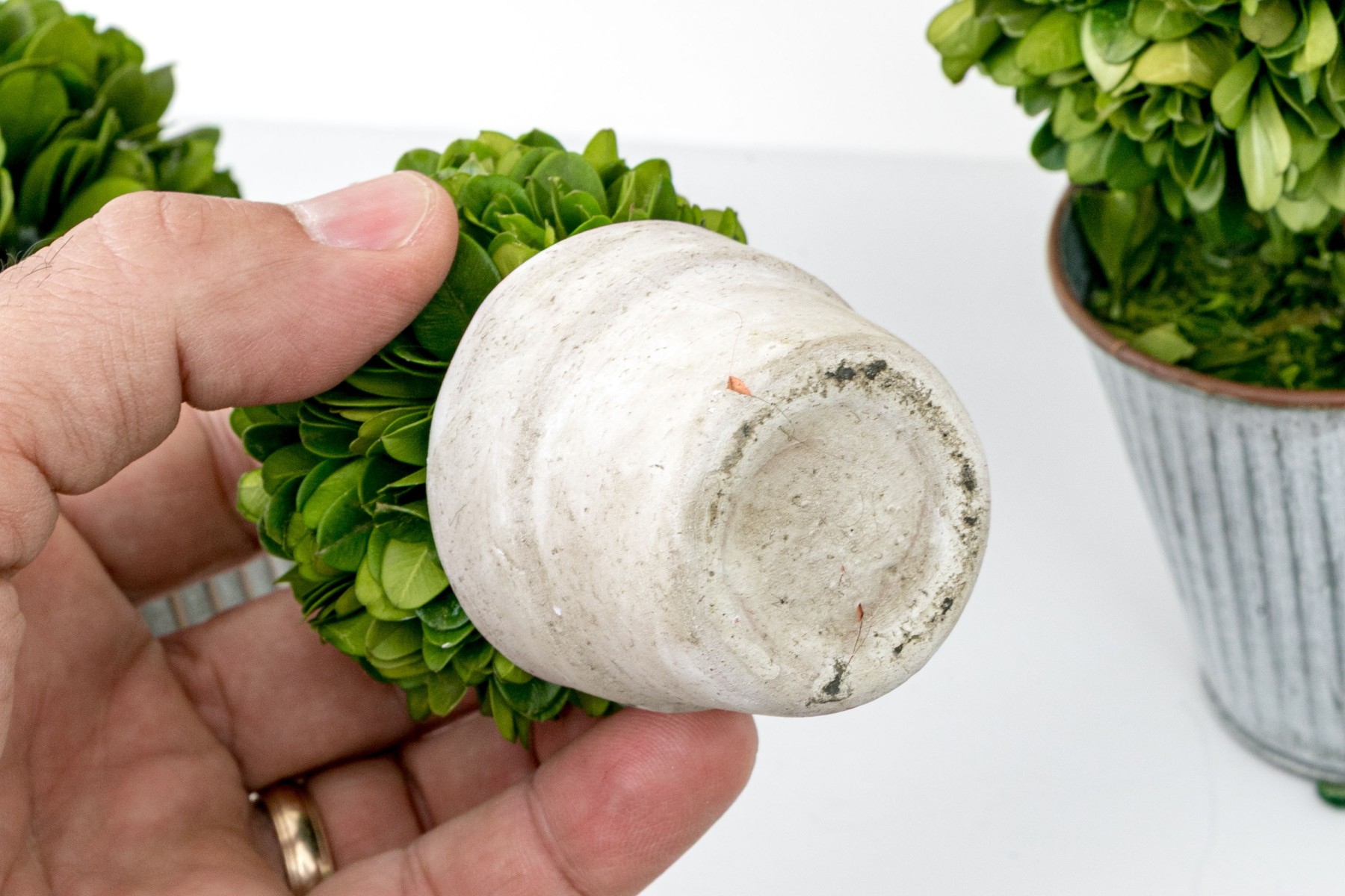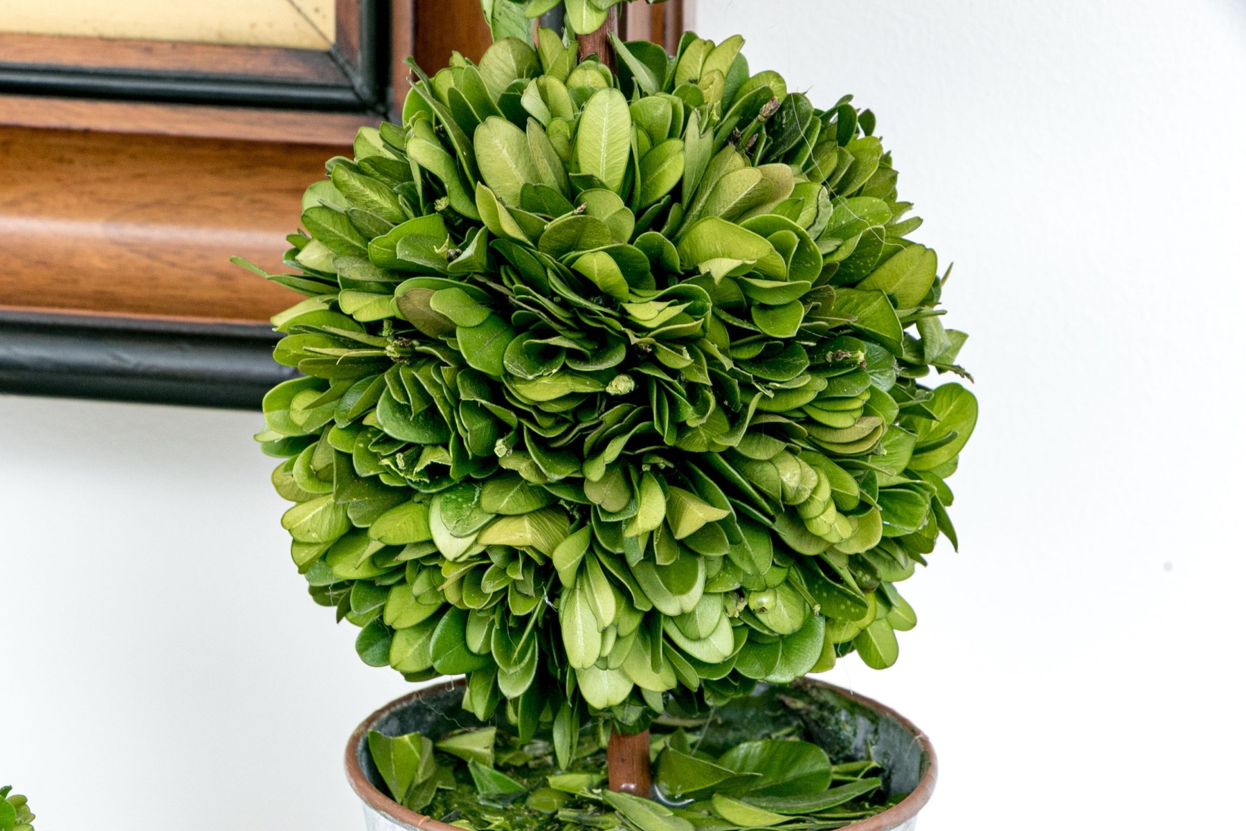 An excellent group of five preserved boxwood topiaries in a variety of planters, perfect for adding an enduring touch of refreshing greenery to any surface.