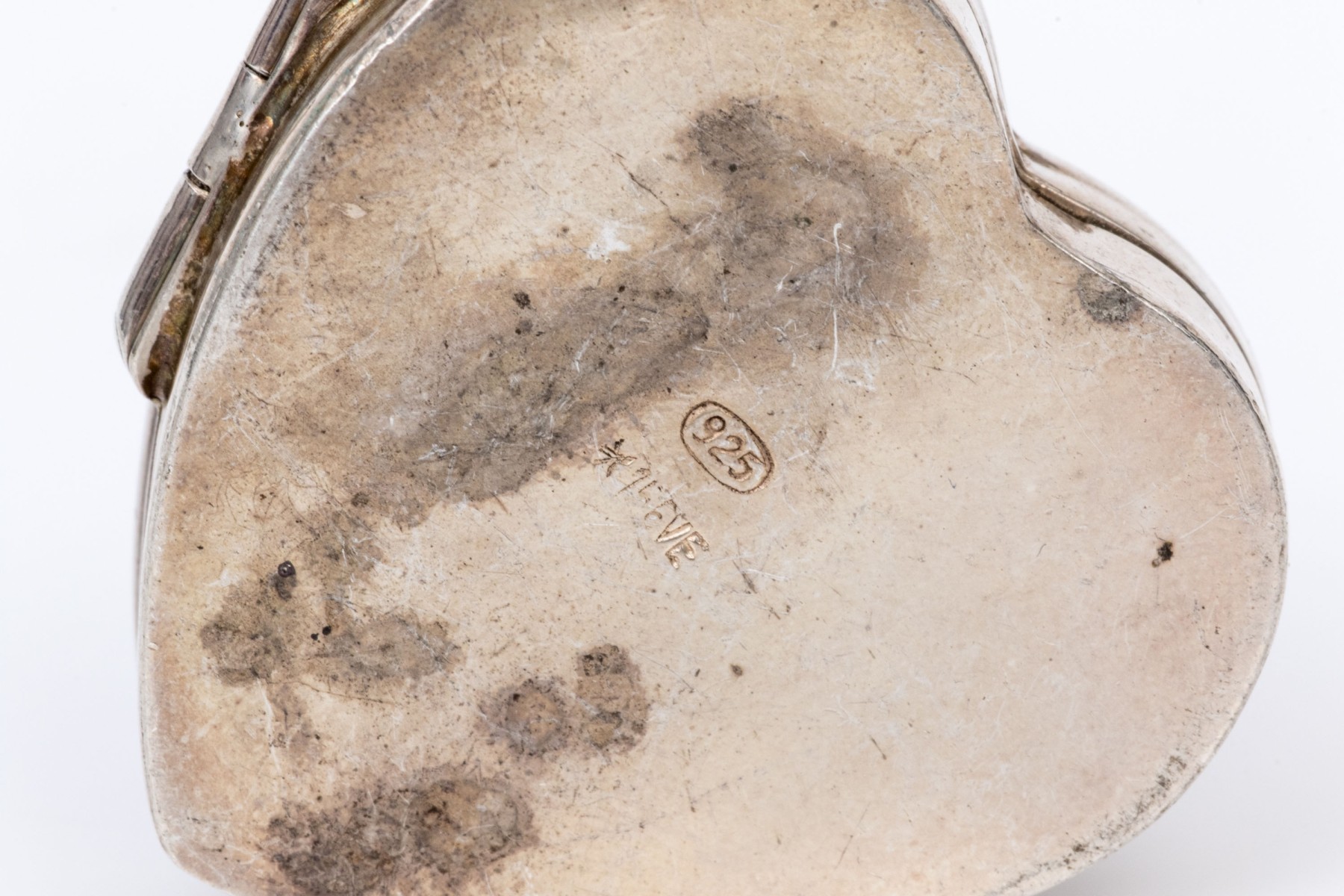 a sterling silver heart shaped pill box with a raised rose on the hinged lid